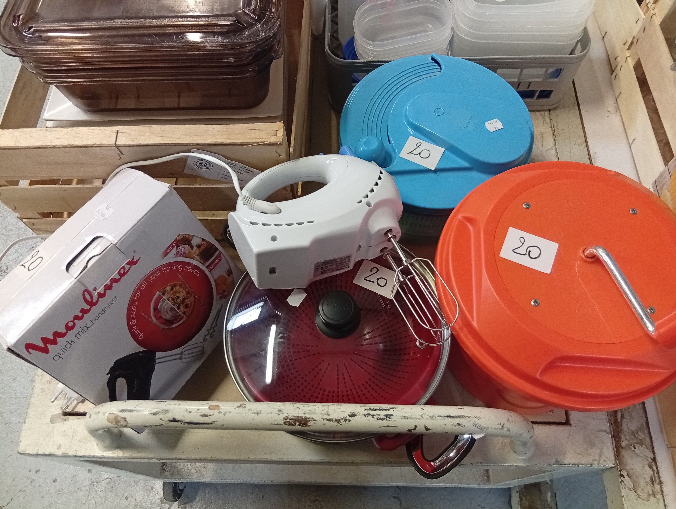 Lot de matériel de cuisine comprenant : faitout, égouttoir, 2 essoreuses à salade, 2 batteurs électriques