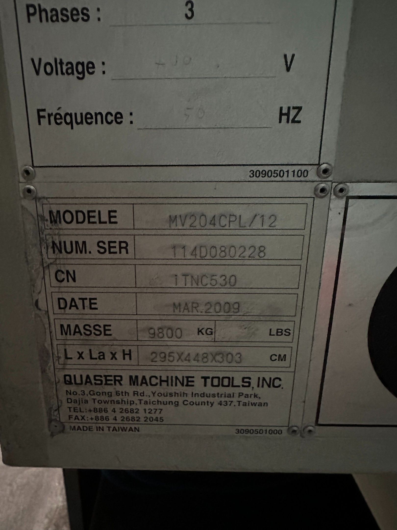 Fraiseuse QUASER MV204 CPL, Cde arrosage central, chargeur 48 outils, n° 114D080228, année 2009, avec classeur métallique contenant outillage, groupe lubrifiant, convoyeur de copeaux, commande HEIDAIN. VENDU EN L'ETAT, SANS GARANTIES. TVA RECUPERABLE. Visite sur RDV. Enlèvements :– Gros matériel uniquement sur rendez-vous (tel: 02.33.67.09.96) et au plus tard le 12 décembre 2025. A défaut une pénalité de 150 € ht par jour de retard sera facturée. Photos non contractuelles