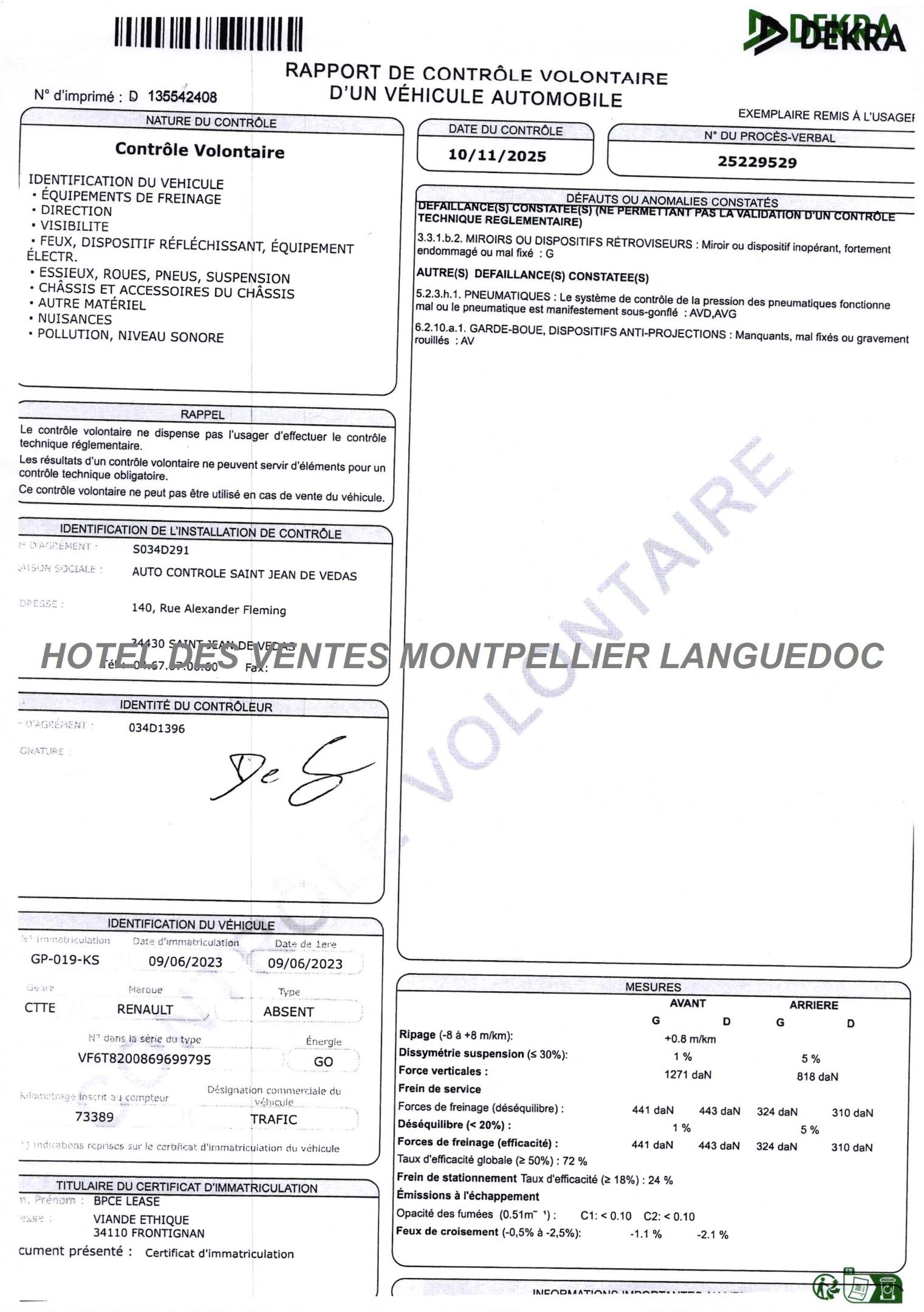 CTTE FG TD RENAULT Modéle : TRAFIC 3.0T 2.0 dCi 16V 130 cv Année : 2023 GP-019-KS Type constructeur : T82AFCY6U134X31000 N°de Série : VF6T8200869699795 Date de 1ere mise en service 09/06/2023 Energie : GO Puissance : 7 CV Kilomètres Compteur non garantis : 79389 Contrôle Technique : Oui TVA récupérable Avec Carte grise originale