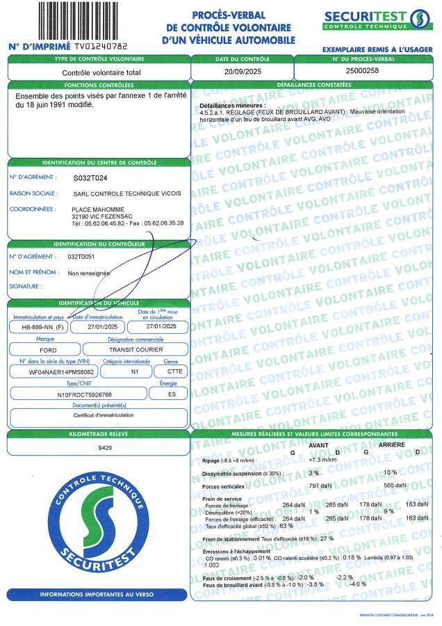 FORD TRANSIT COURIER ECO BOOST 100 TREND - Genre : CTTE - Carrosserie : FOURGON - Energie : ES - Kilométrage compteur : 9414 - 1ere M.E.C : 27/01/2025 - Puissance : 6 - Tva récupérable - Observations : Enlèvements impératifs des lots le mercredi 26 NOVEMBRE 2025 de 9h à 12h (ou à l'issue de la vente si les conditions de paiement sont remplies). - Pneus usé à 80 et 40%. Vendu avec contrôle technique. - Equipements : attelage