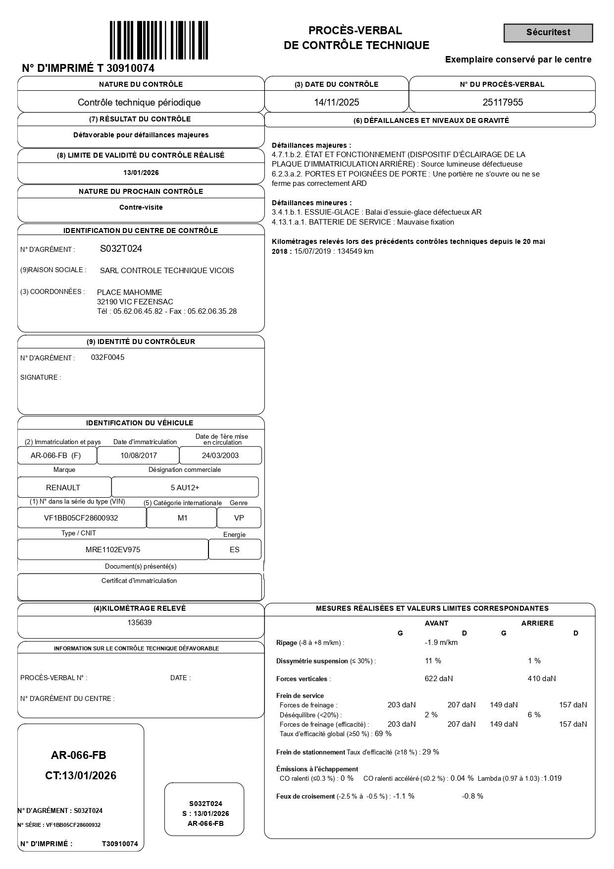 RENAULT CLIO 16V - Genre : VP - Carrosserie : CI - Energie : ES - Kilométrage compteur : 135638 - 1ere M.E.C : 24/03/2003 - Puissance : 5 - Type mines : MRE1102EV975 - 5 portes. batterie absente ; pneus usés à 70%. non utilisée depuis 4 ans - Equipements : attelage ; avec contrôle technique. Batterie absente. Enlèvements impératifs des lots le mercredi 26 NOVEMBRE 2025 de 9h à 12h (ou à l'issue de la vente si les conditions de paiement sont remplies).