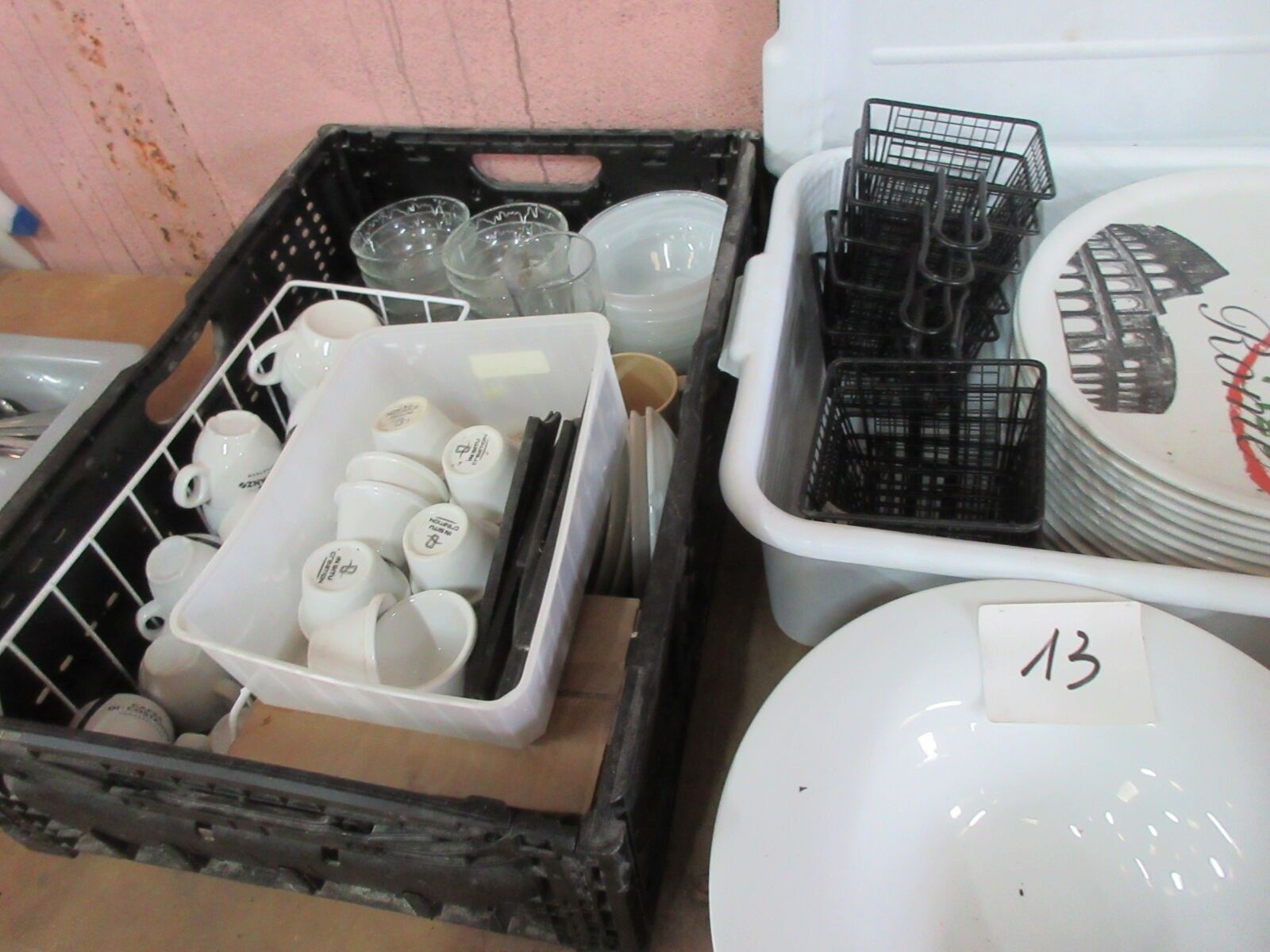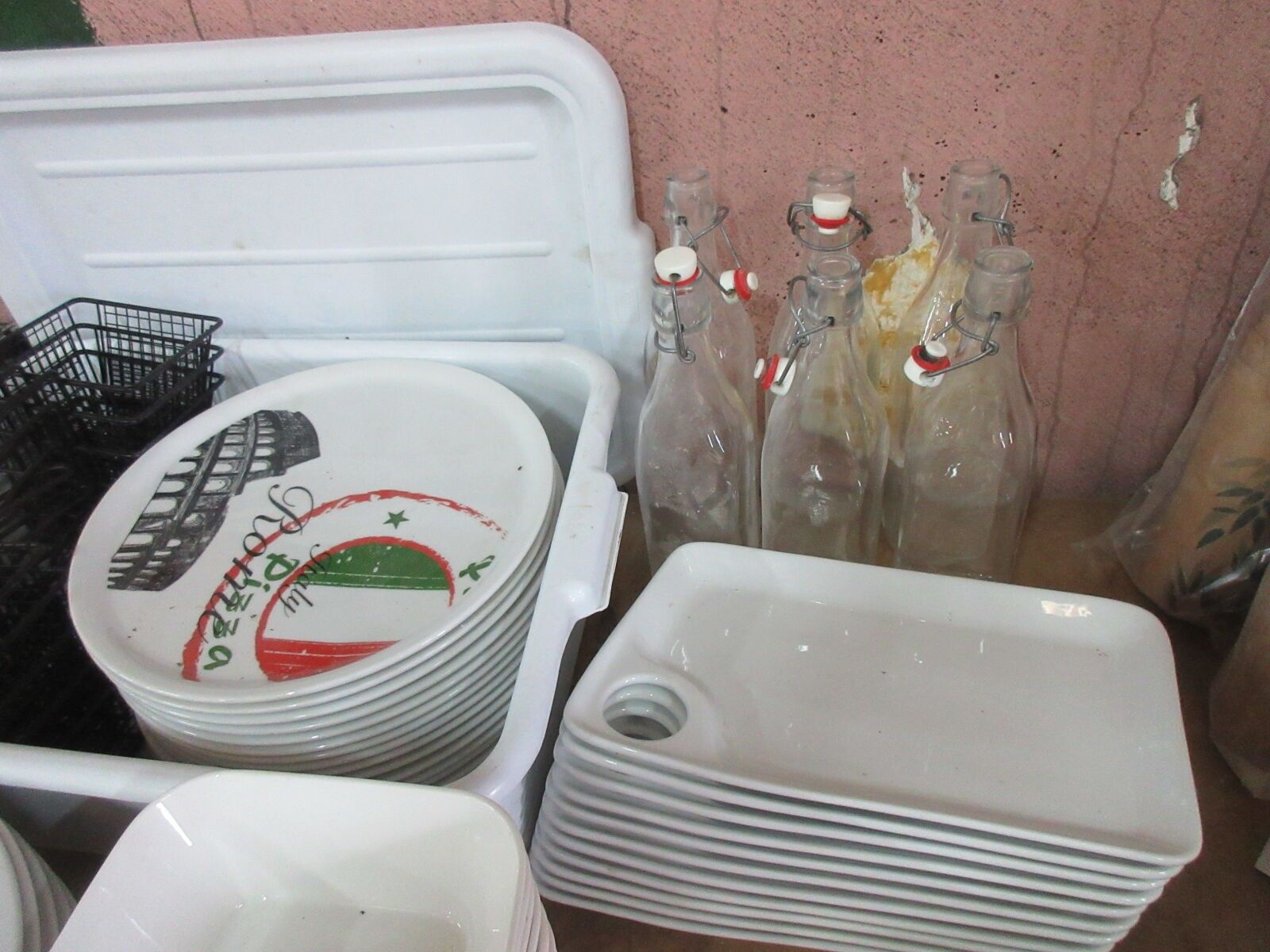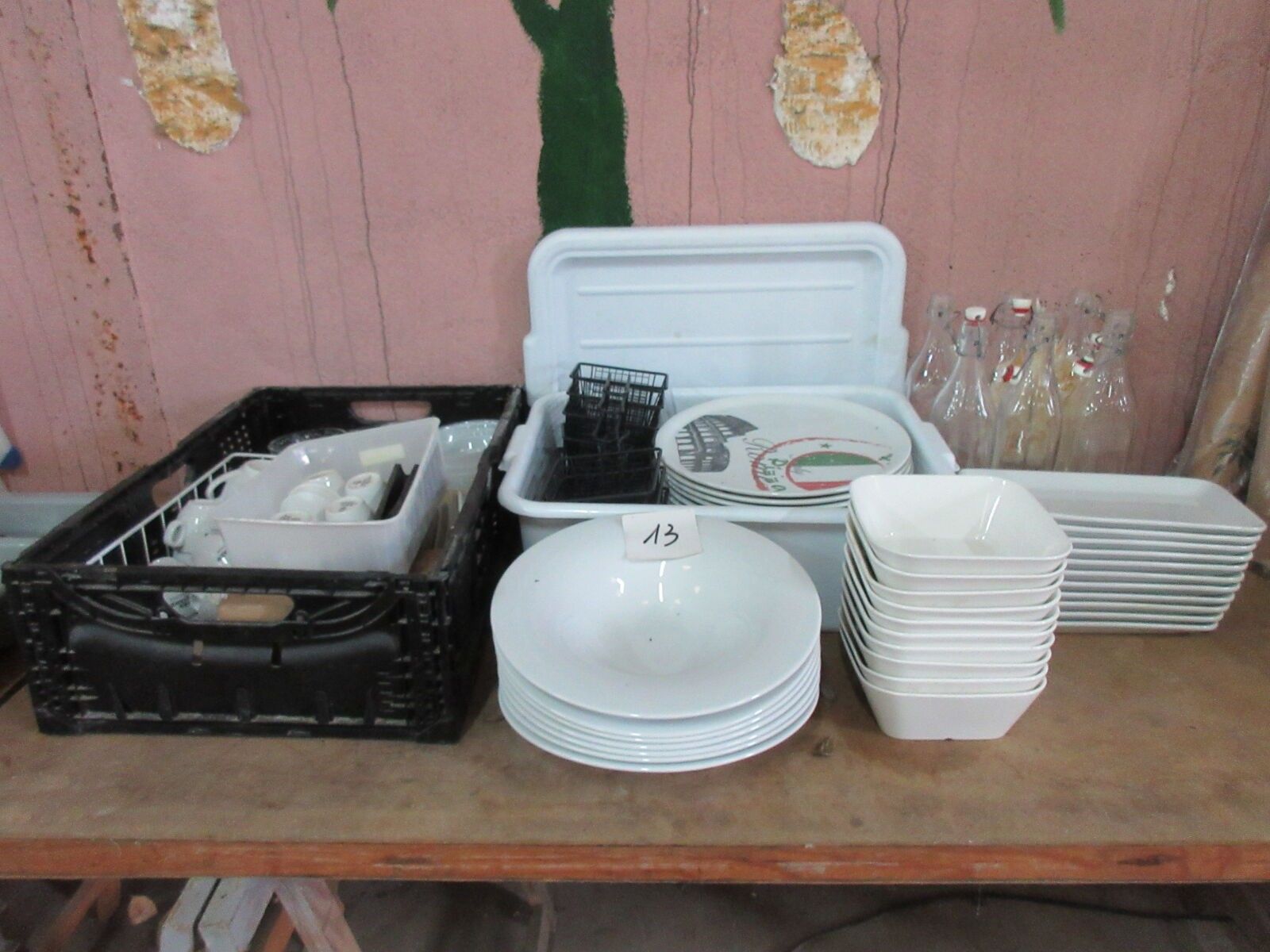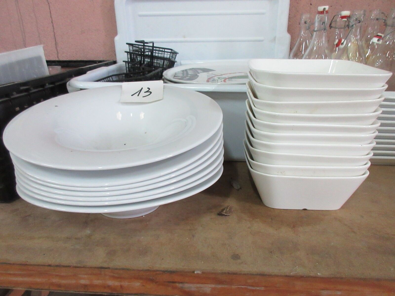 1 lot de vaisselle comprenant : 11 assiettes rectangles blanches, 10 bols carrés blancs, 18 assiettes à pizza, 1 lot de tasses à café DI COSTENZO, 10 petits paniers à frites, 6 bouteilles à eau