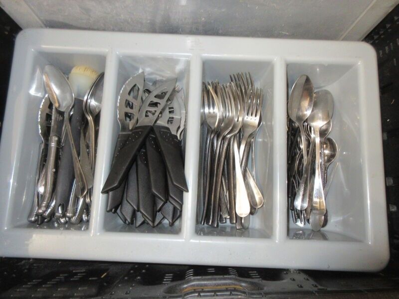 1 range-couvert en plastique gris de 4 compartiments avec cuillères, fourchettes, couteaux