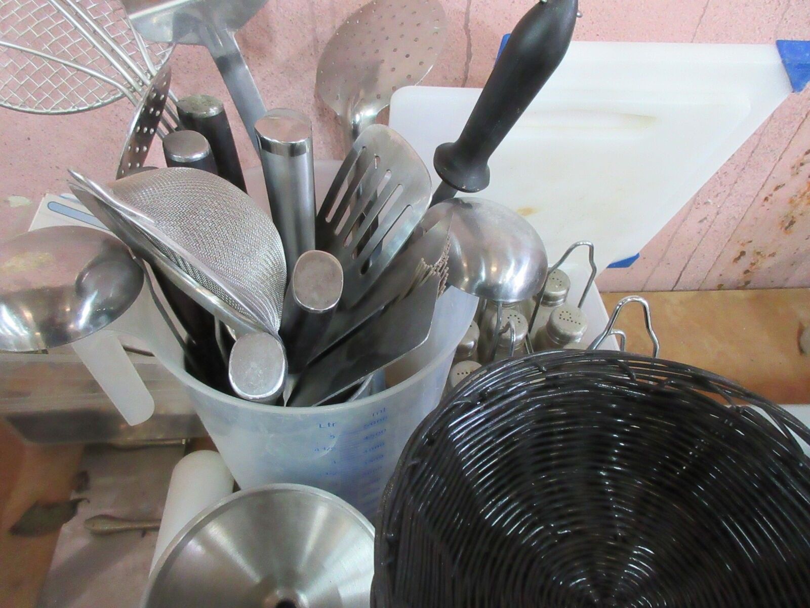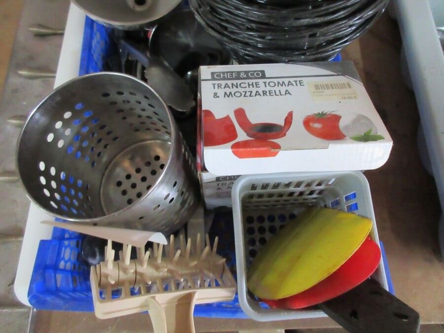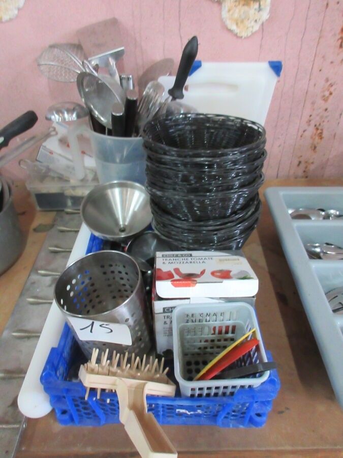 1 lot d'ustensiles de cuisine (couteau, louche, écumoire, passoire, planche à découper) ; 1 lot de salières ; 14 corbeilles à pain