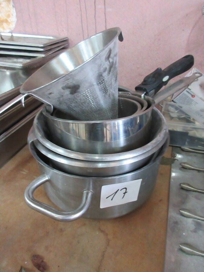 1 rondeau en aluminium, 3 casseroles en inox, 1 chinois , 2 culs de poule en inox