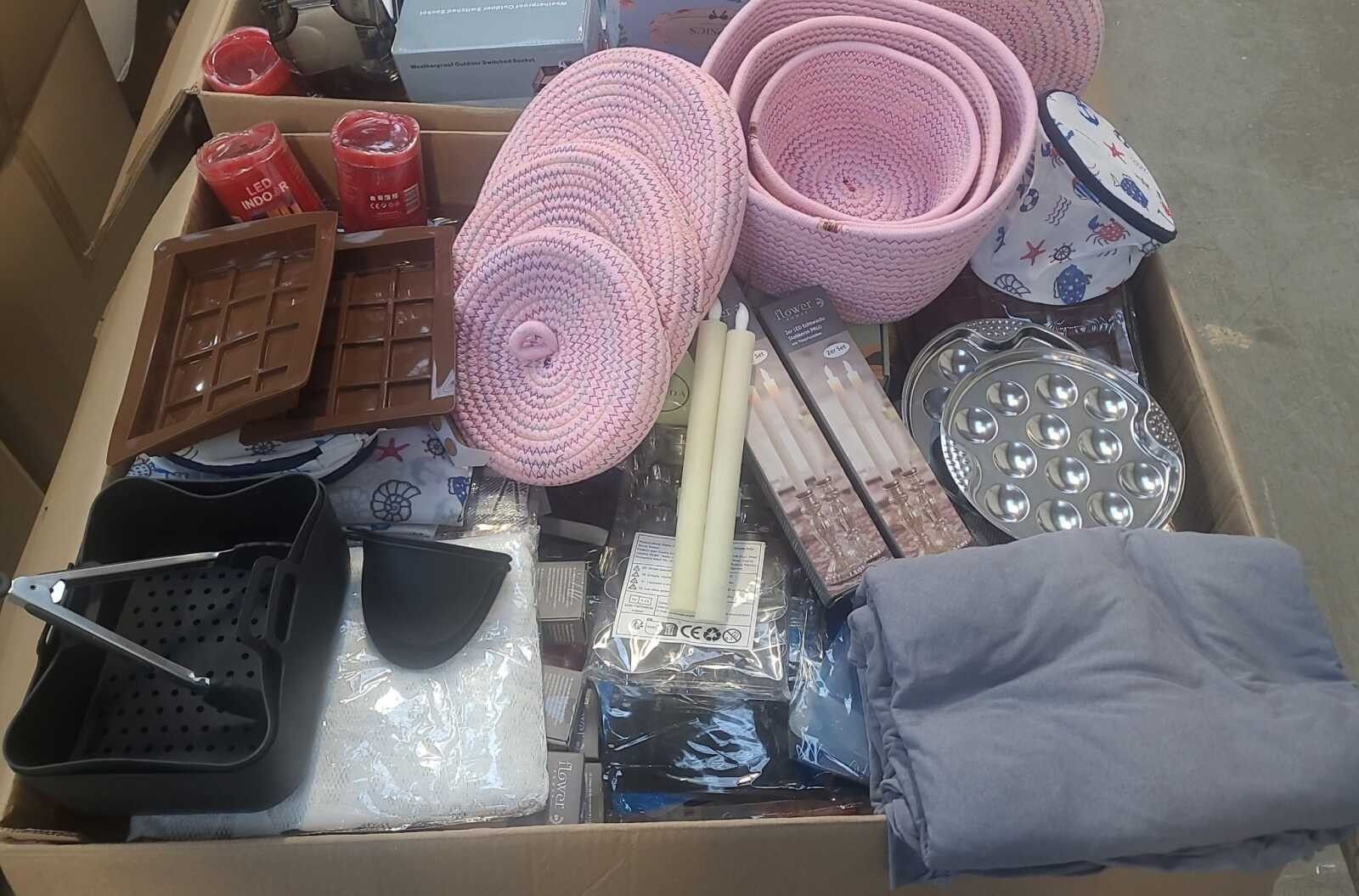 9880-331 / 2 cartons de 85 kg de mix (bougies LED, paniers avec couvercles, lunchbox, sac à jouets mesh, moule silicone, prise extérieure étanche, emportes-pièces, bougies parfumées, plaid, gourdes, accessoires airfryer, service à escargots) /// VENDU EN L'ÉTAT