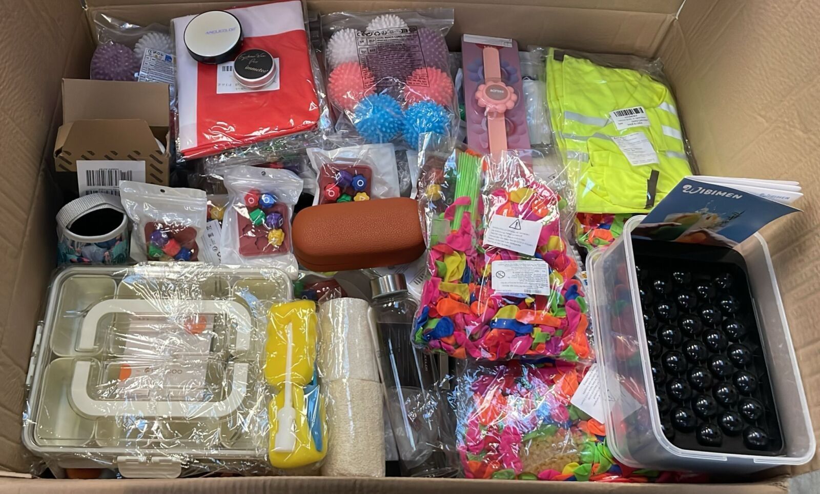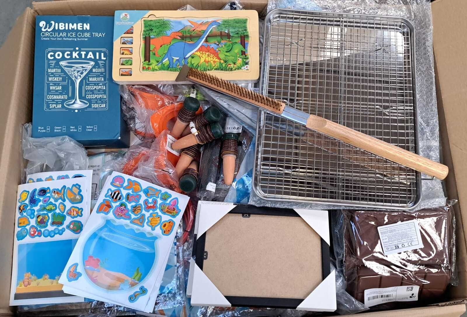 9880-335 / 2 cartons de 81 kg de mix (plaque à pâtisserie, système arrosage goutte à goutte céramique, autocollants, puzzle bois, cadre photo, brosse de four à pizza, moules à glaçons, bombes à eau, miroir de maquillage, éponge, bracelet enfant, boîte organisatrice, gourde, balles de lavage) /// VENDU EN L'ÉTAT