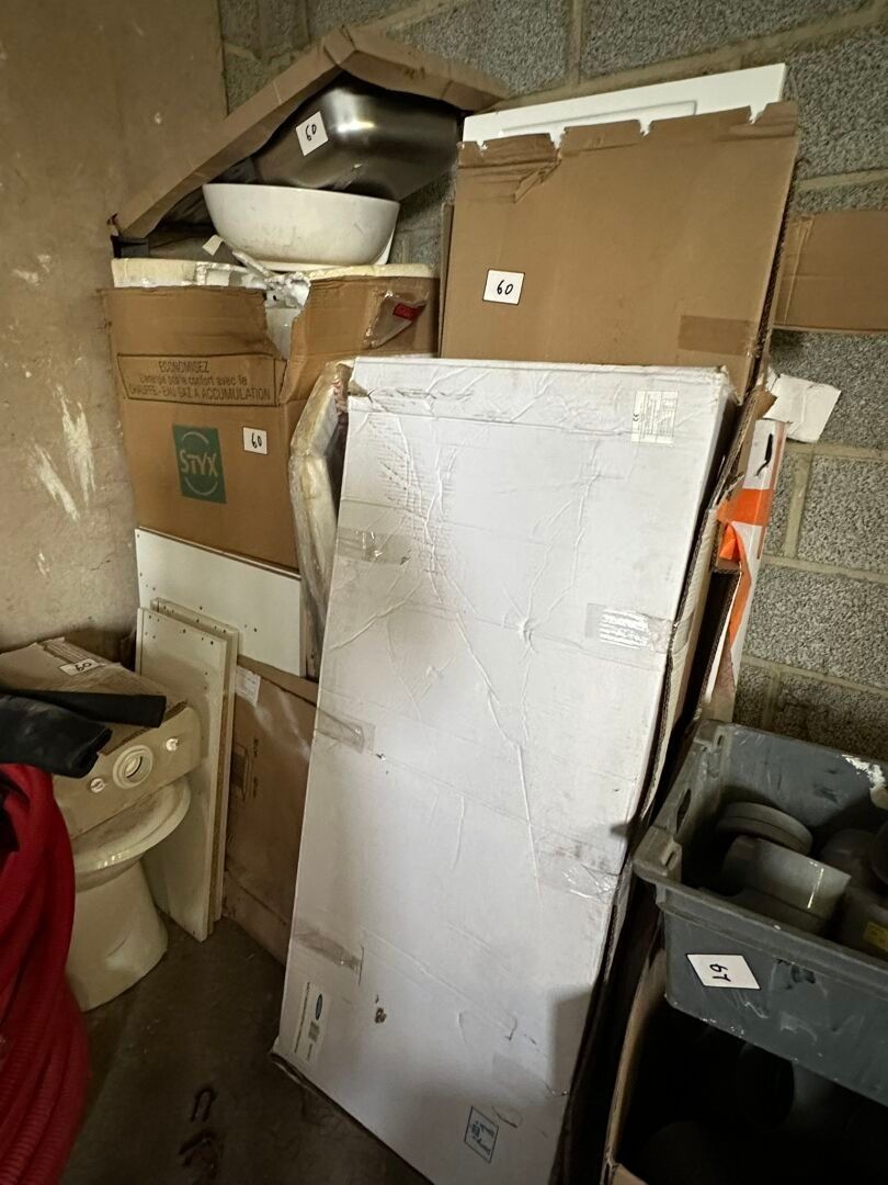Stock comprend un chauffe eau gaz STYX, un évier en inox un bac, trois doubles vasques en faïence (emballé) et un vasque simple (emballé)