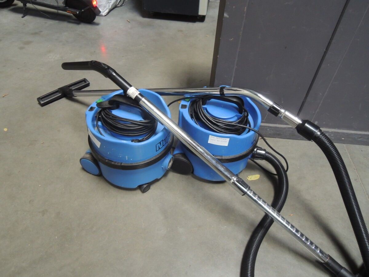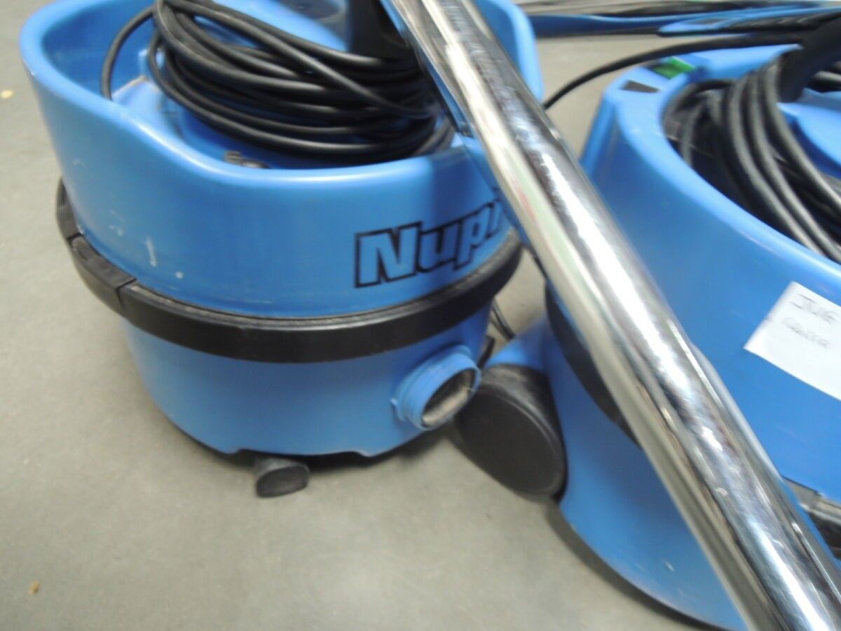 2 aspirateurs NUPRO NUV180-11 de forme bidon, bleu. 1 fléxible manquant. (Vente judiciaire. Frais en sus des enchères : 14,28% TTC + Si Live : 1,2% TTC - L.J. : AG NETTOYAGE SASU)
