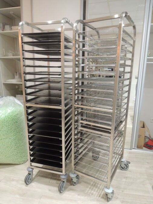 2 échelles mobiles inox à 20 niveaux contenant plaques et grilles