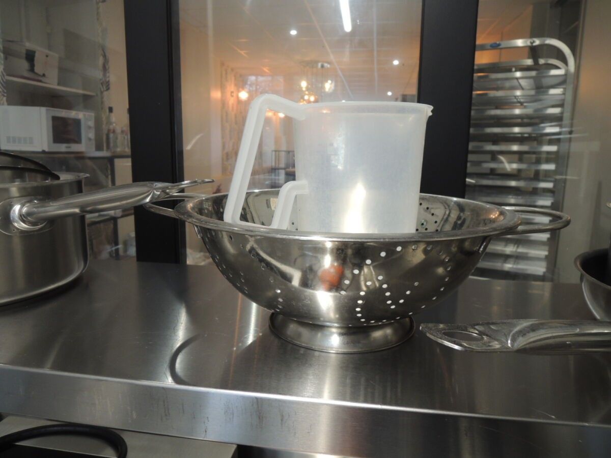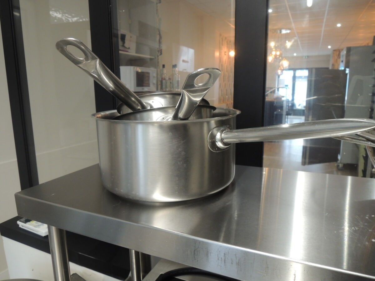 5 casseroles inox, 1 poêle inox passoir inox, 1 entonnoir inox, 1 passoir inox