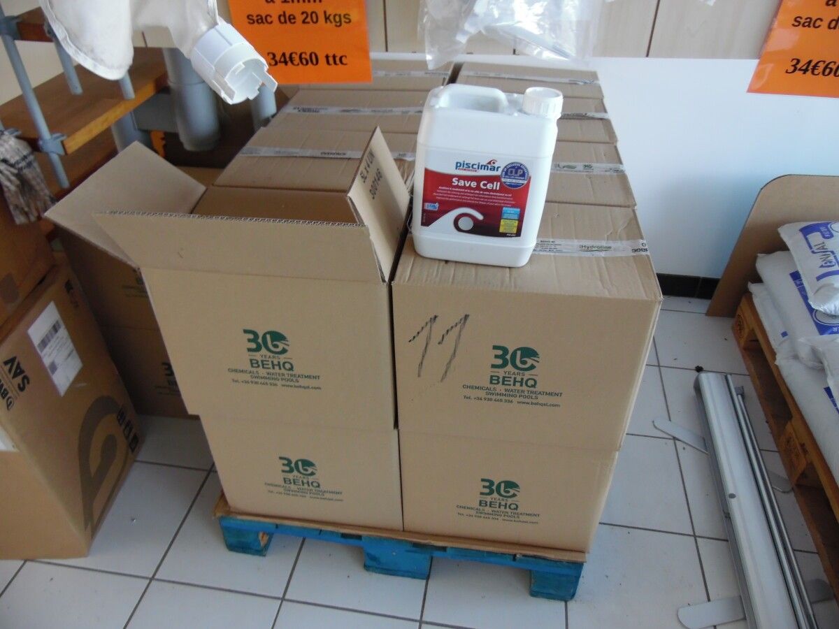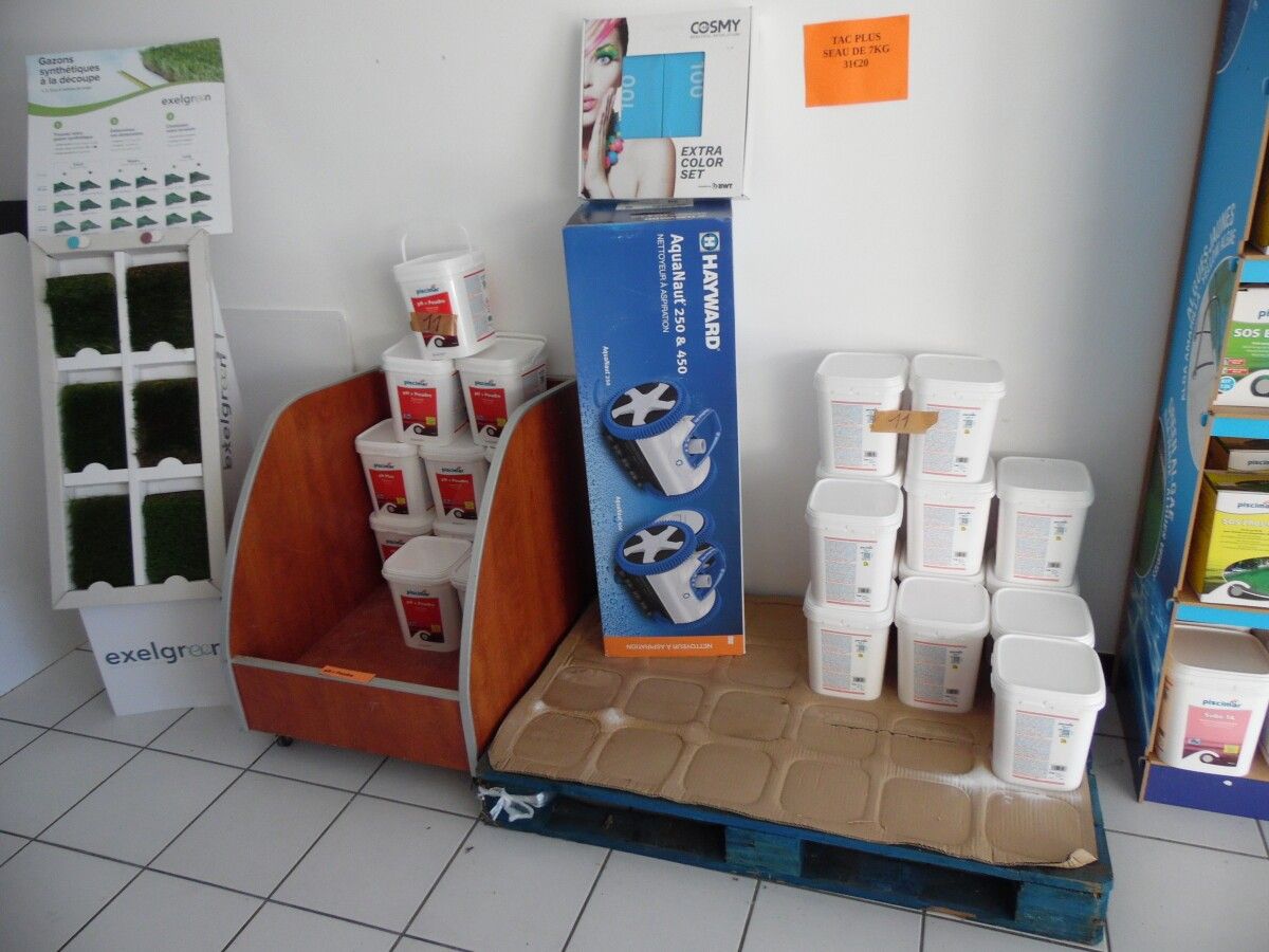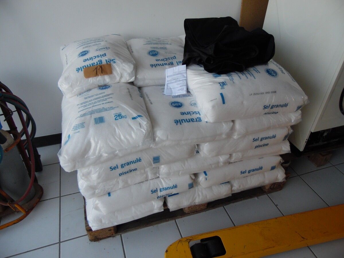Stock: 1 palette de sel granulé piscine, 1 palette de produi…