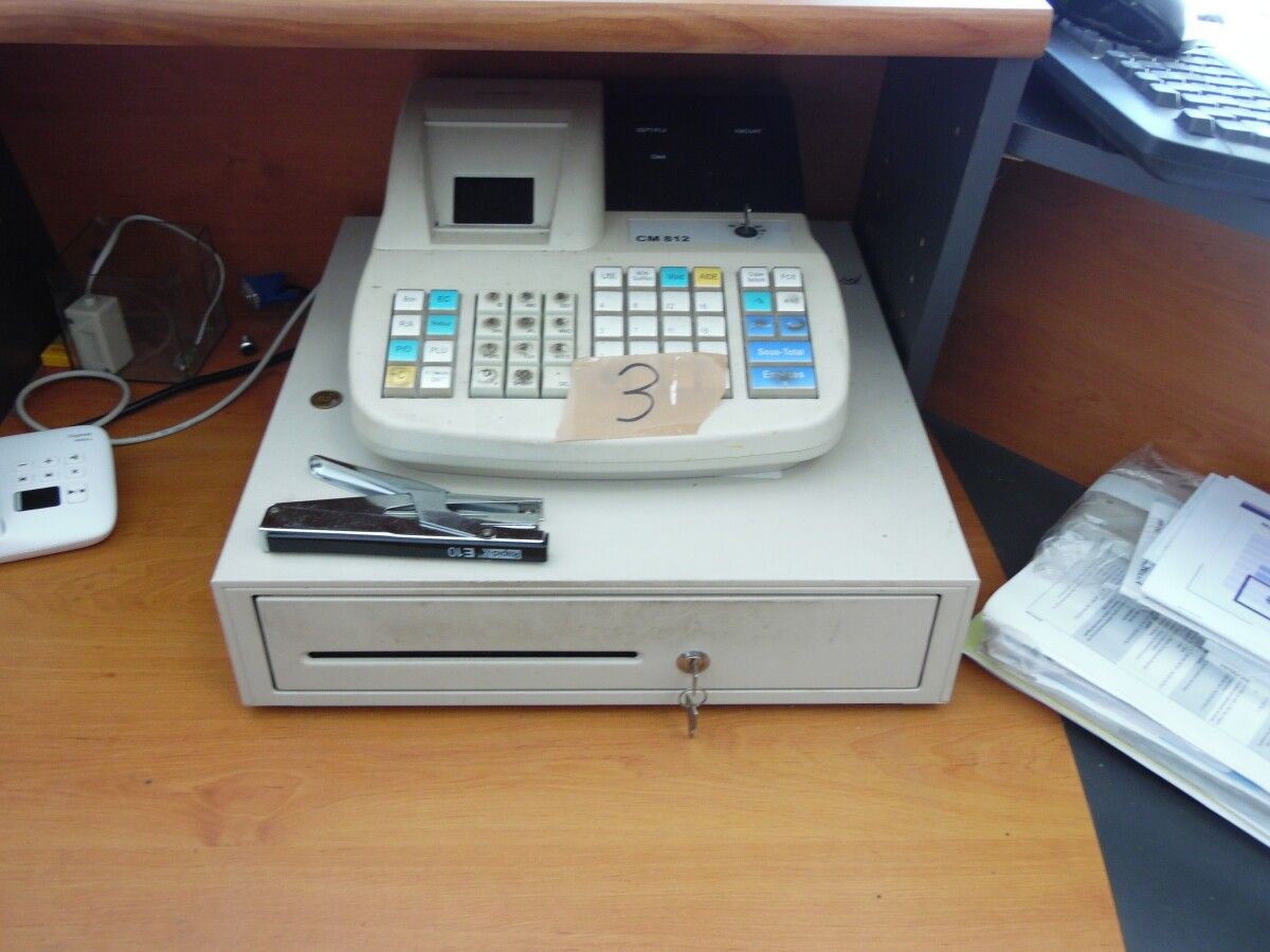 Table de travail (usée), comptoir, 1 fauteuil usé, caisse - …