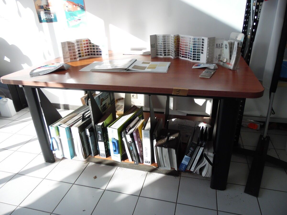Table de travail (usée), comptoir, 1 fauteuil usé, caisse - situé 24b avenue d'Antioche 17480 LE CHATEAU D'OLERON - visite le 19/11 de 9h30 à 10h - retrait le 25 à 10h