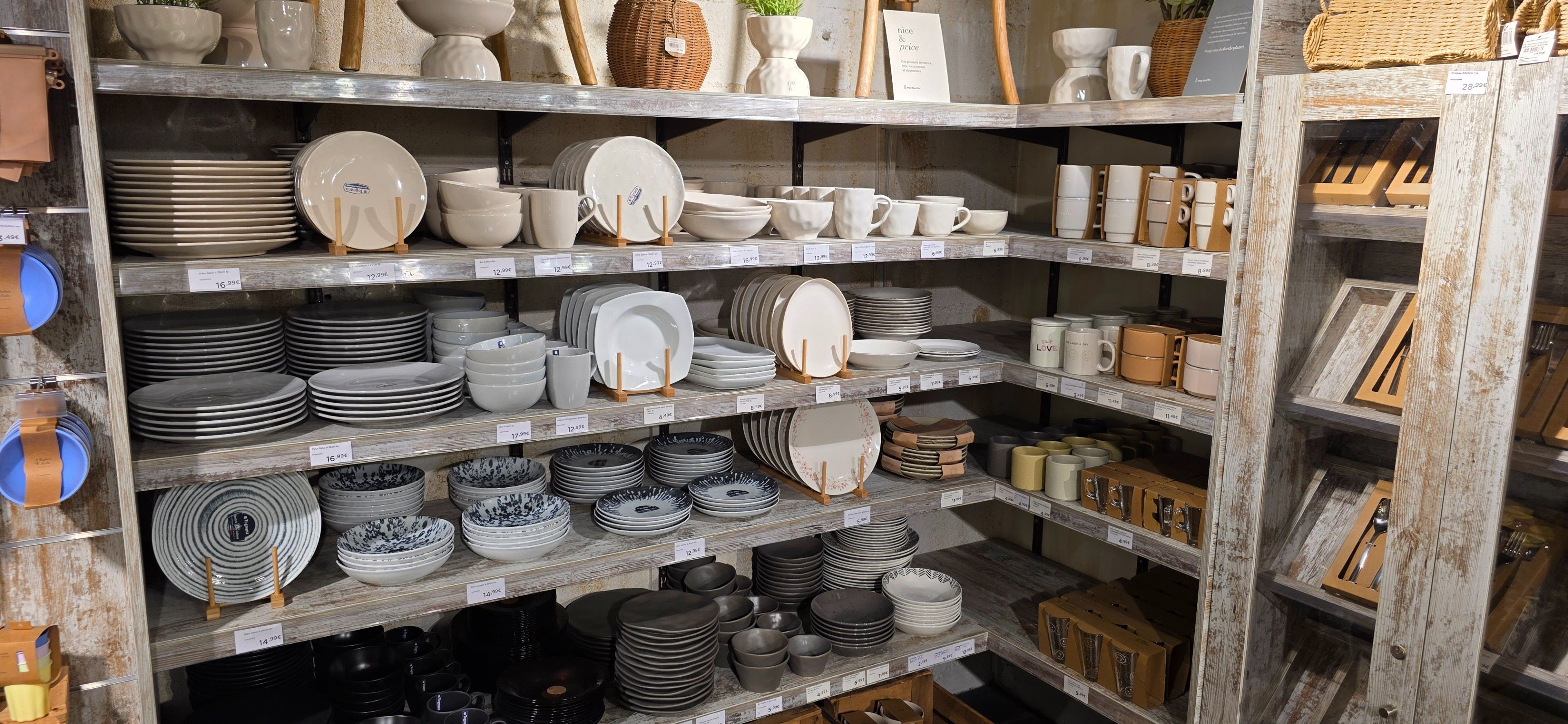 - ASSIETTES, SALADIERS, BOLS, MUGS, PLATEAUX, VERRES, COUVERTS, JARRES, CARAFES, BOCAUX, SALIERES, POIVRIERES, PLANCHES A DECOUPER, PETITS USTENSILES, SETS DE TABLE, TORCHONS / SERVIETTES, NAPPES, VASES, BOUGEOIRES, BOUTEILLES EN VERRES,