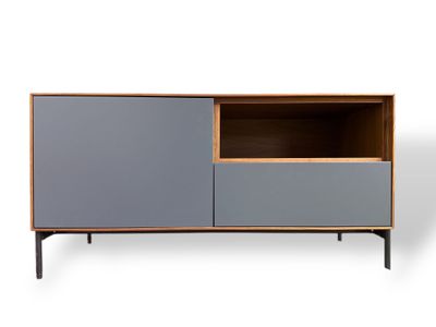 Meuble TV bicolore en bois, à porte et tiroir gris.
