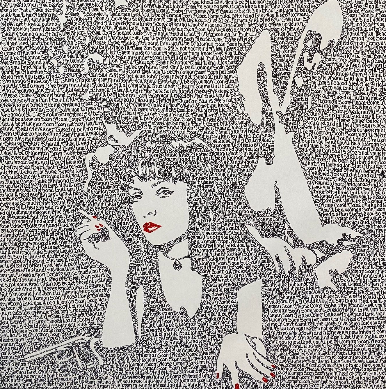 Athéna Menekratis Pulp Fiction (Uma Thurman), 2024 The portrait is made up of the lyrics the song from the film "Girl you'll be a woman soon Ink on canvas Calligraphy work. 100 x 100 cm. Work mounted on stretcher.