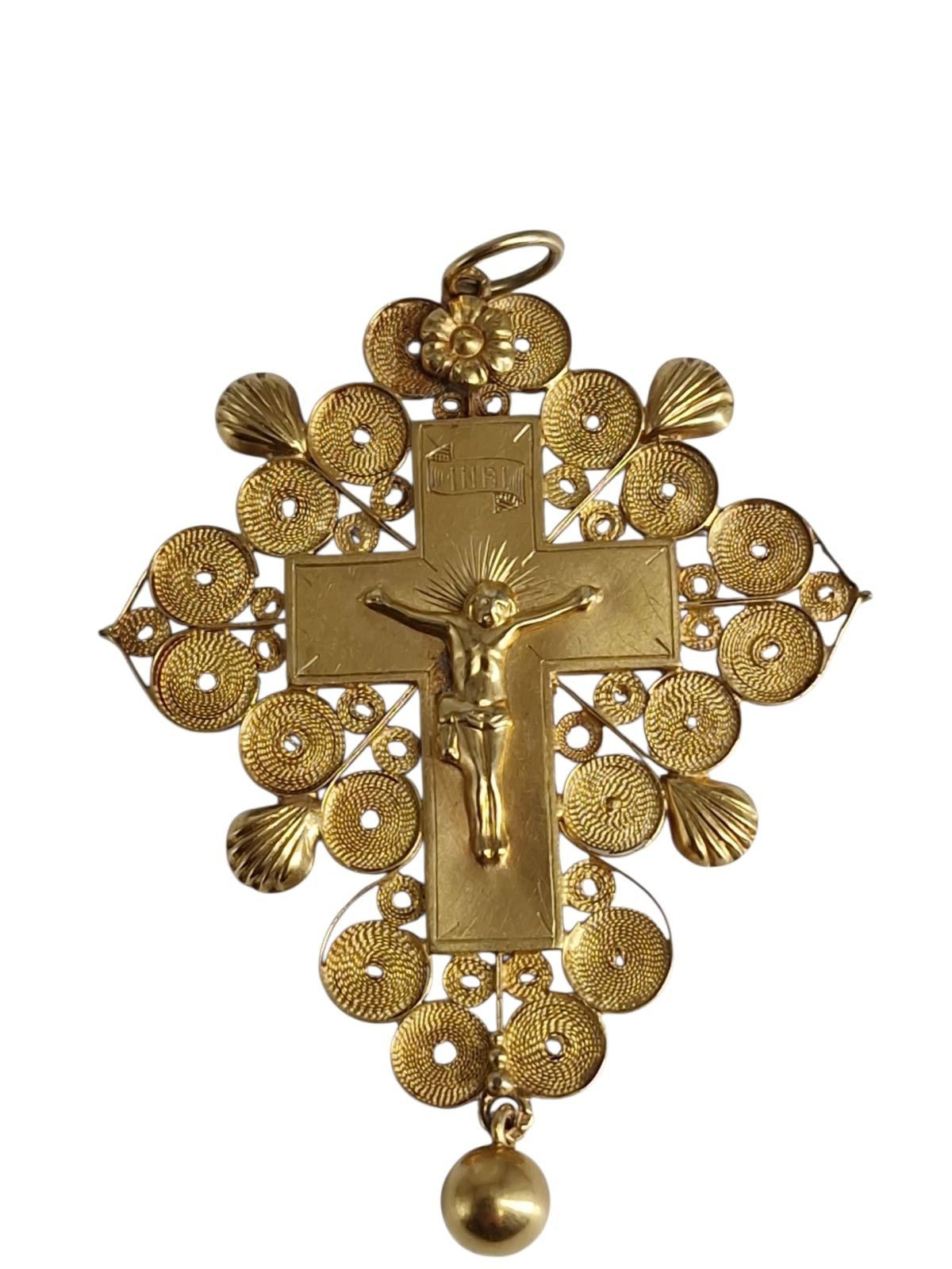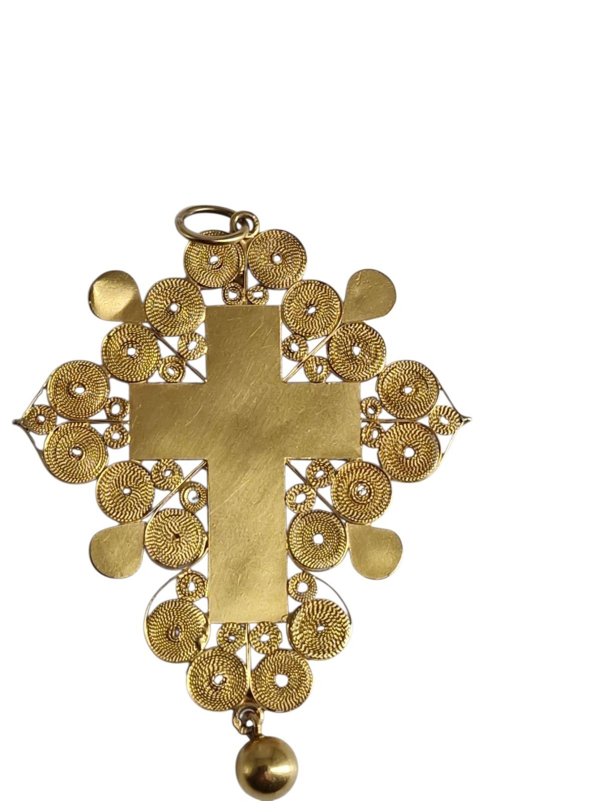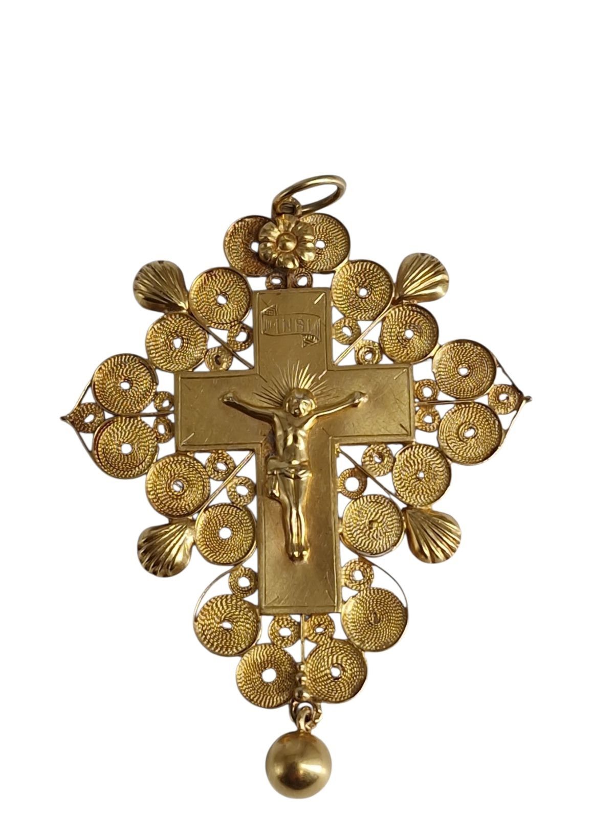 Boulonnaise cross in filigreed and engraved gold. 19th century. 5 x 7 cm. Weight : 9,4 gr