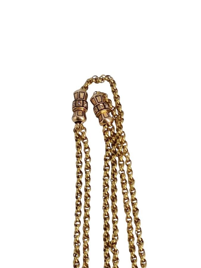Gold long necklace with "witch chain" links, barrel and two enamelled barrels, engraved with floral motifs and set with fine pearls. Master goldsmith Devillepoix Goldsmith prize at the national competition.