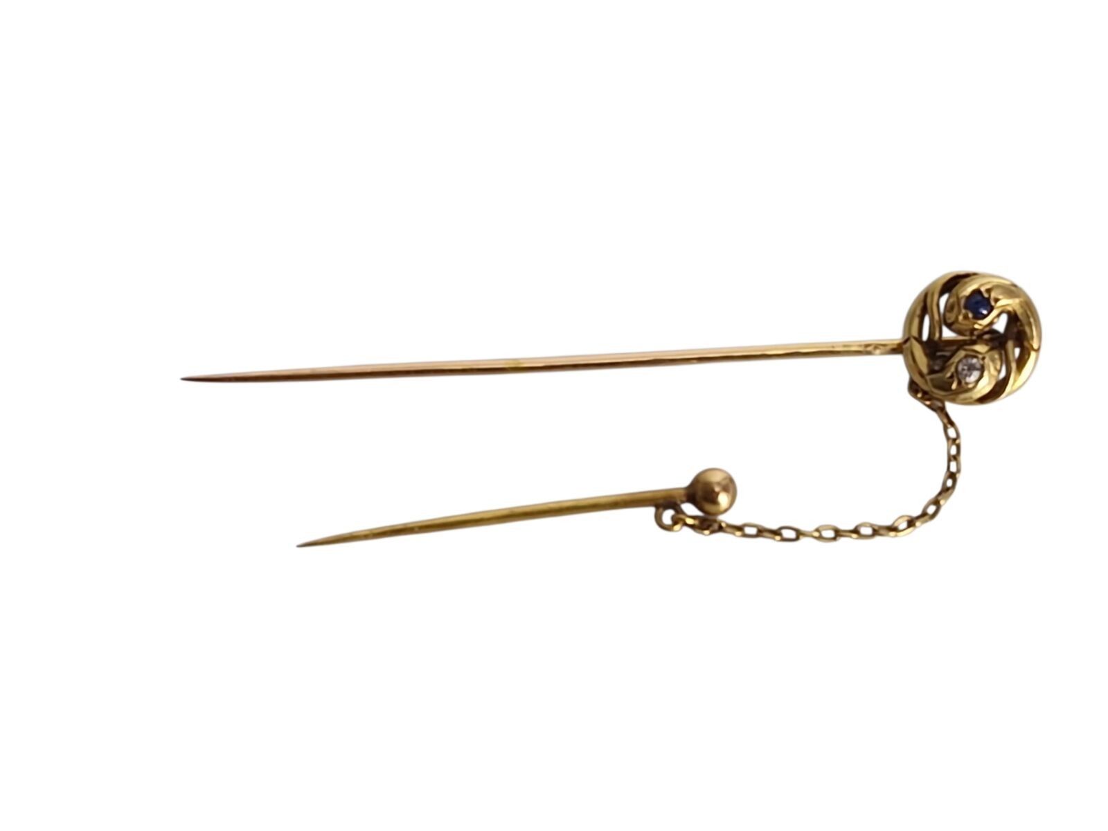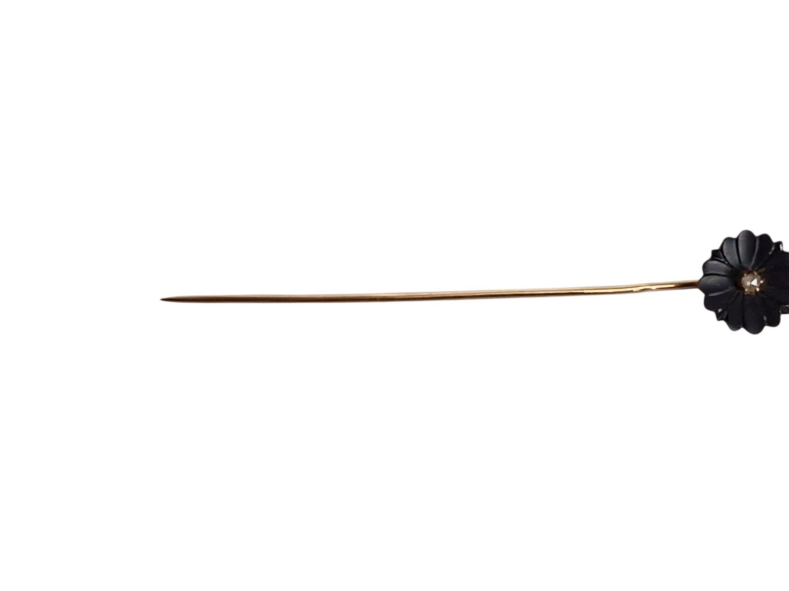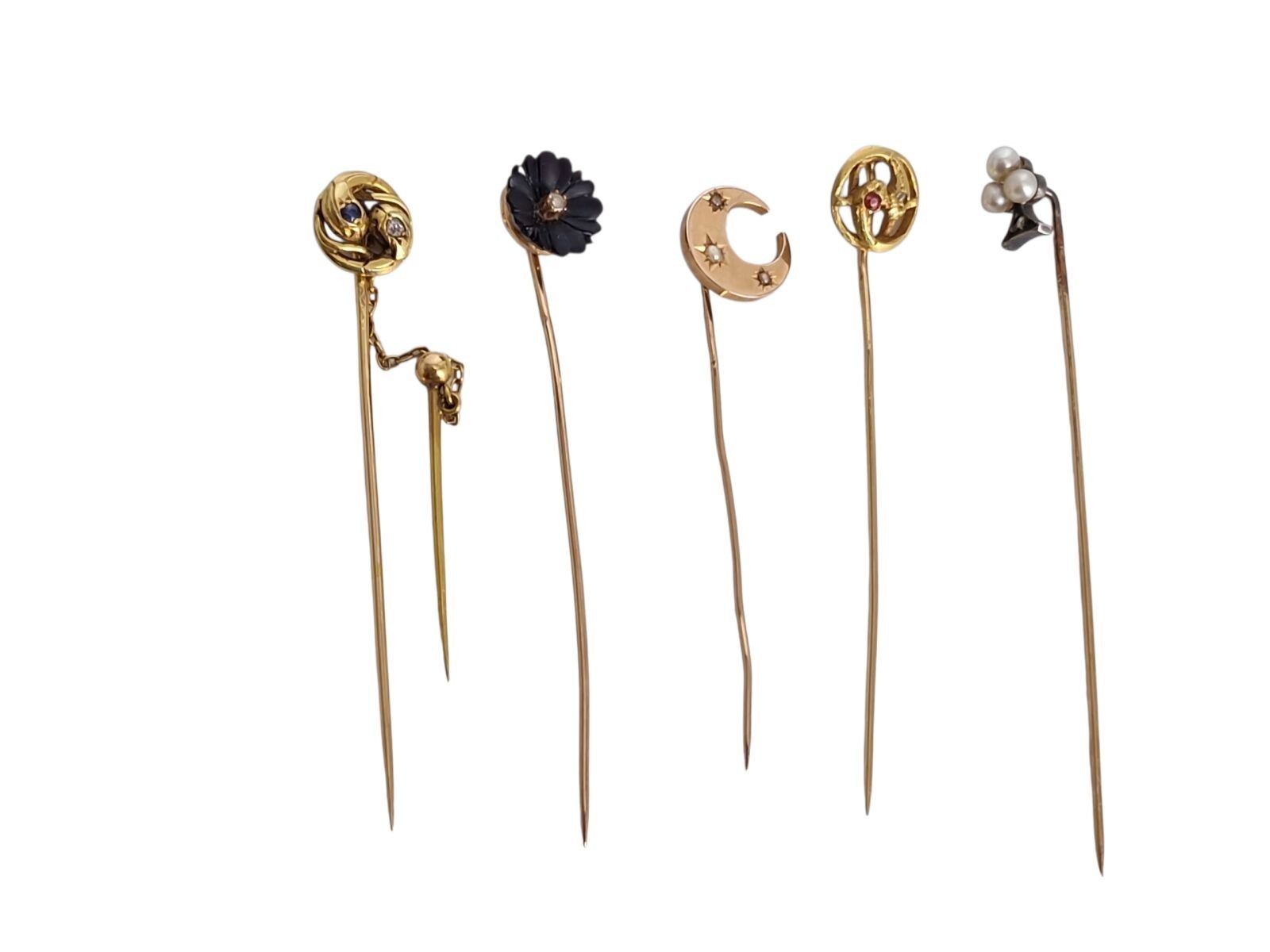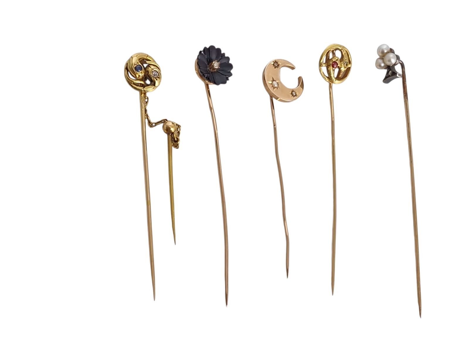 5 gold tie pins set with pearls, onyx, roses and pearls. Gross weight: 8.5 g