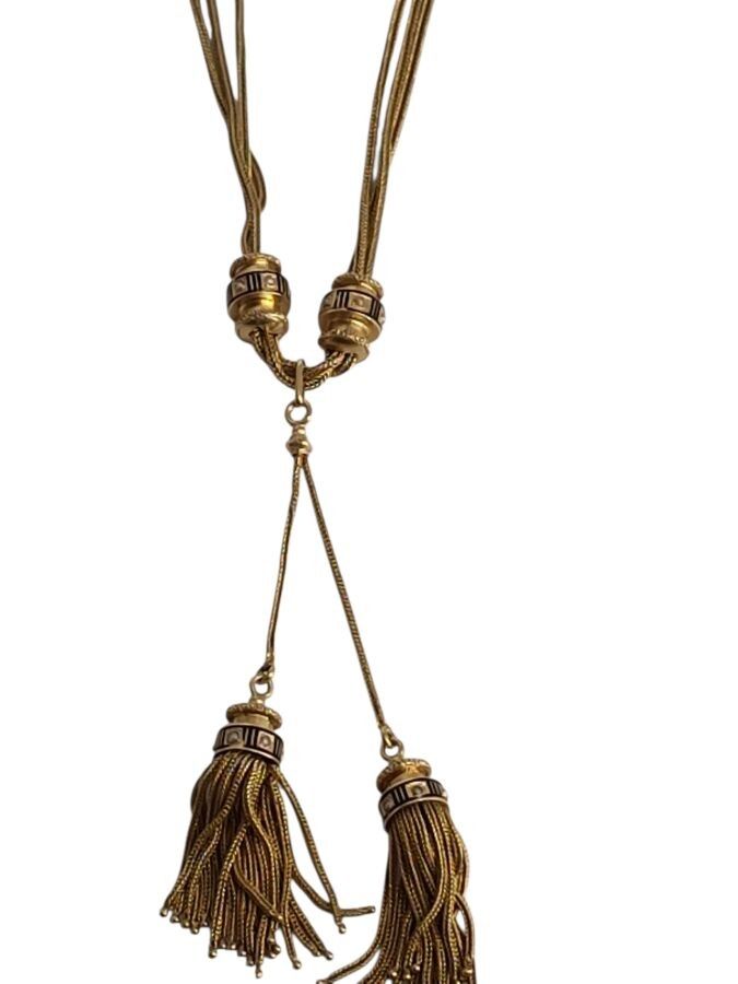 Gold necklace with 2 slides and passementerie motifs set with pearls and enamelled. Gross weight: 27 g
