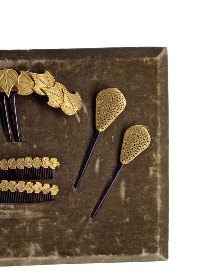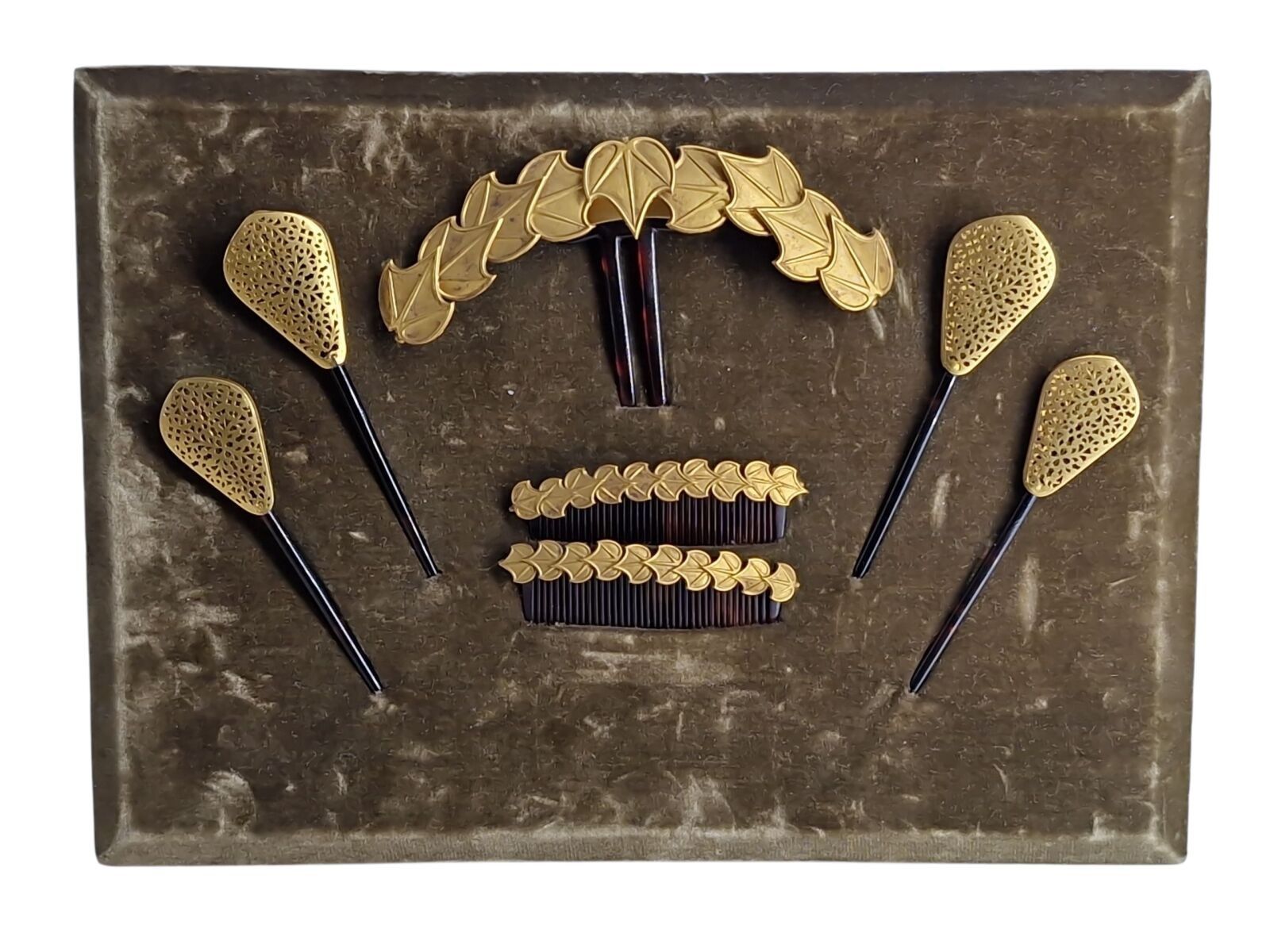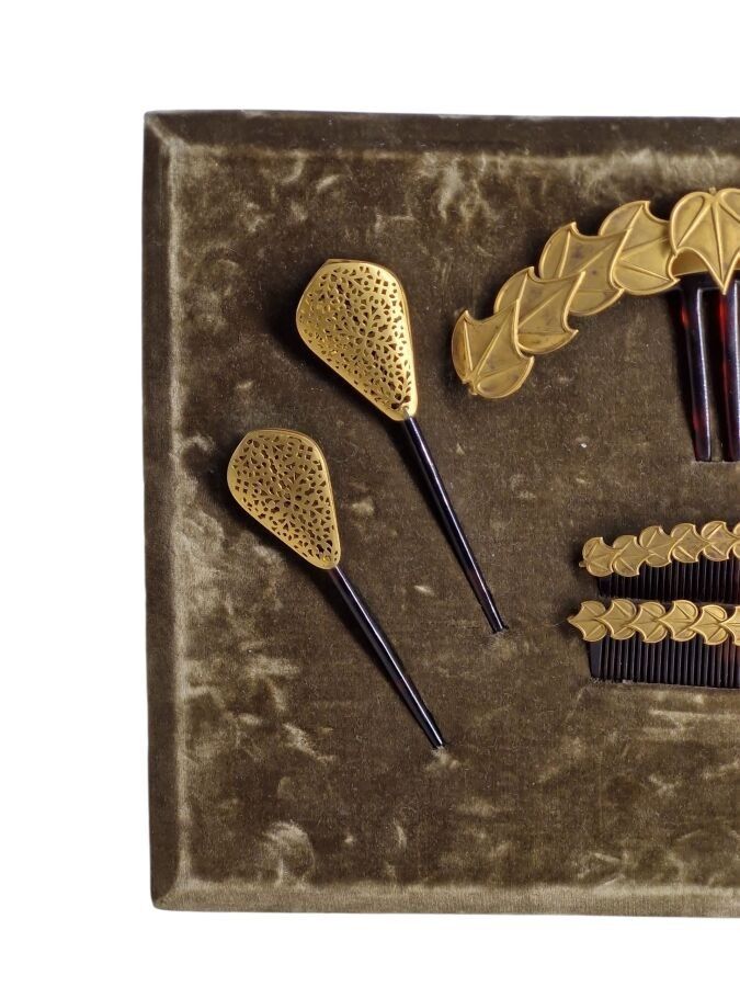 Head set, tiara comb comprising 1 tiara set in 18K gold with ginkgo biloba leaf motif, 2 small combs set in 18K gold with ginkgo biloba leaf motif and 4 gilded metal bun pins with openwork motif, all on a khaki green velvet stand with tripod. Tiara: H.8.5cm; W.11.5cm / Comb: H.3cm; W.6.7cm / Pin: W.11.5cm. Labelled on the back with combs and pins that belonged to Princess Mathilde, daughter of Jérôme Bonaparte. G.P. of the 3 gold elements: 29.2gr.