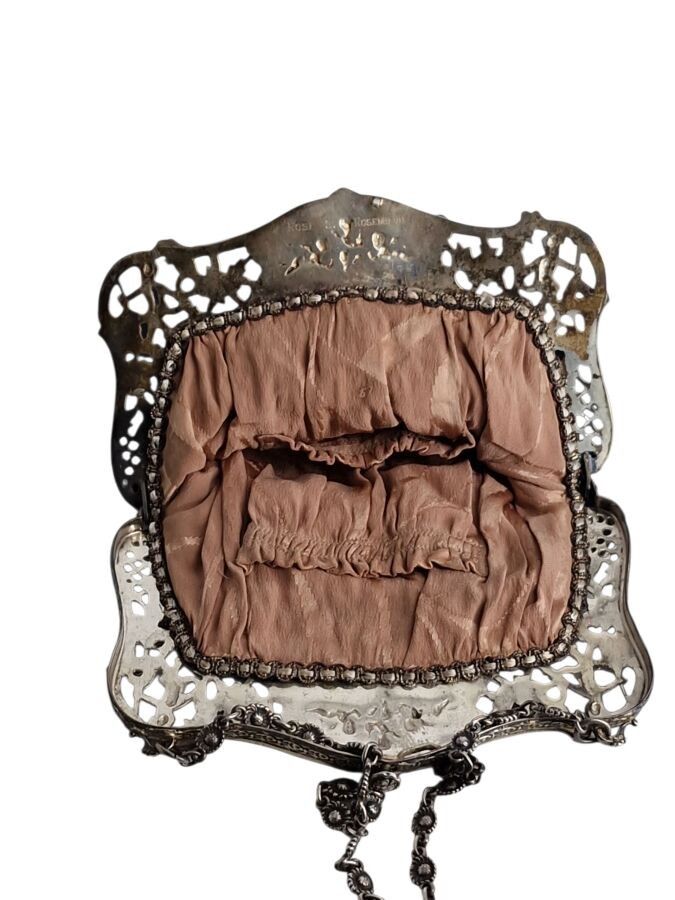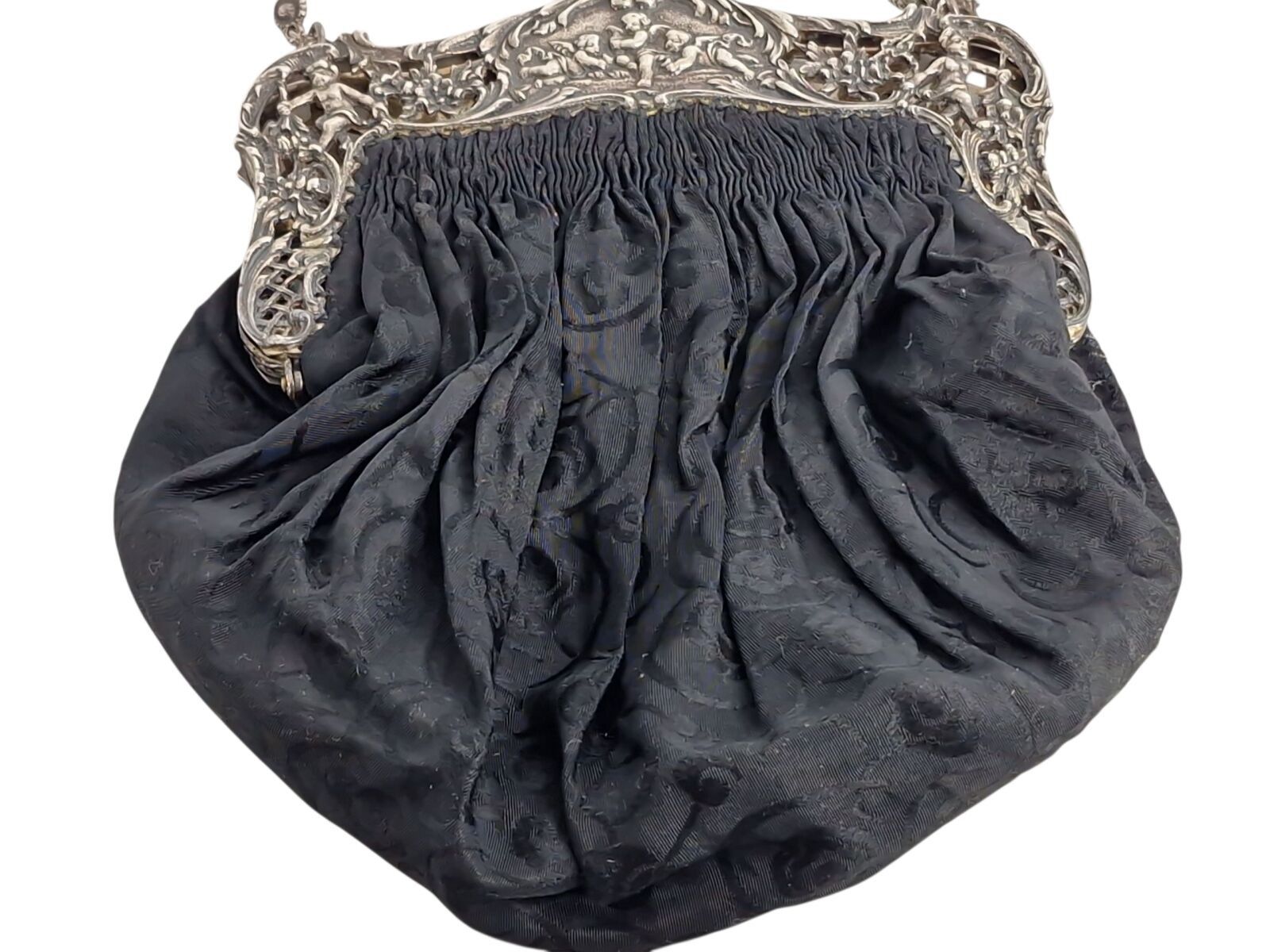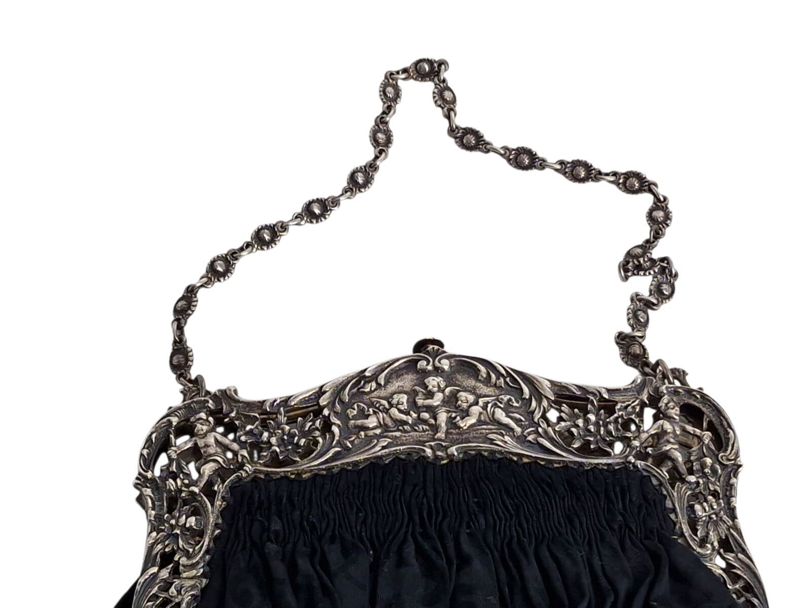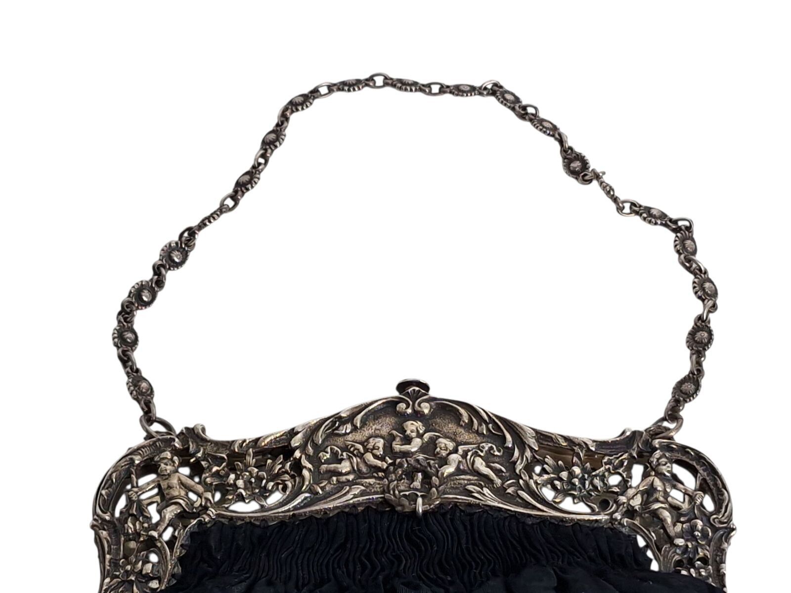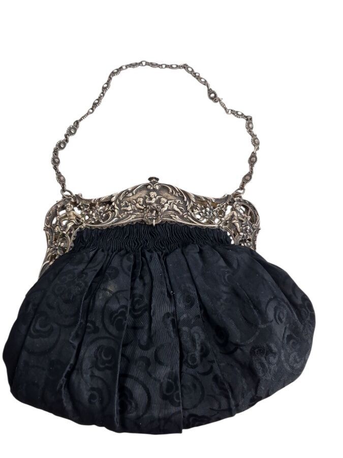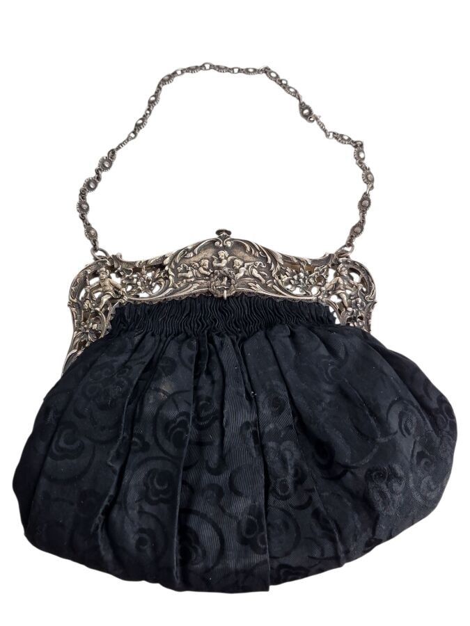GERMANY, Evening bag in black moiré fabric, silver frame with openwork putti, cherubs and foliage motif, Late 19th century, L.18 cm, B.W.323gr