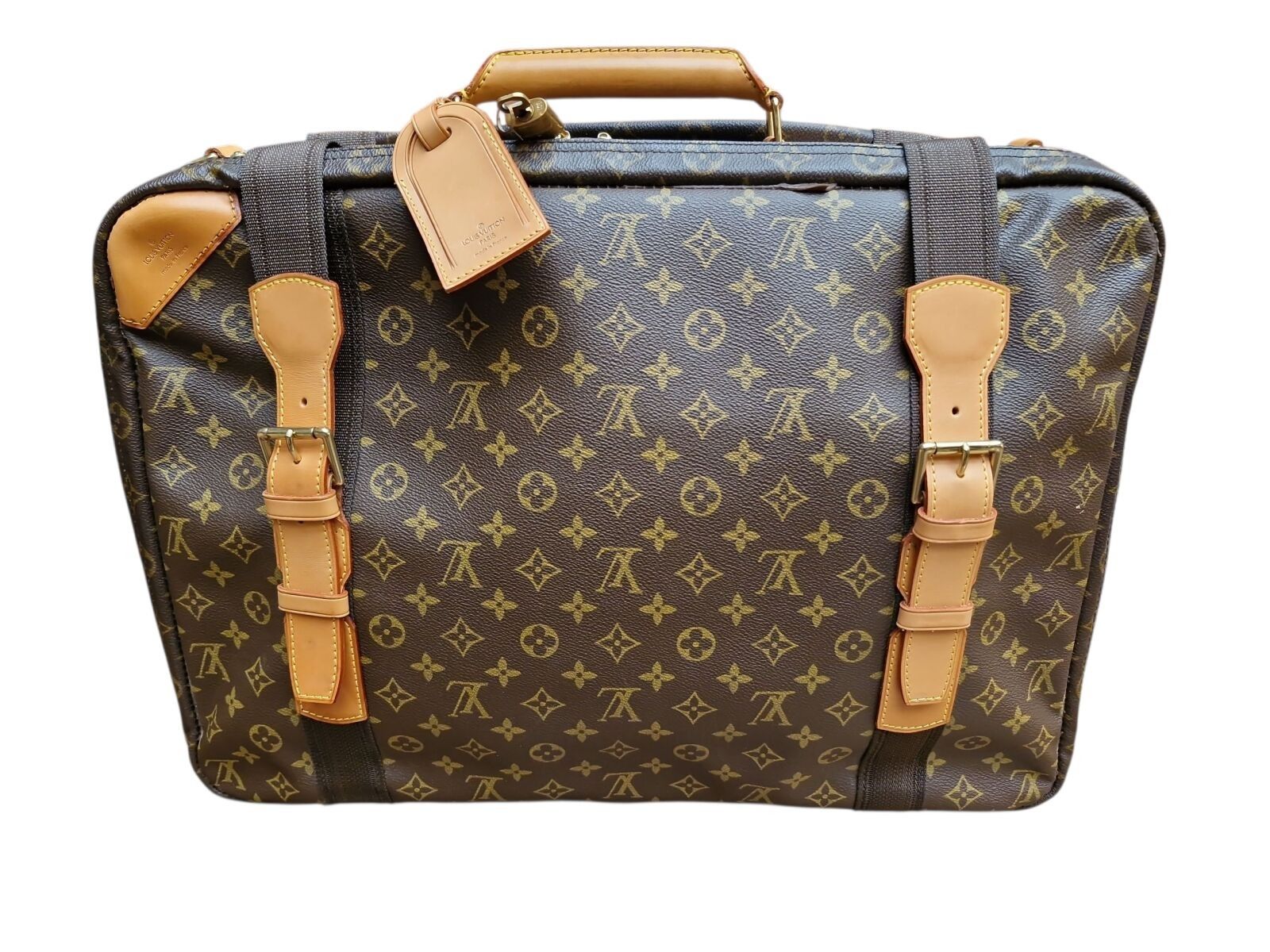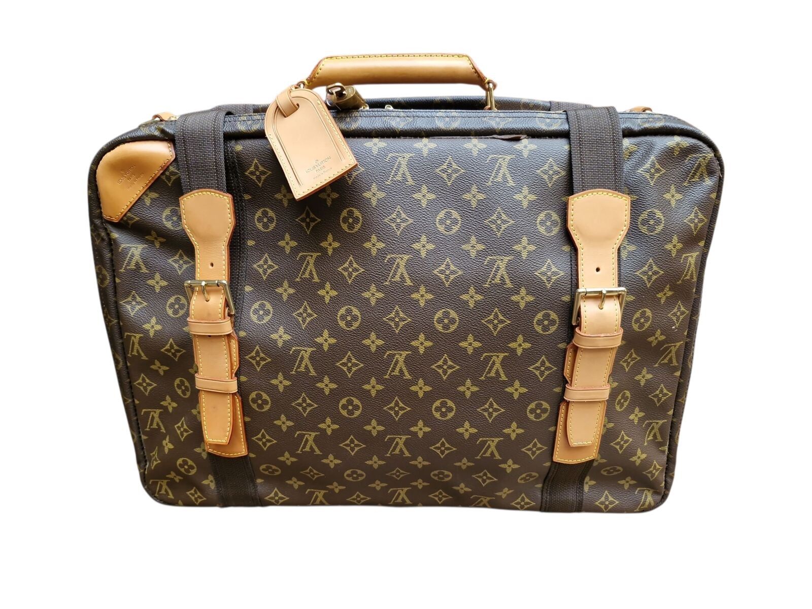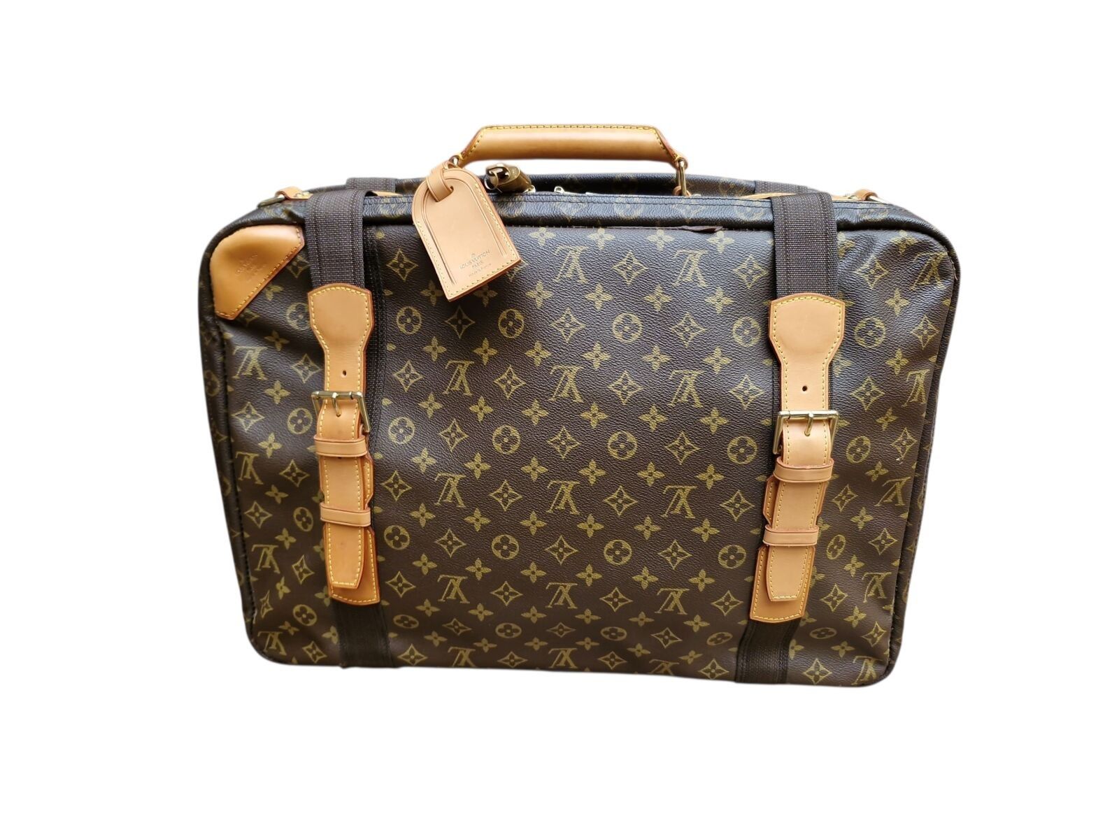 Louis VUITTON. Satellite" suitcase in soft monogram canvas and natural leather. Two reinforcing straps. Zipper closure. Leather handle. Padlock with key (without strap) 51 x 36,5 cm Very good condition.