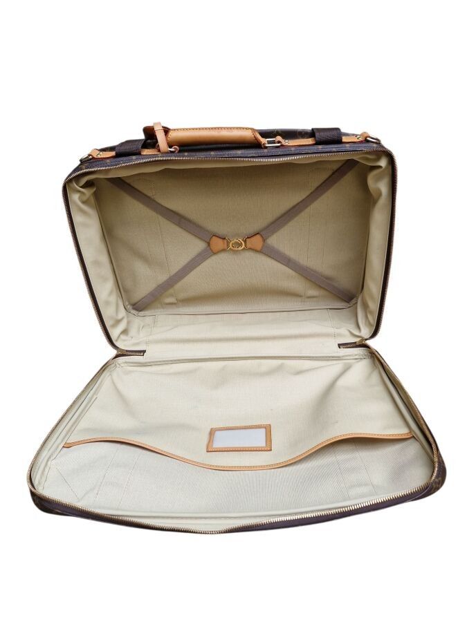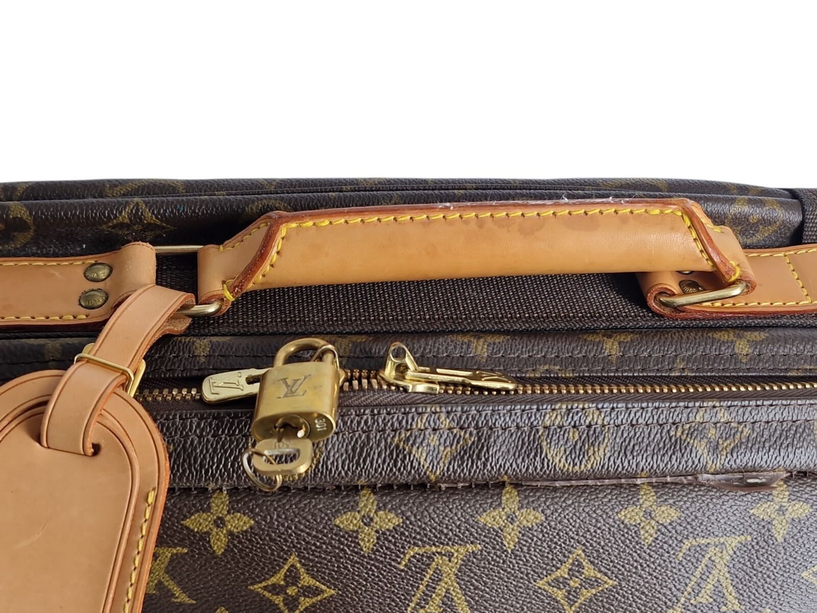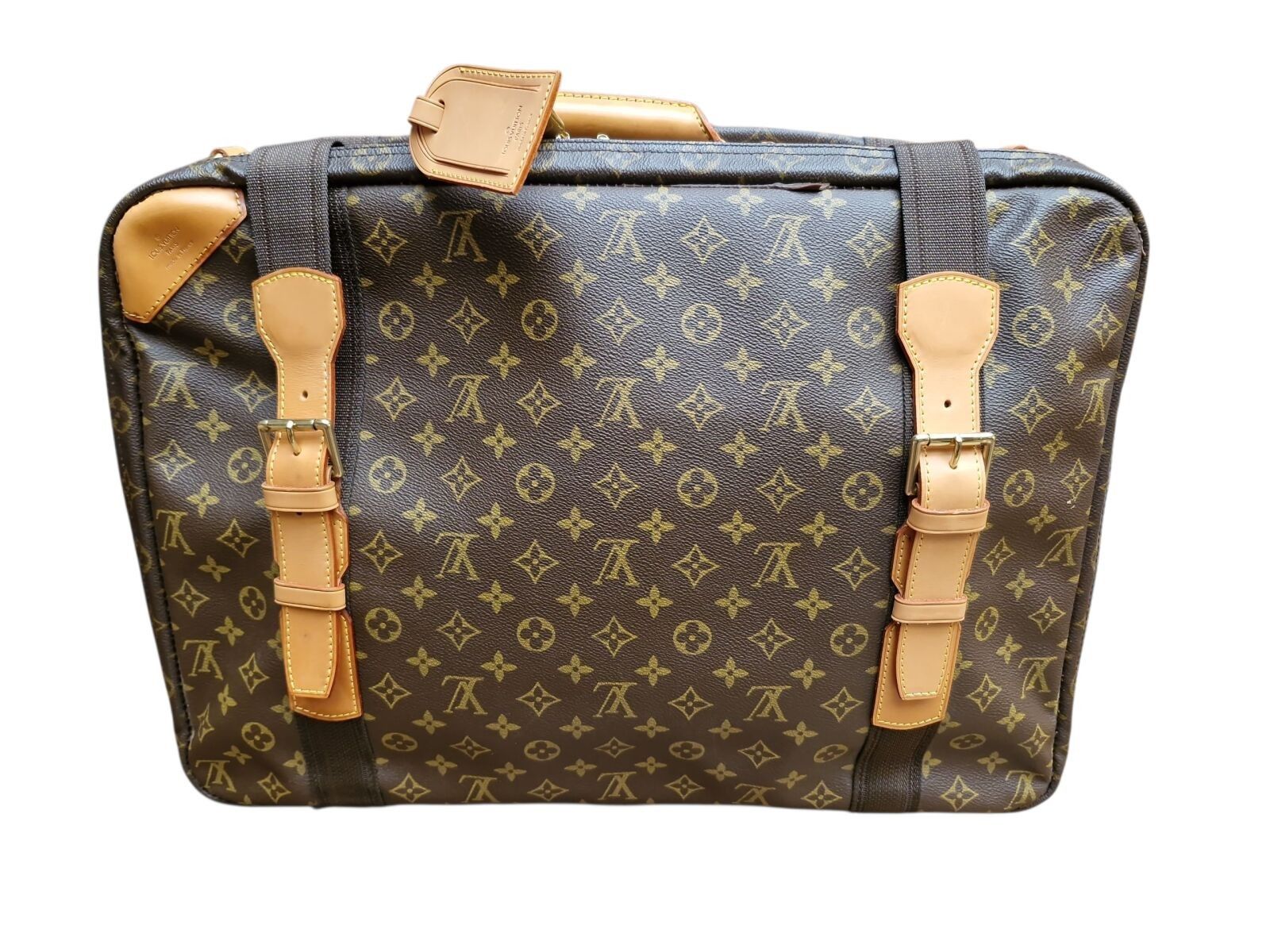 Louis VUITTON. Satellite" suitcase in soft monogram canvas and natural leather. Two reinforcing straps. Zipper closure. Leather handle. Padlock with key (without strap) 51 x 36,5 cm Very good condition.