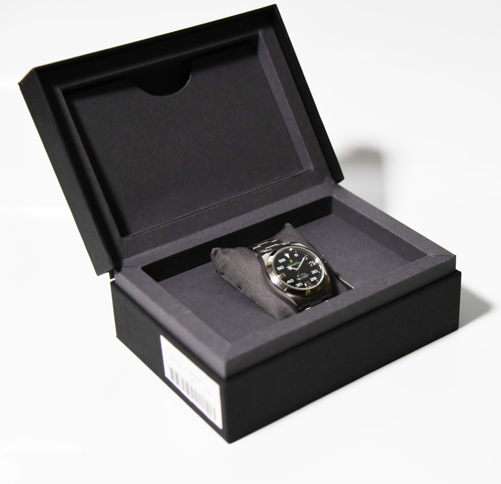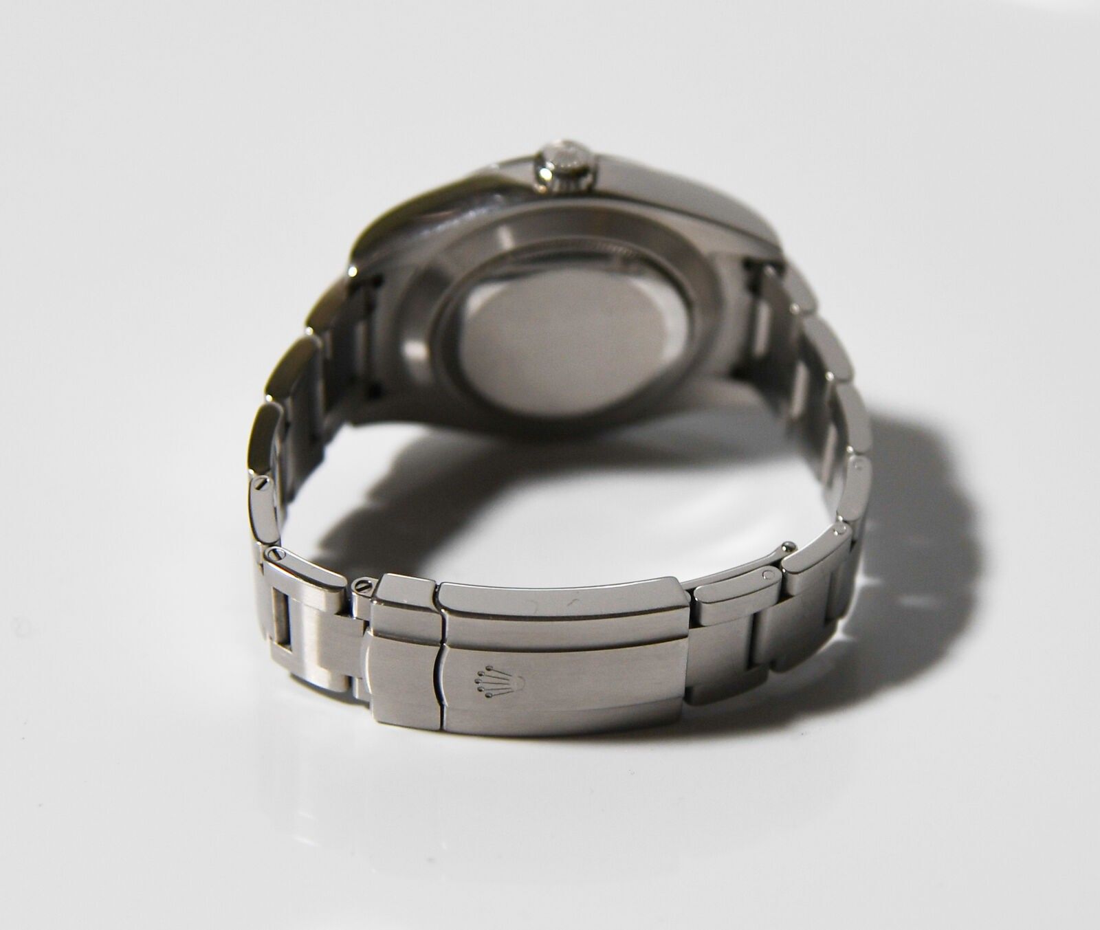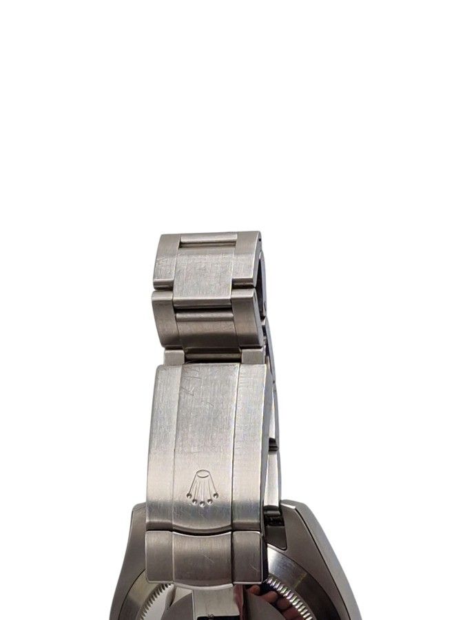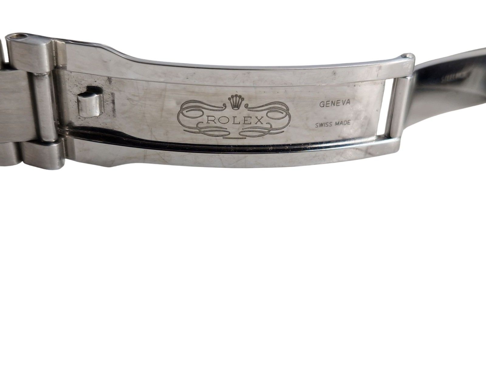 The model presented here is in very good condition, with a slight patina from use. Watchfinder & Co box, copy of the invoice dated 10-2021. An additional steel Oyster link accompanies the watch.