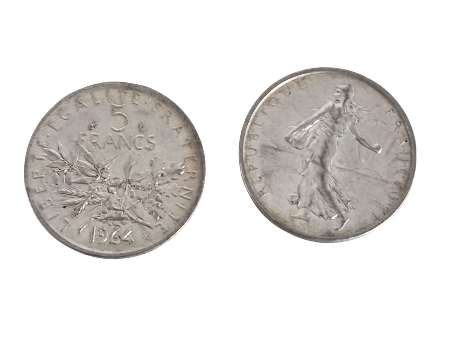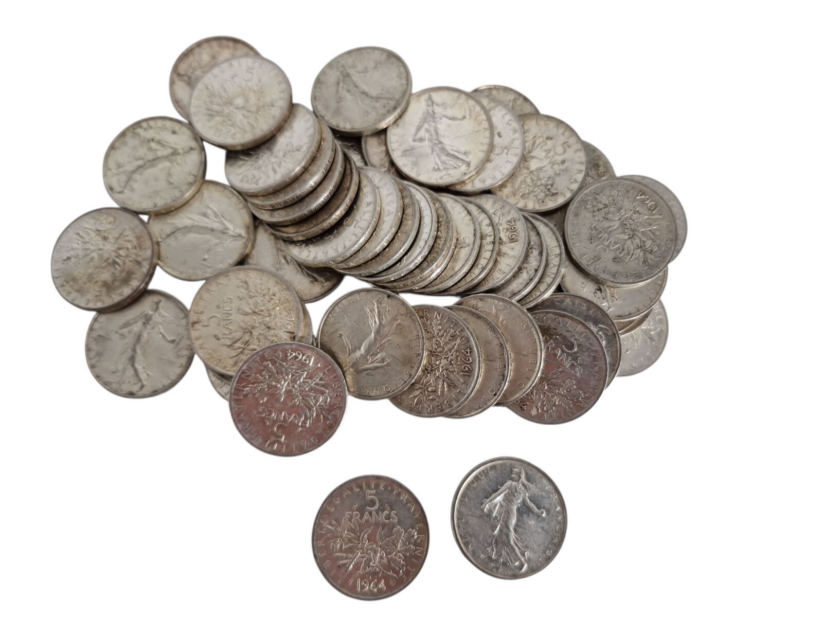 Lot of 50 silver 5 FF Semeuse coins 1964.
