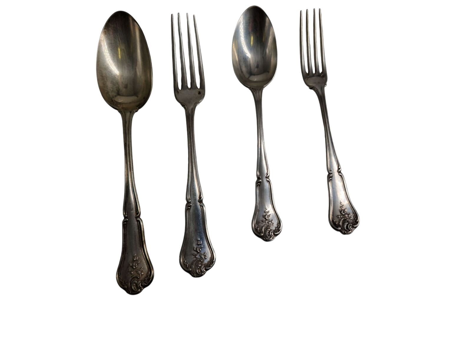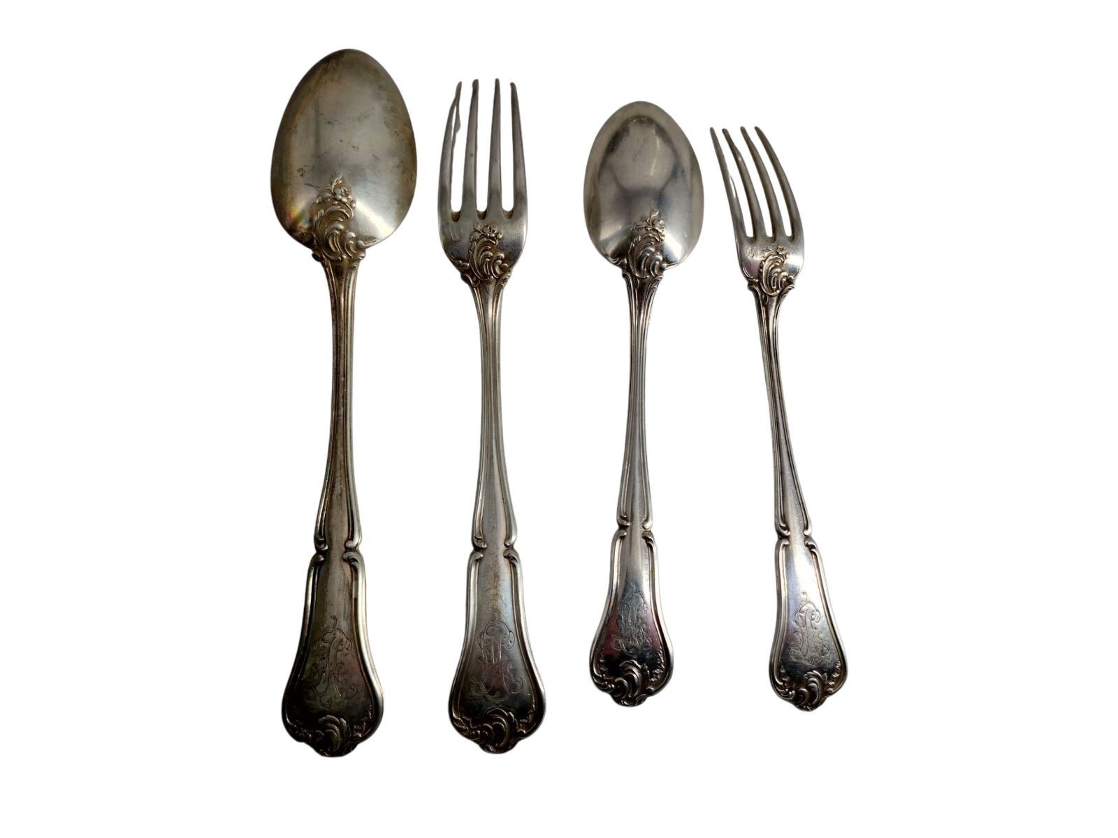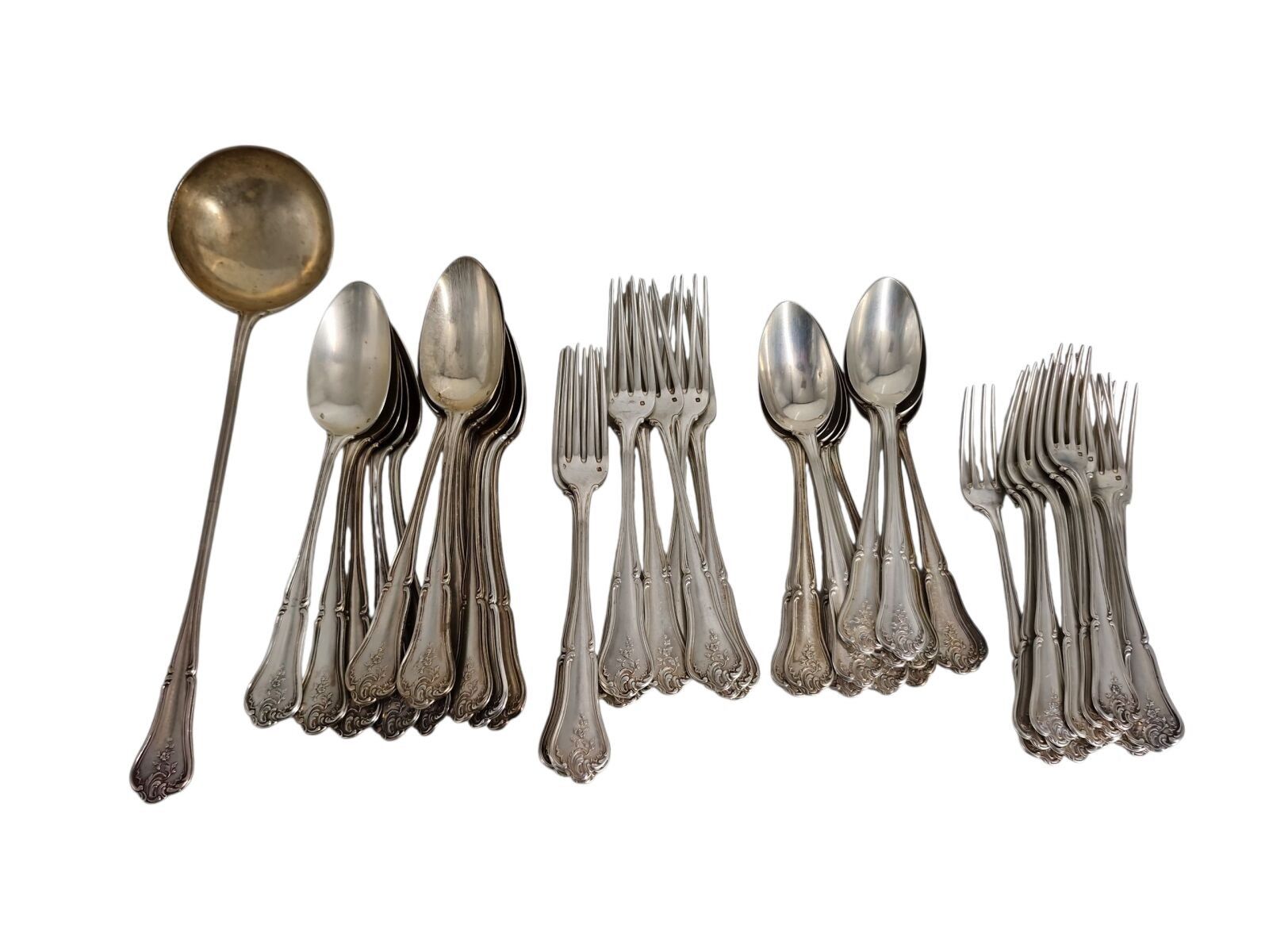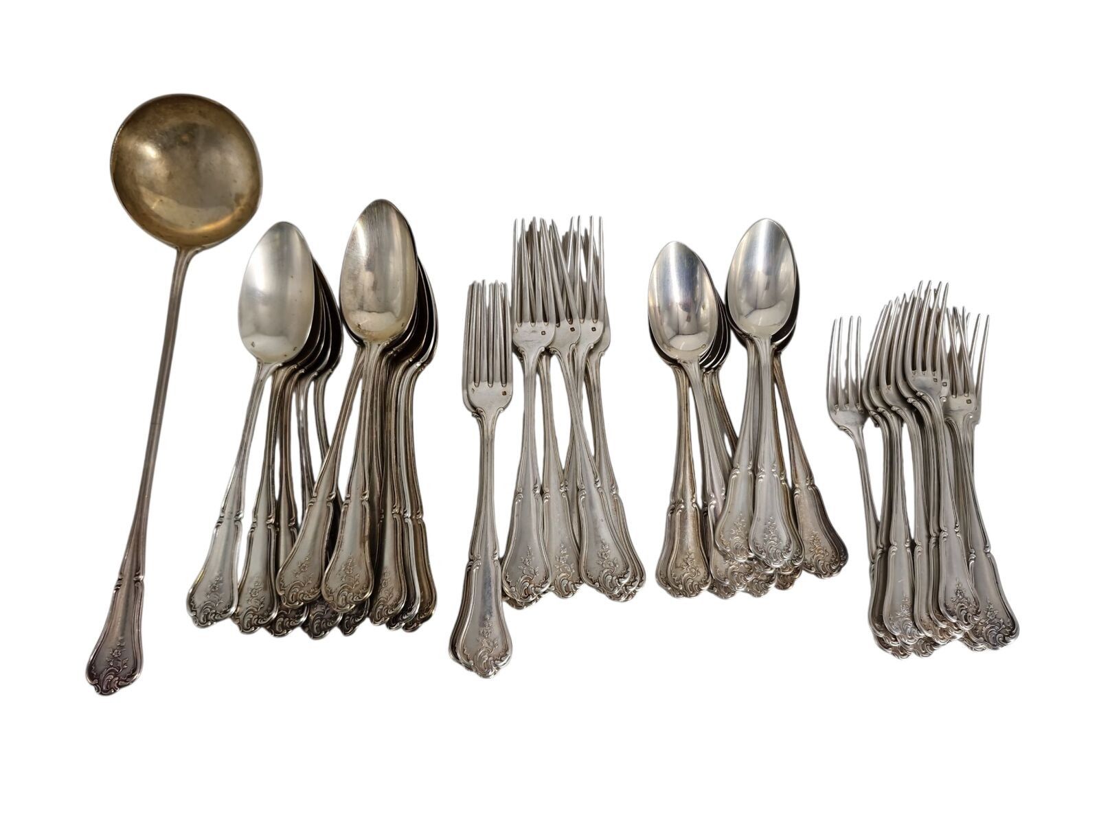Louis XV style chased silver dinner service comprising: 1 ladle, 11 forks, 12 spoons and 12 spoons and forks. Weight : 3.420 kg