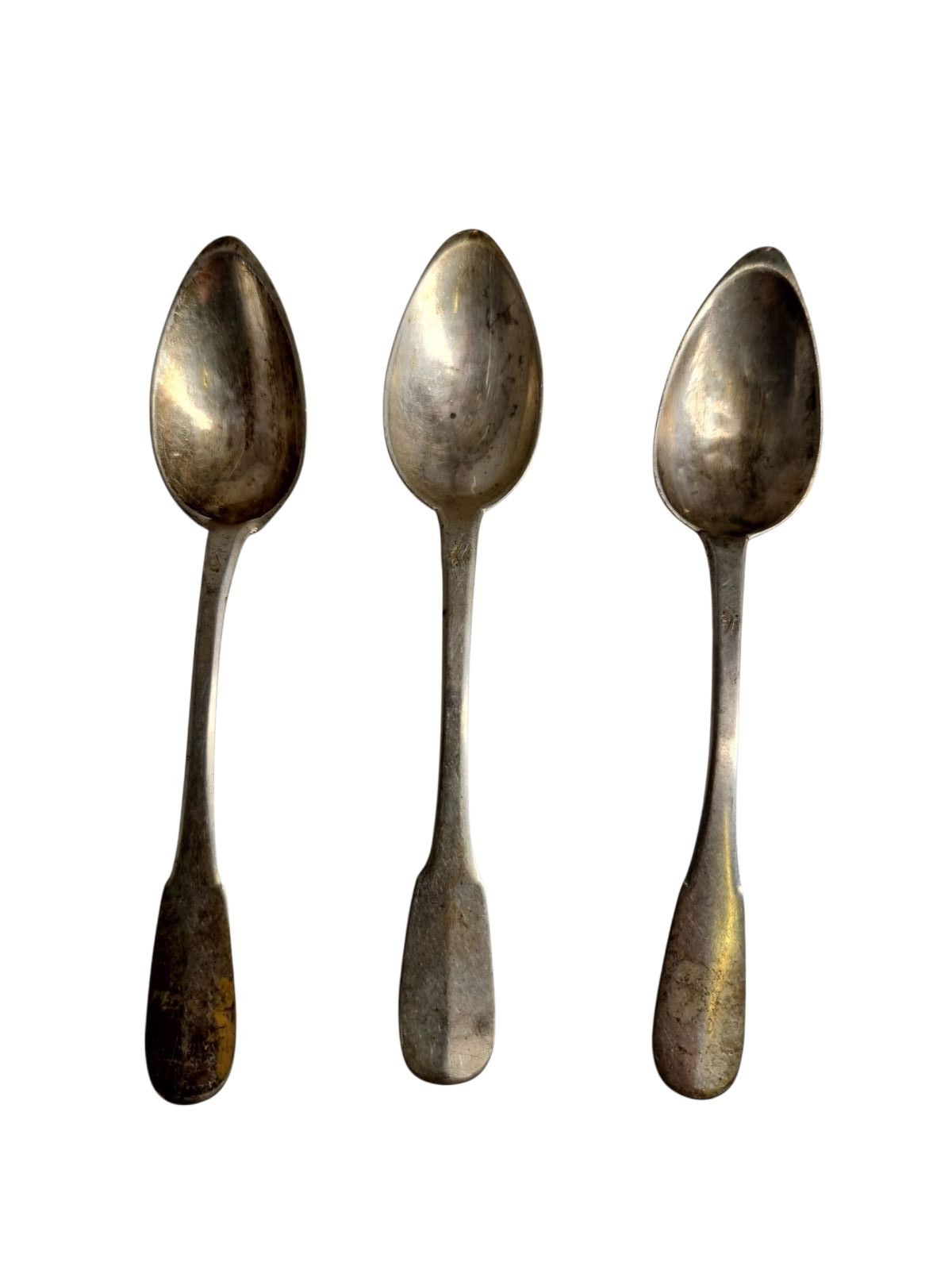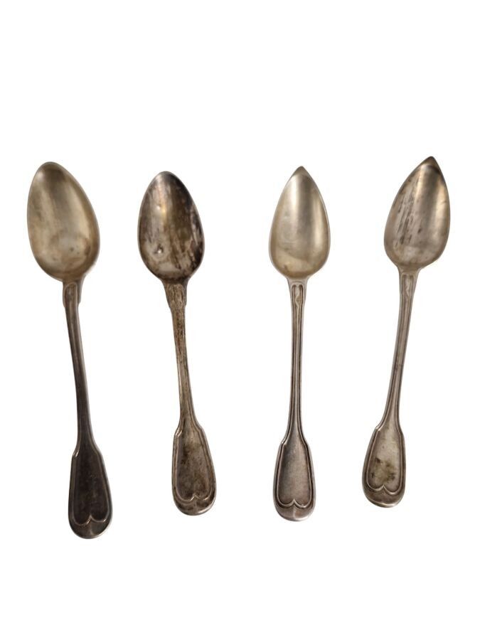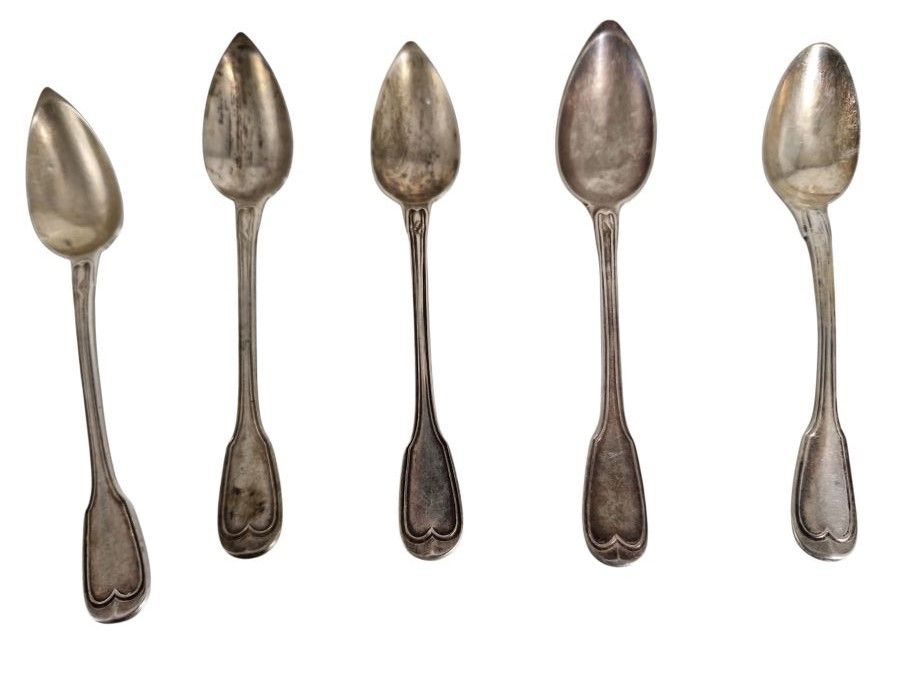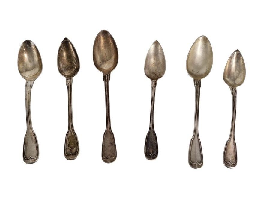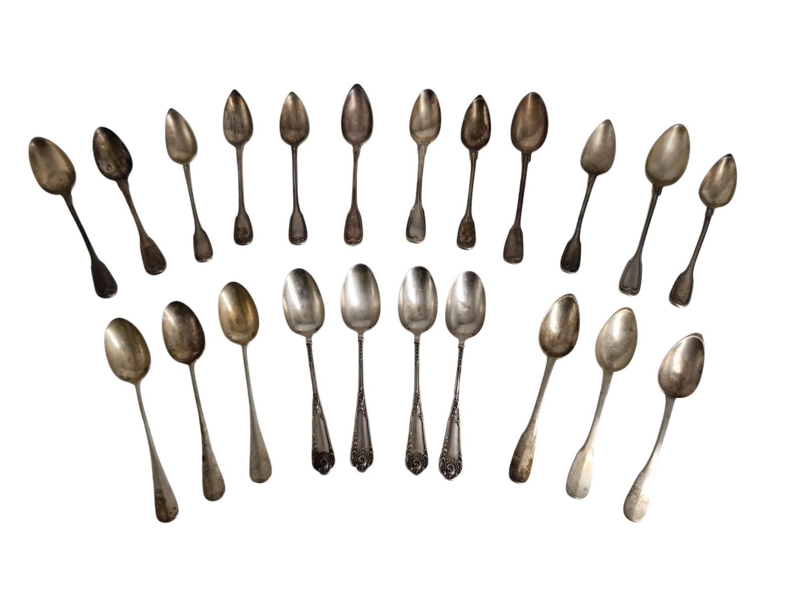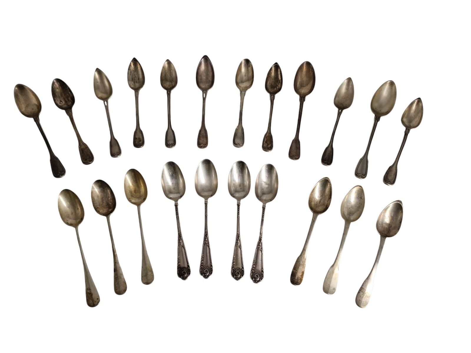Set of 22 silver coffee and dessert spoons with filets and rocaille pattern. Weight : 420 gr