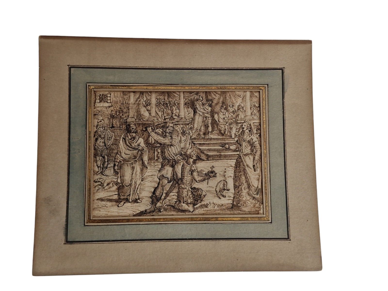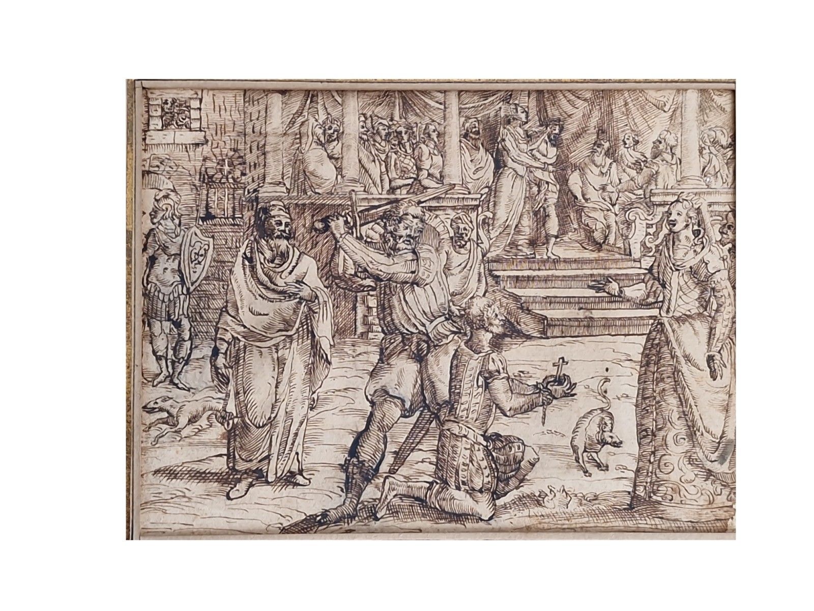 GERMAN SCHOOL Second half of the 16th century 1 - The beheading of Saint John the Baptist in the presence of Salome. Pen and brown ink. H. 10.5 - L. 14 cm 2 - On the reverse: Moses exhorting the Hebrews to obey the laws of Horeb (Deuteronomy 4) Pen and brown ink over a light black stone sketch. Framed with pen. Border against paper paste. Captioned in the lower part in pen DEUTER. 4 Annotated in black stone after Holbein. H. 8 - L. 8.5 cm Expert : Patrice DUBOIS