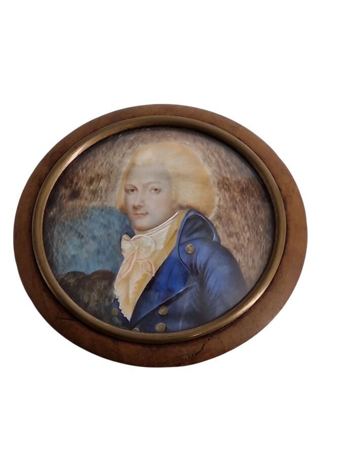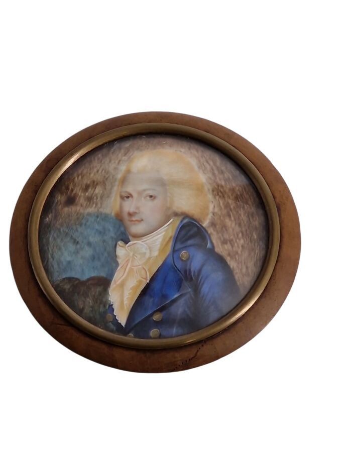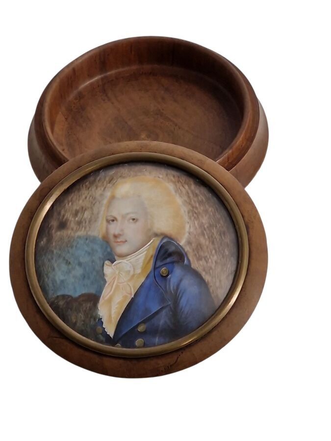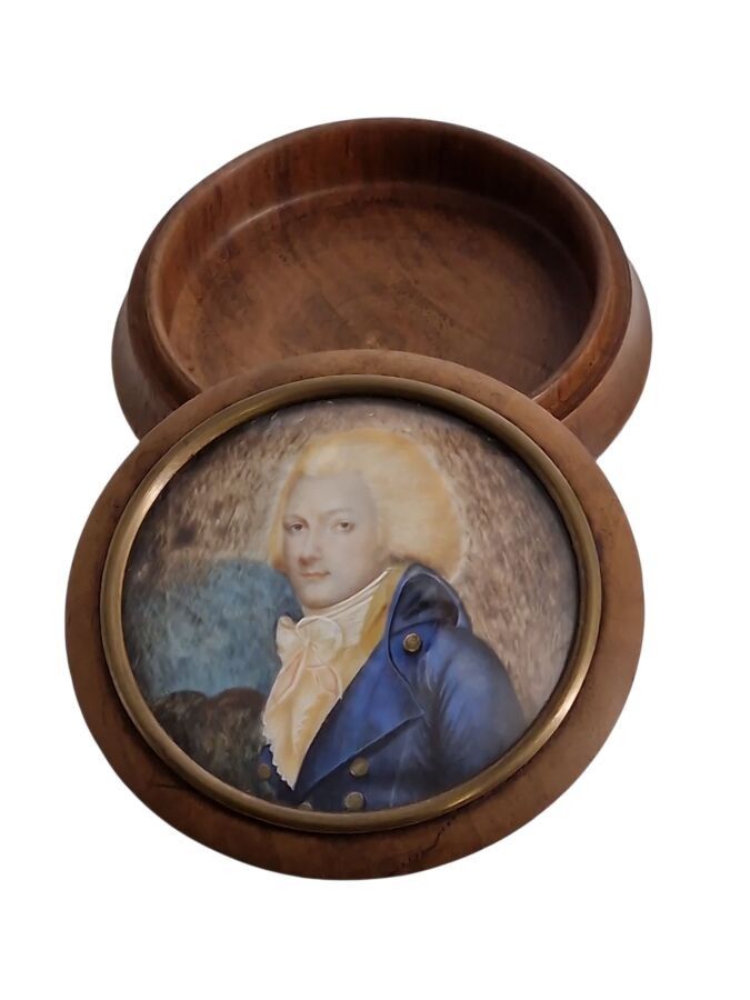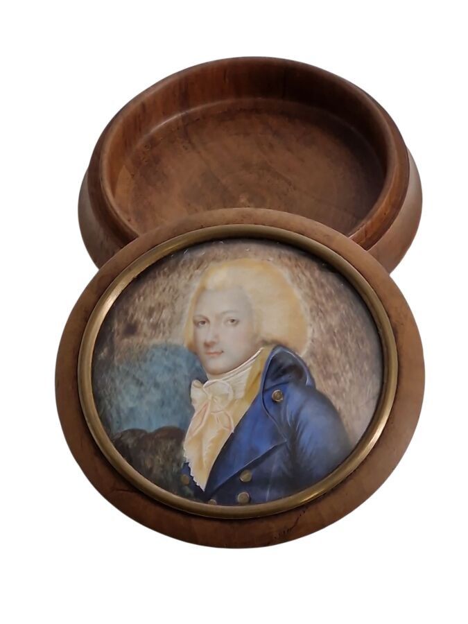 Wooden drageoir decorated with a portrait of a man with a blond wig in round miniature, Late 18th century