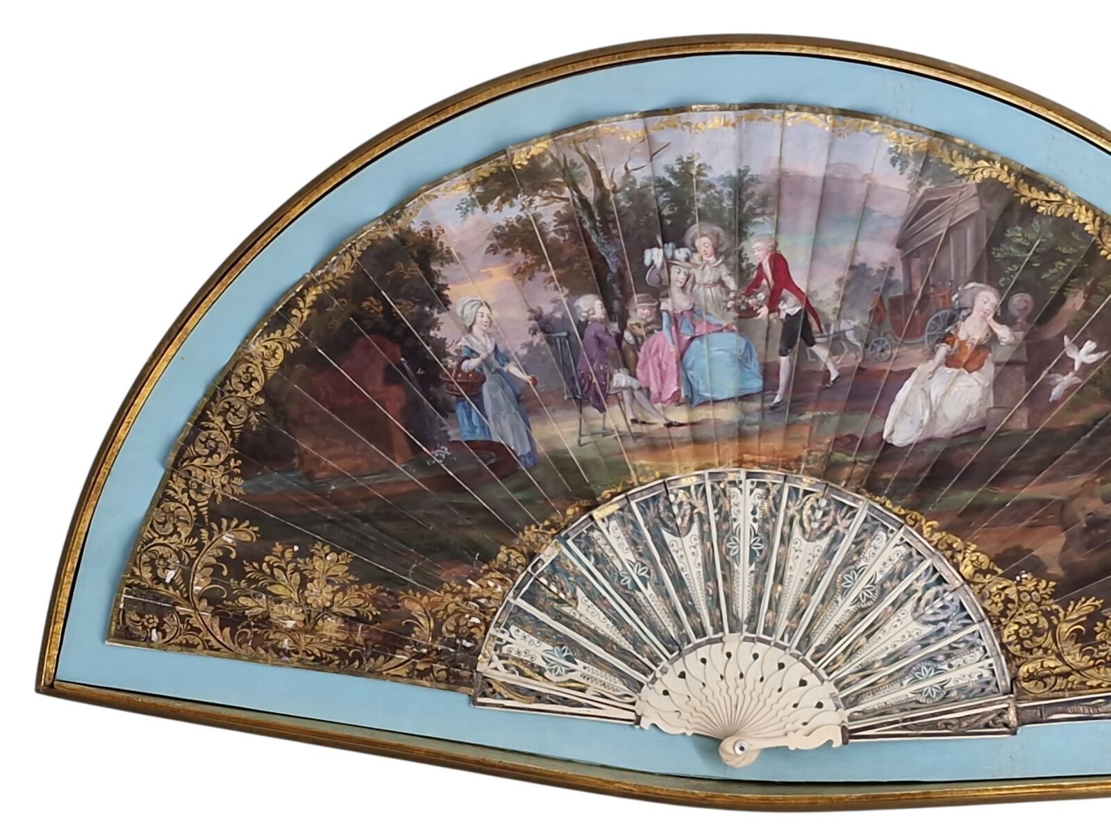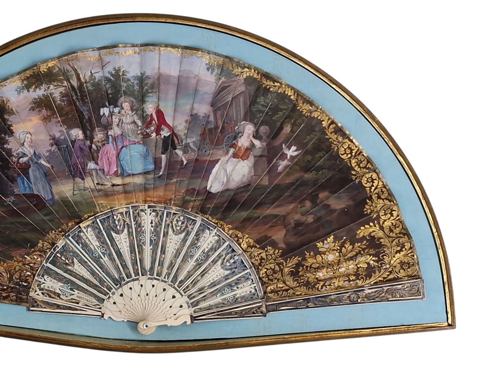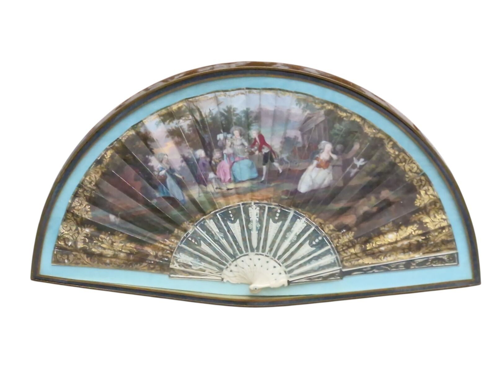 Gouache fan depicting a gallant scene.
