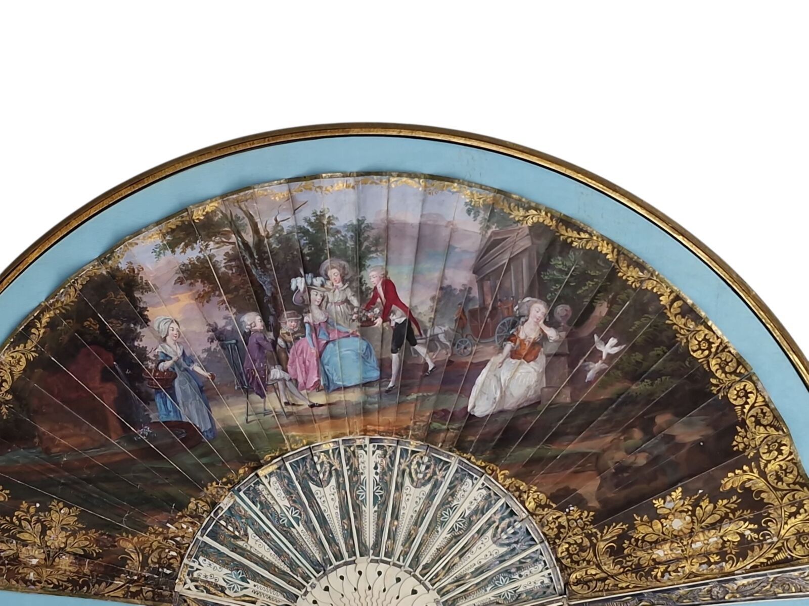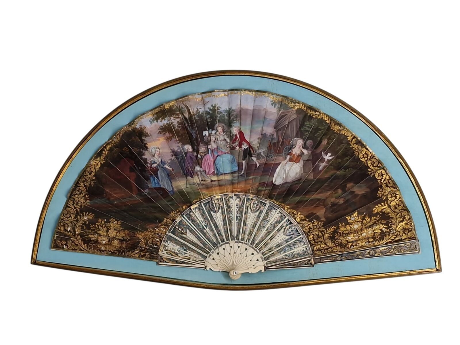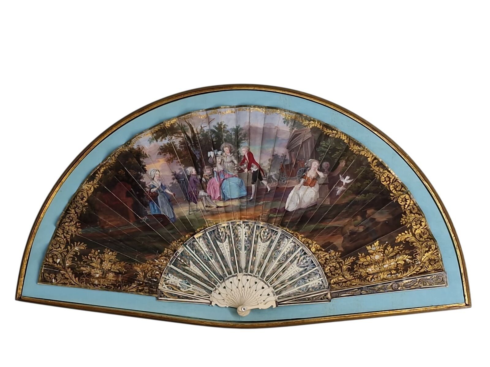 Gouache fan depicting a gallant scene. Bone frame with pierced decoration. 18th century, 31 x 56.5 cm