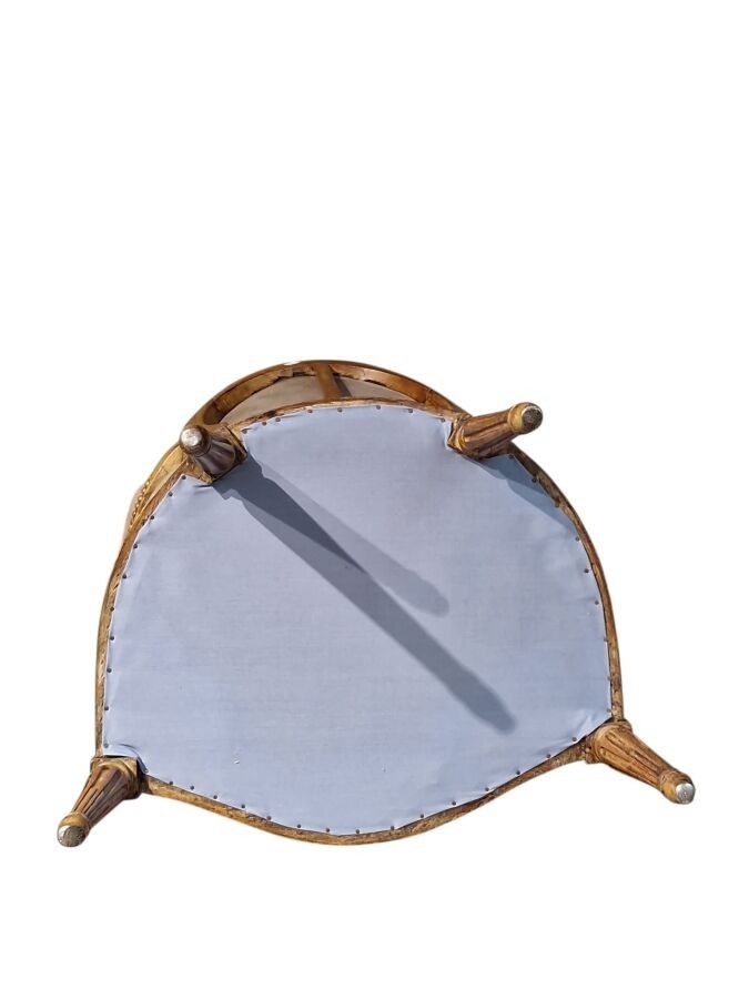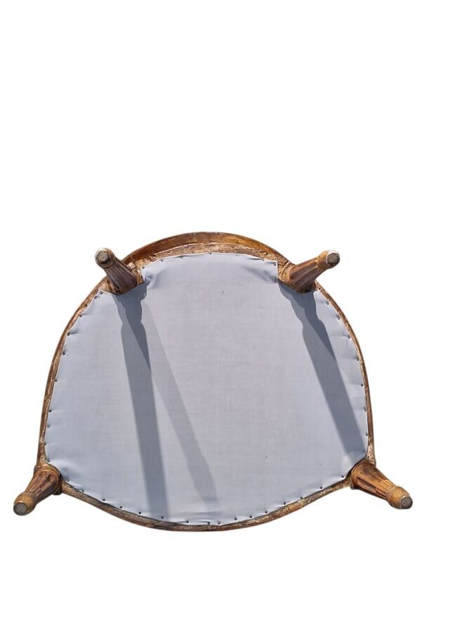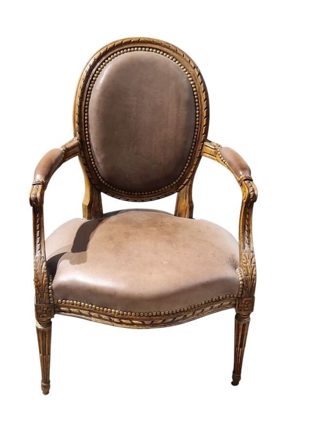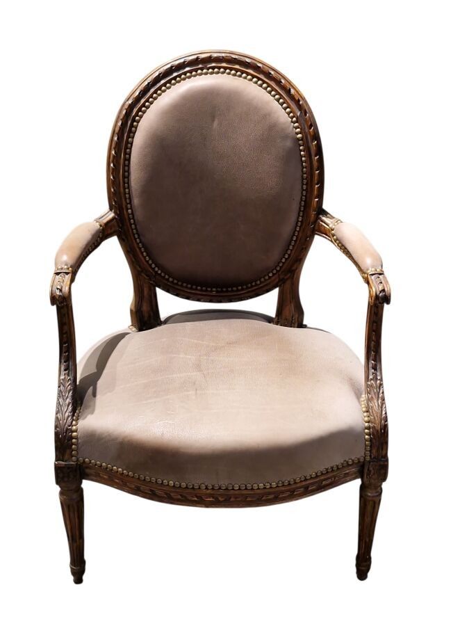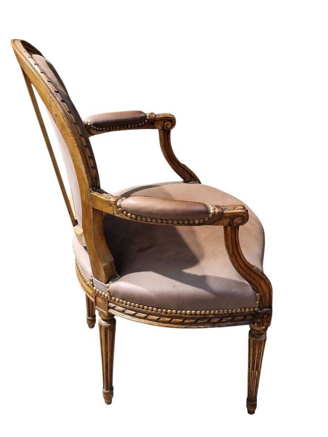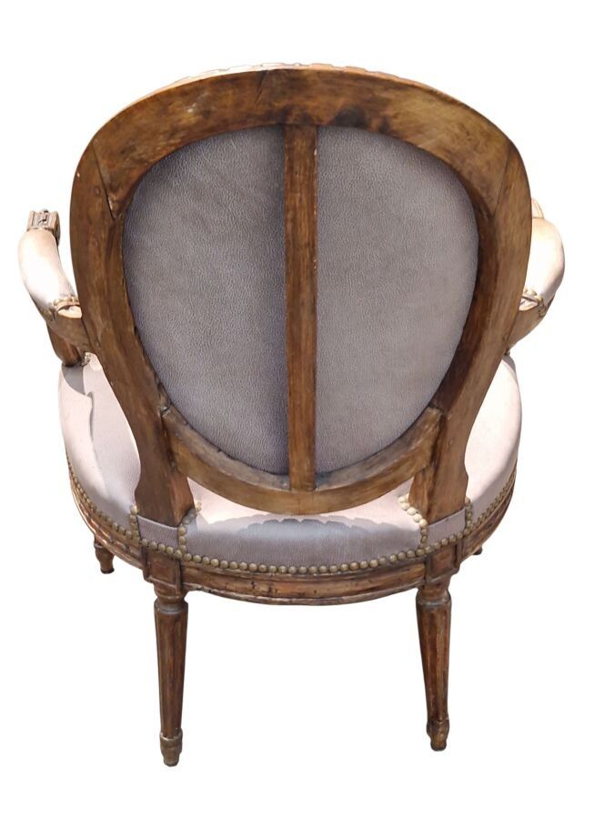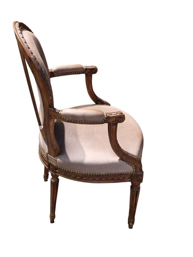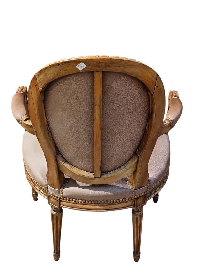 A pair of medallion-back armchairs in moulded veneered wood on fluted tapering legs. Louis XVI period, 88 x 58 x 50 cm