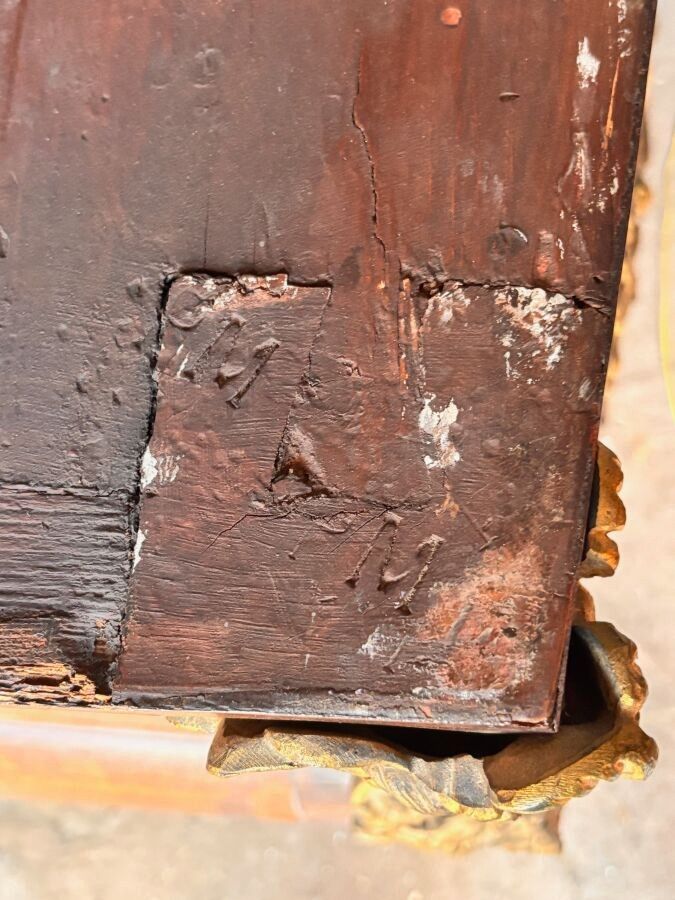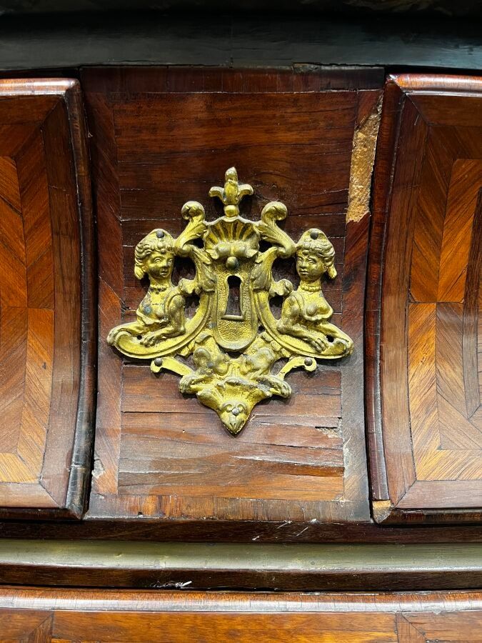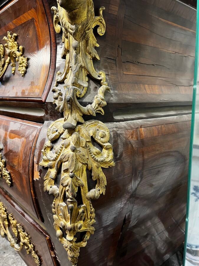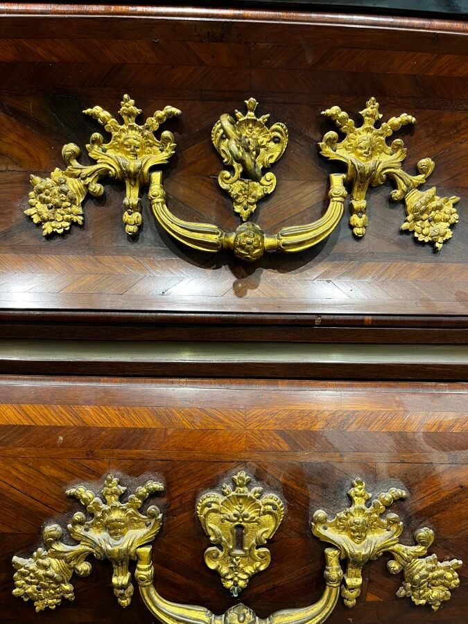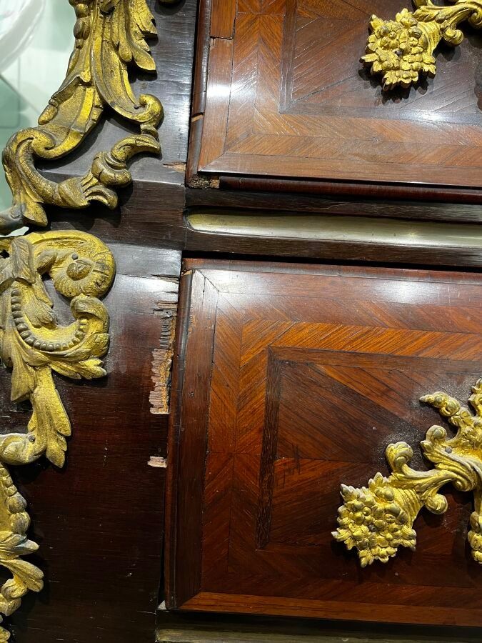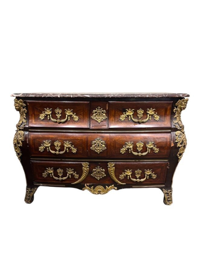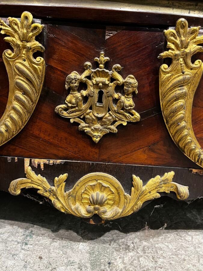 A violet wood veneered chest of drawers, opening to 4 drawers on 3 rows, richly decorated with chased bronzes and espagnolette. Royal brown and red breche marble top stamped Pierre MIGEON (1701-1758). Damage and missing parts. H 89 x W 130 x D 68 cm. Awarded the title of Master around 1725 (the registers dating from the beginning of the reign of Louis XV have not been preserved), he was one of the greatest cabinet-makers of the 18th century. He supplied his furniture to a rich aristocratic clientele that included the Duke of Orléans, son of the Regent, the Duchess of Rohan, the Marshal of Noailles, the Duchess of Epernon, the Cardinal of Rohan, several bishops and ambassadors from foreign nations. From the 1740s, he received commissions from the Garde-Meuble de la Couronne and the Menus-Plaisirs. He benefited from the protection of the Marquise de Pompadour, whose prodigality towards him is recalled by d'Argenson in his memoirs.