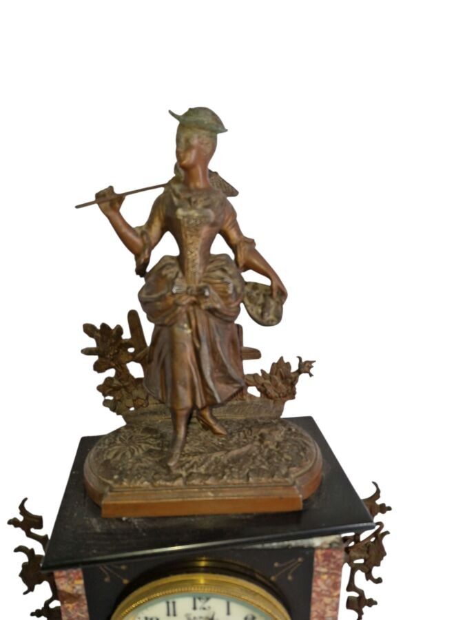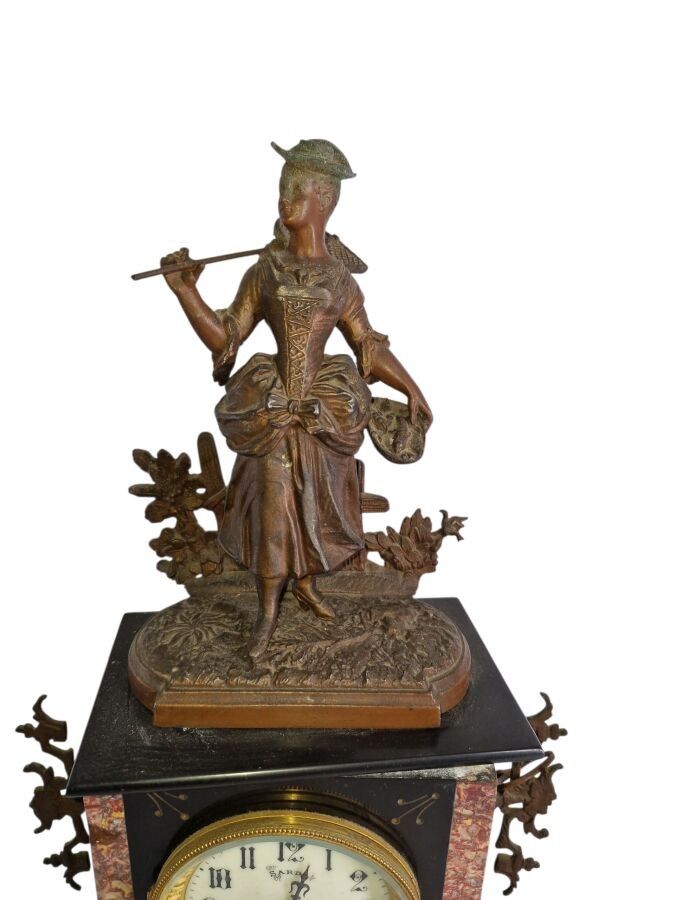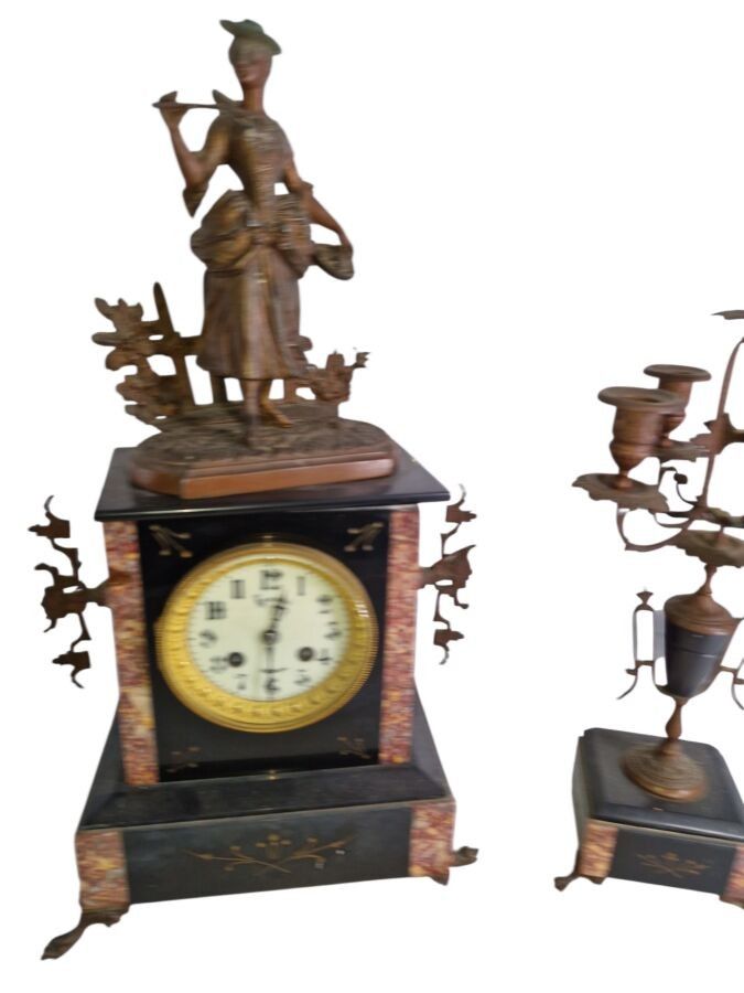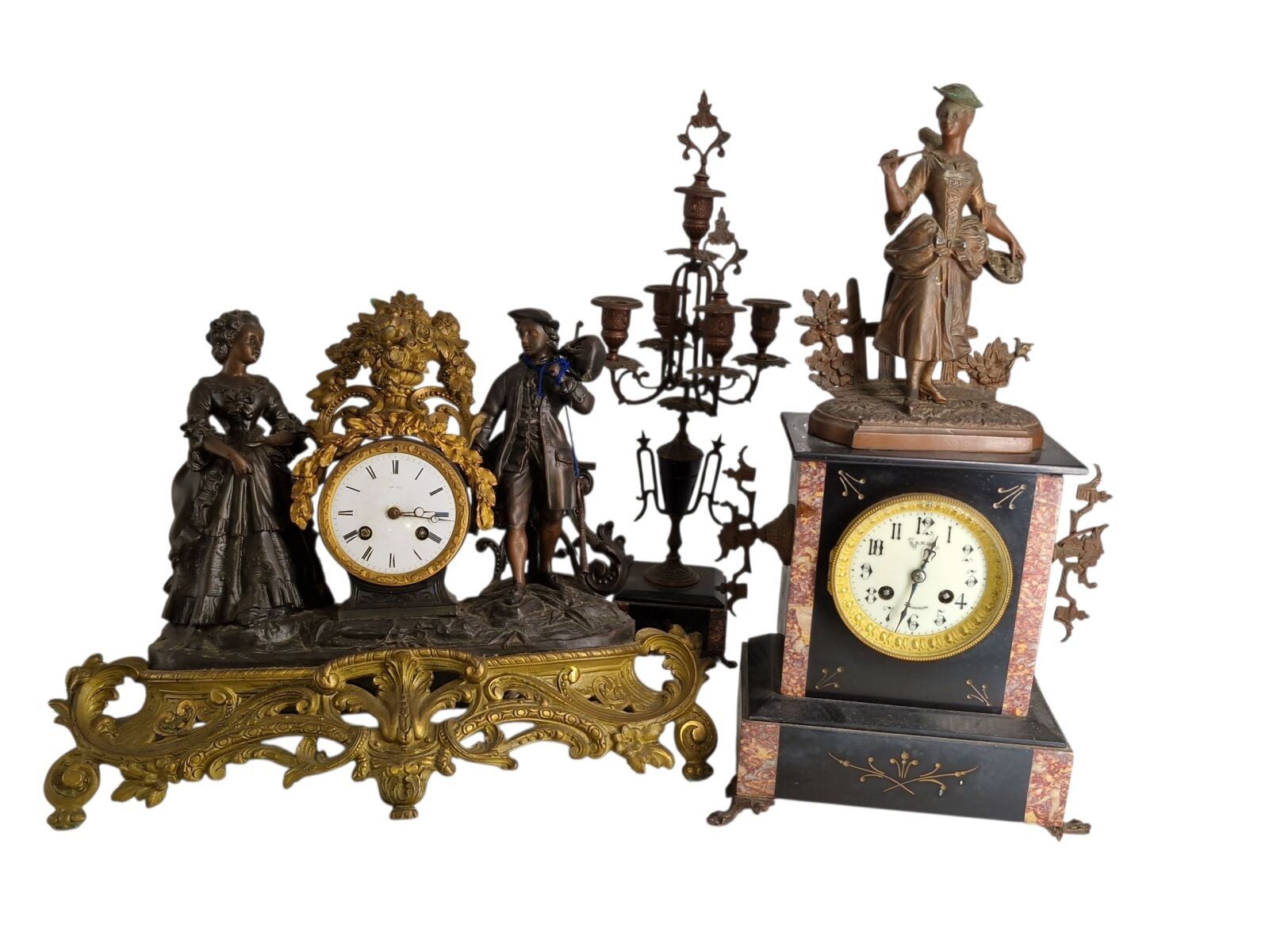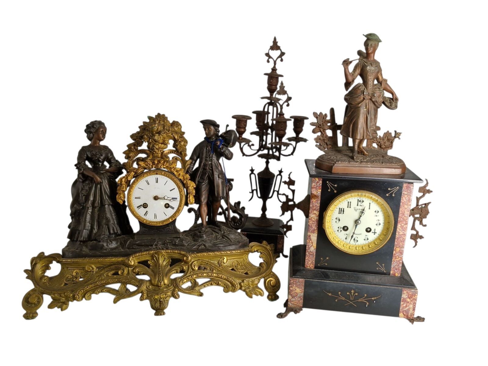 Mantelpiece with a patinated regule subject clock of a fisherwoman H: 48 cm and 1 pair of candelabra H: 47 cm one joinrt 1 accidented clock subject of a gallant scene h: 37 cm