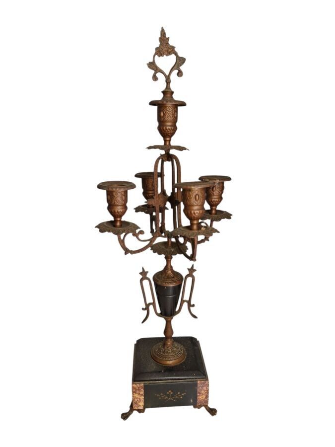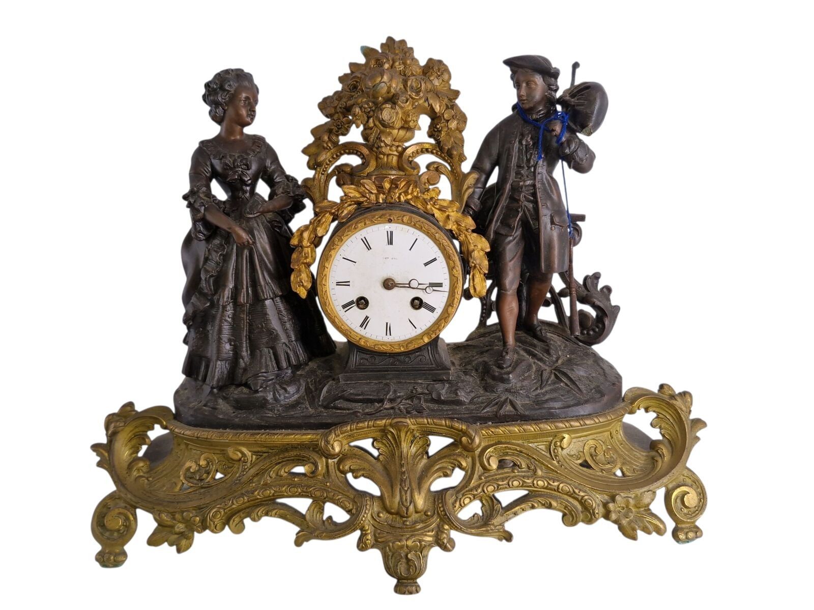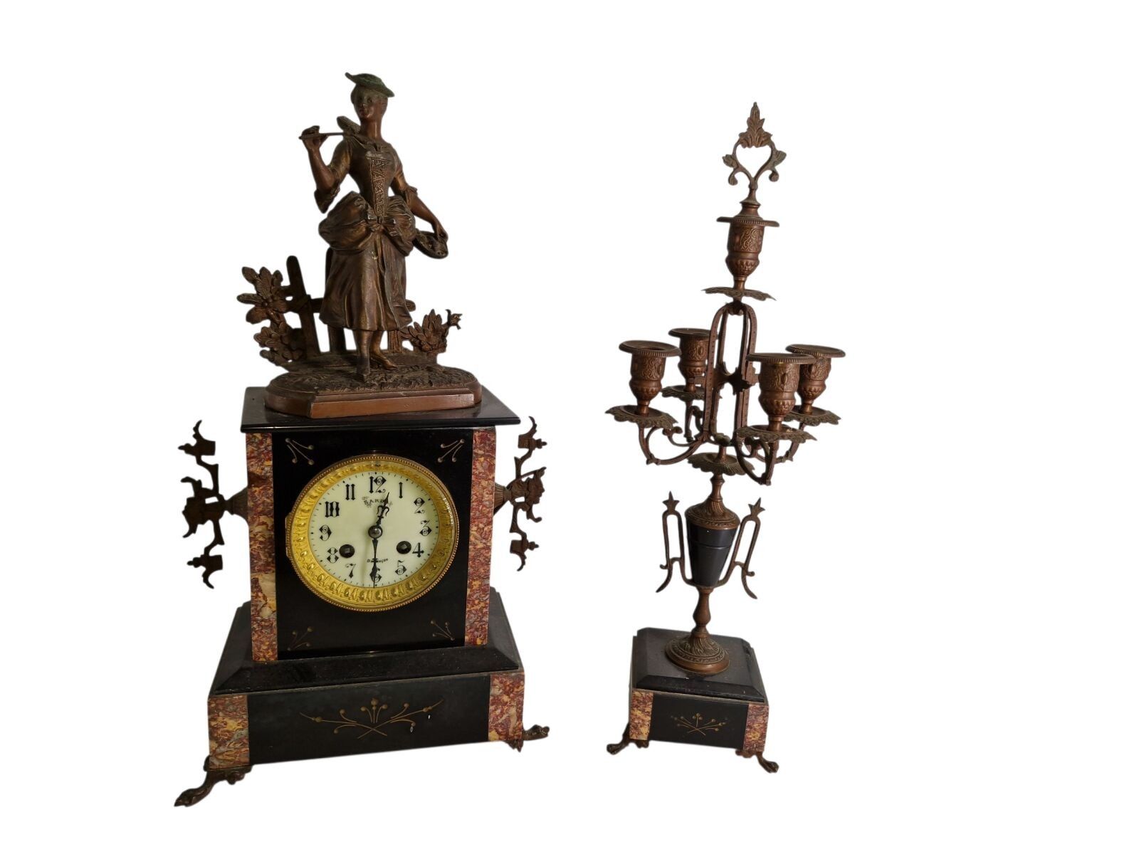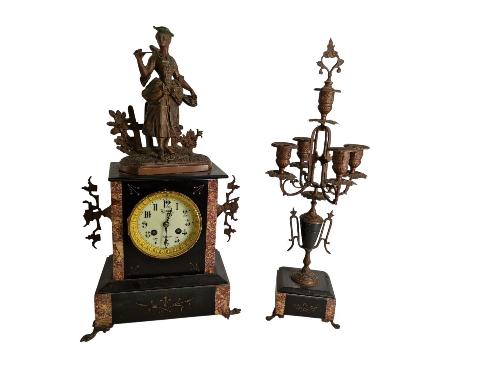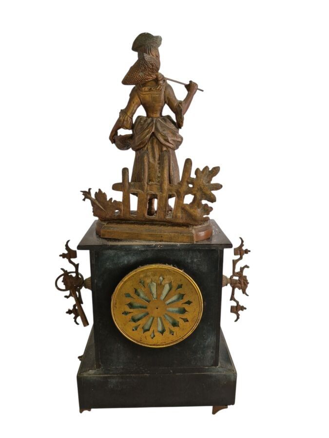 Mantelpiece with a patinated regule subject clock of a fisherwoman H: 48 cm and 1 pair of candelabra H: 47 cm one joinrt 1 accidented clock subject of a gallant scene h: 37 cm