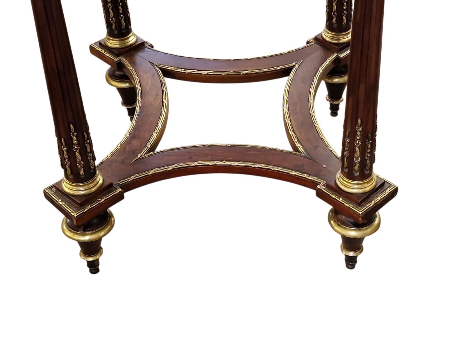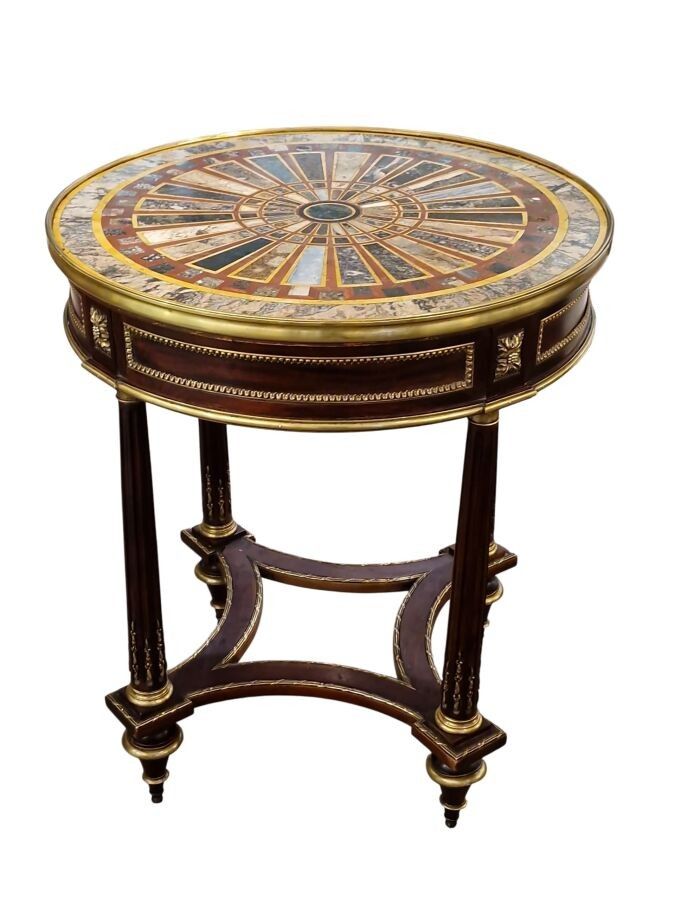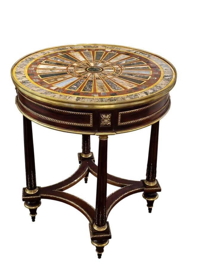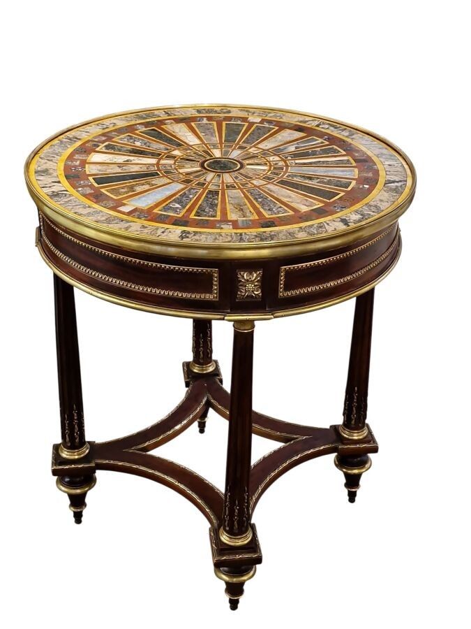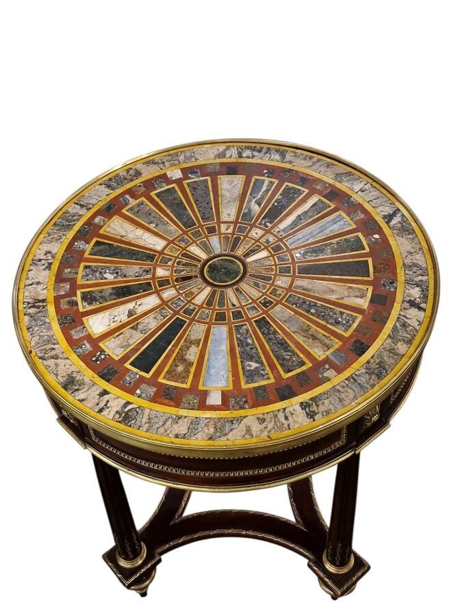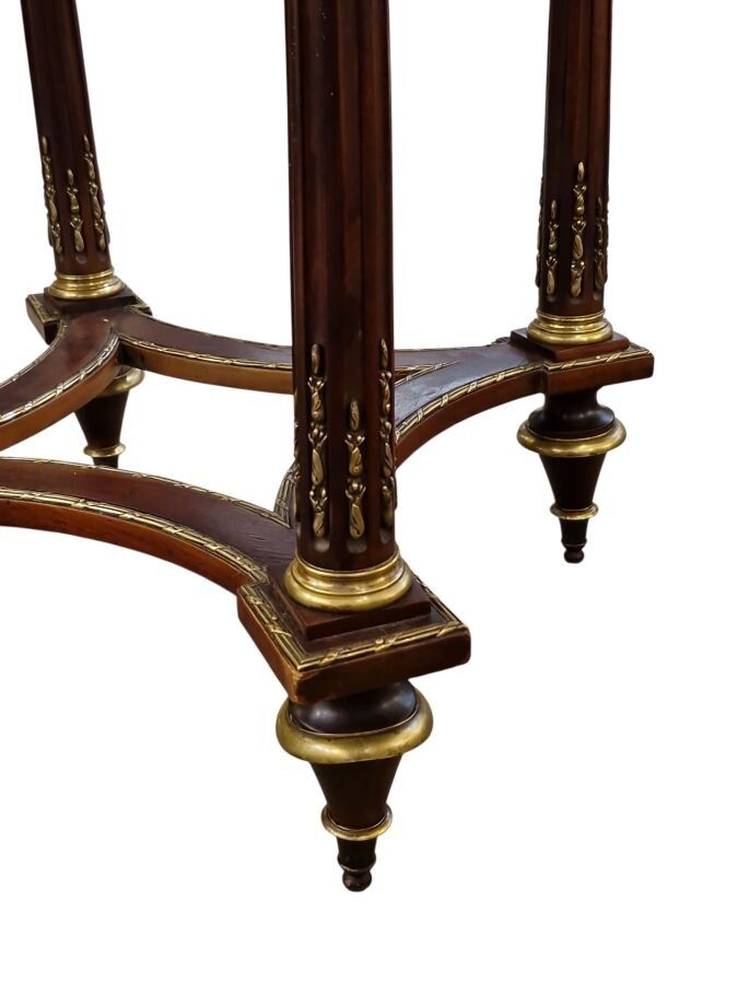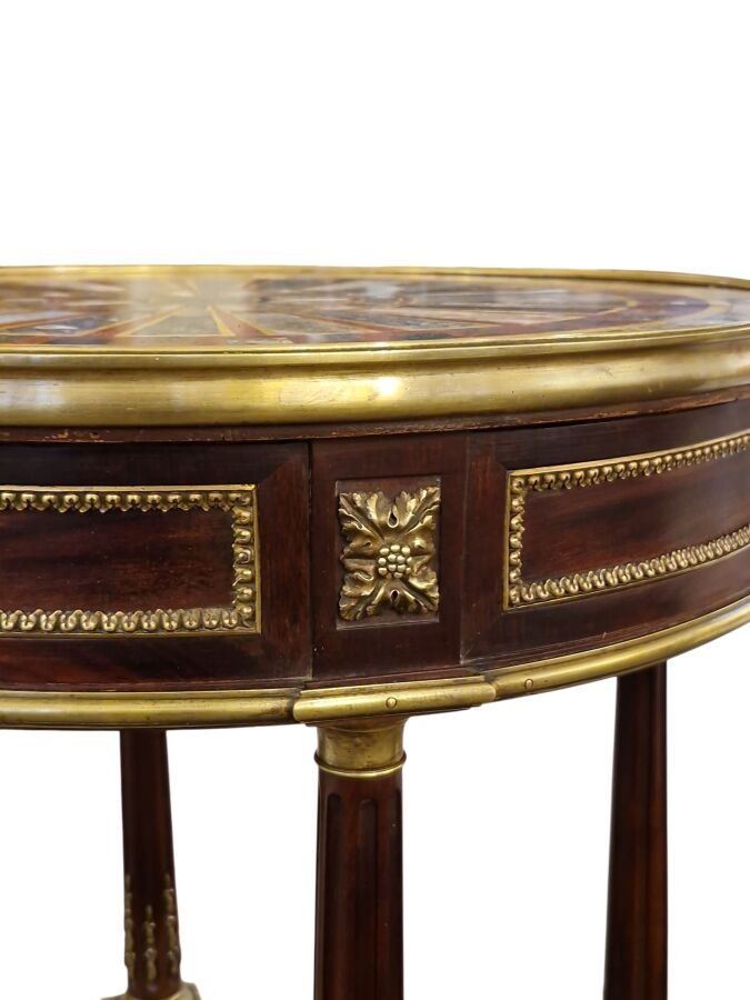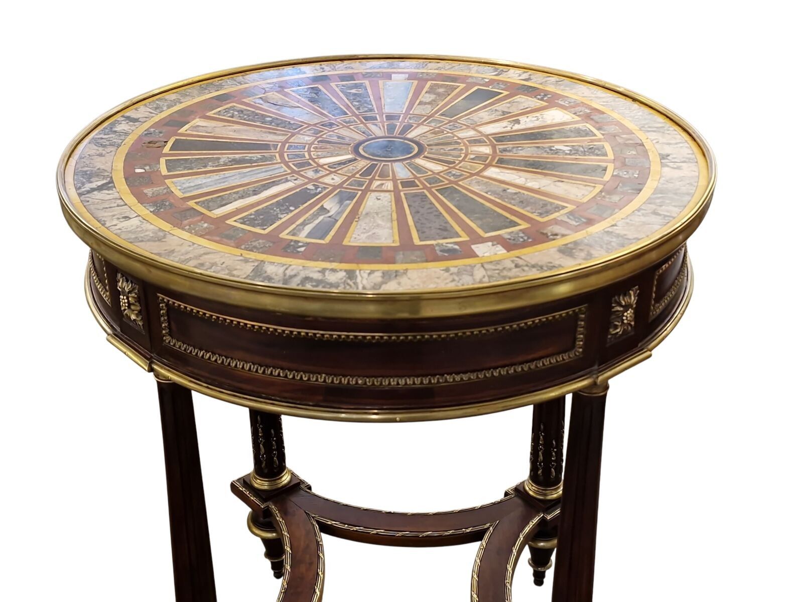 A mahogany veneered pedestal table with tapered fluted uprights joined by struts resting on toupie legs. Top decorated with coloured marble samples Louis XVI style 77 x 65 cm (missing legs)