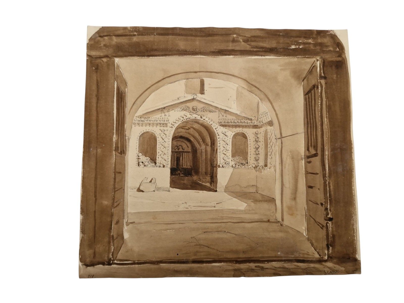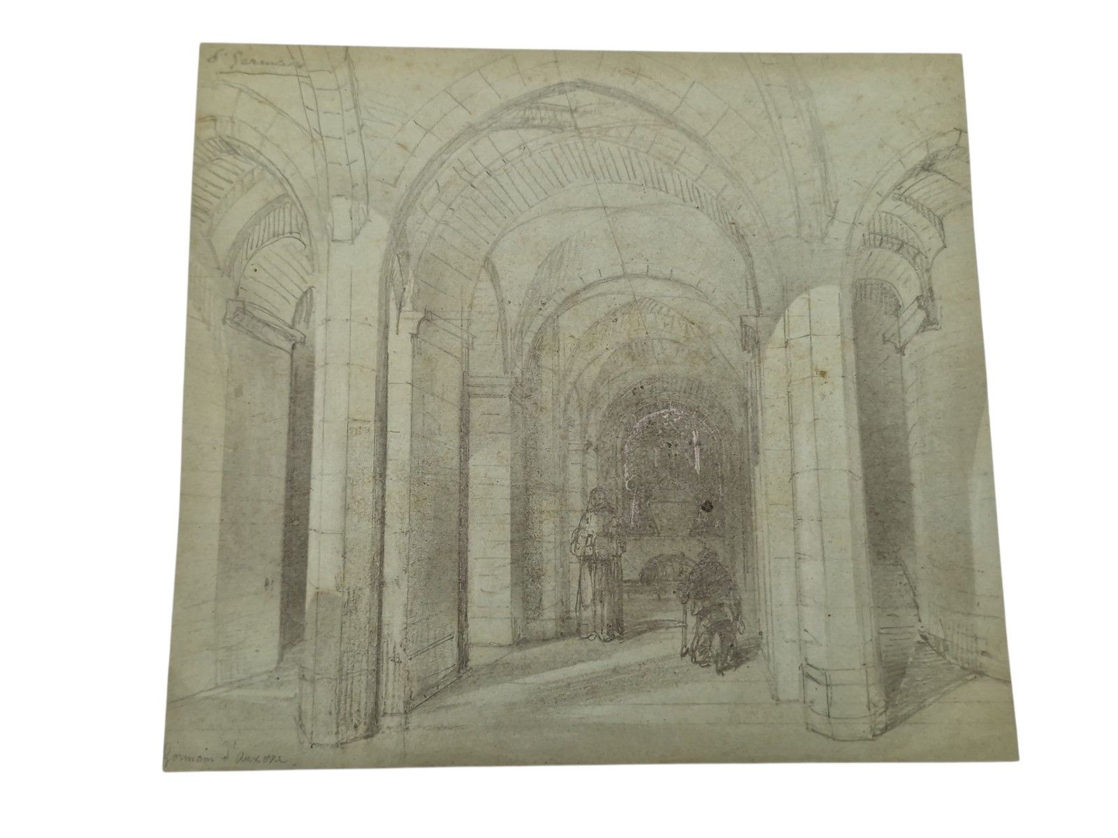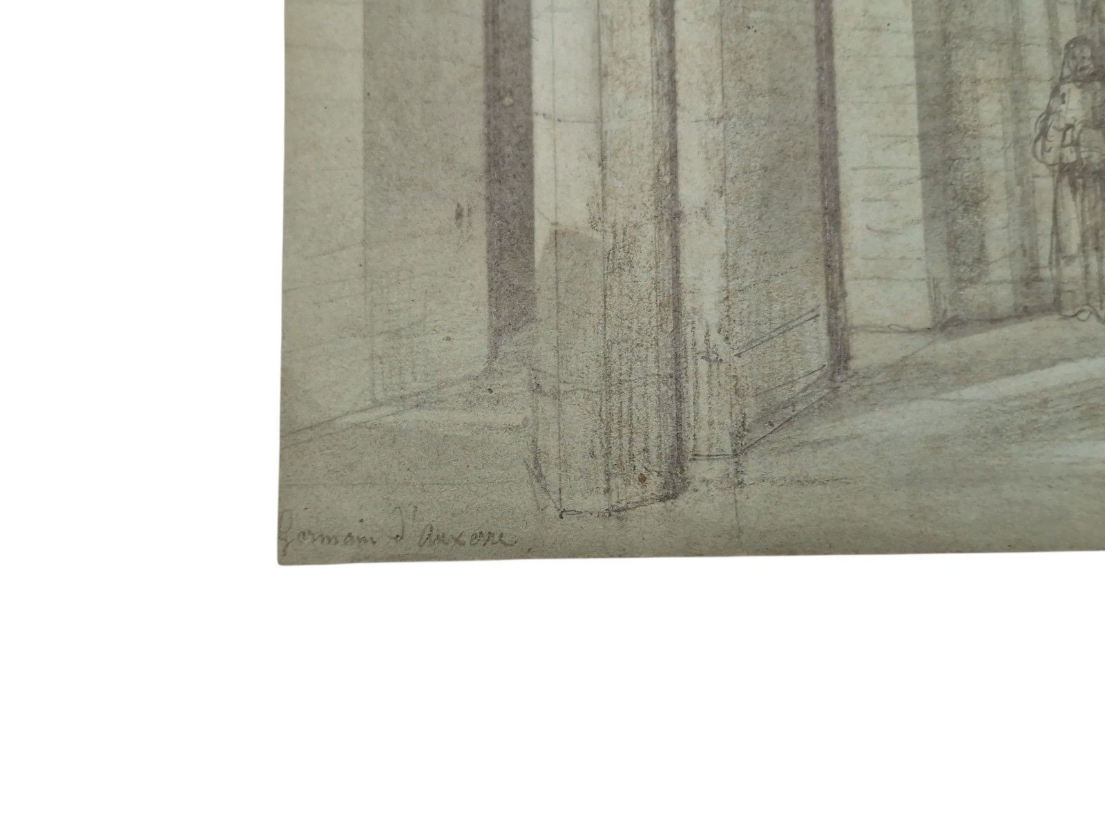 Attached is a study of a cloister with a monk and a villager in black stone and grey wash, attributed to Eugène Ciceri (1813 - 1890). Annotated lower left Germain d'Auxerre.