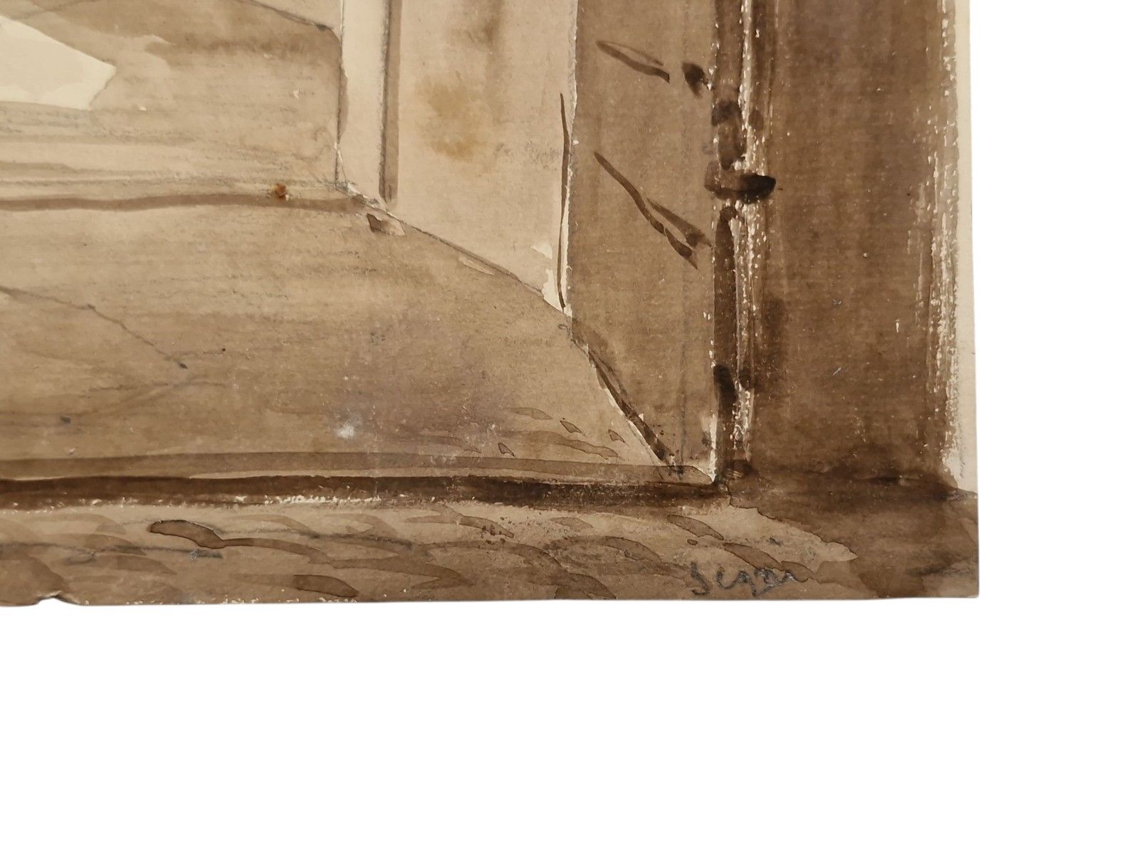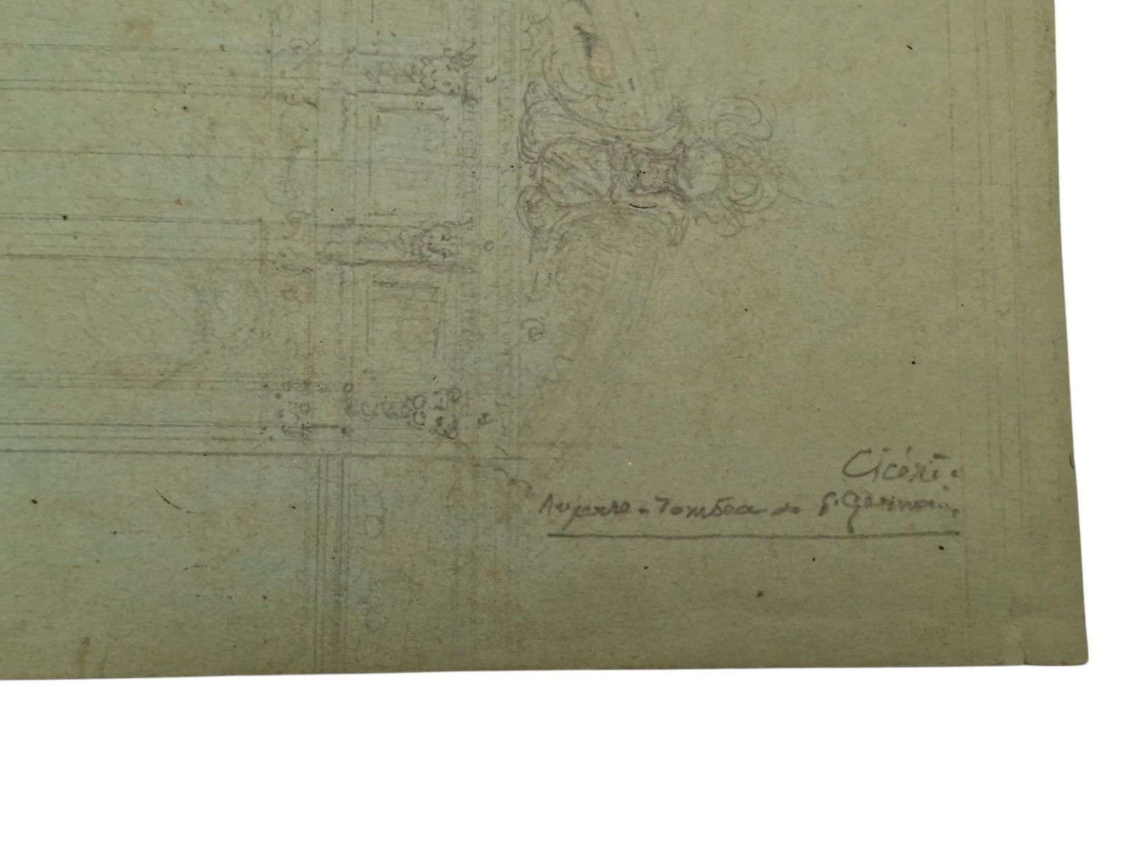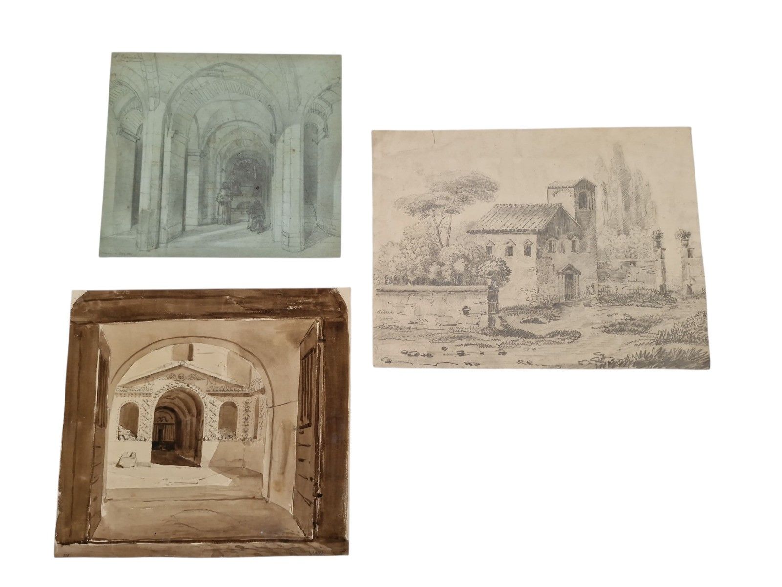 Attached is a study of a cloister with a monk and a villager in black stone and grey wash, attributed to Eugène Ciceri (1813 - 1890). Annotated lower left Germain d'Auxerre.