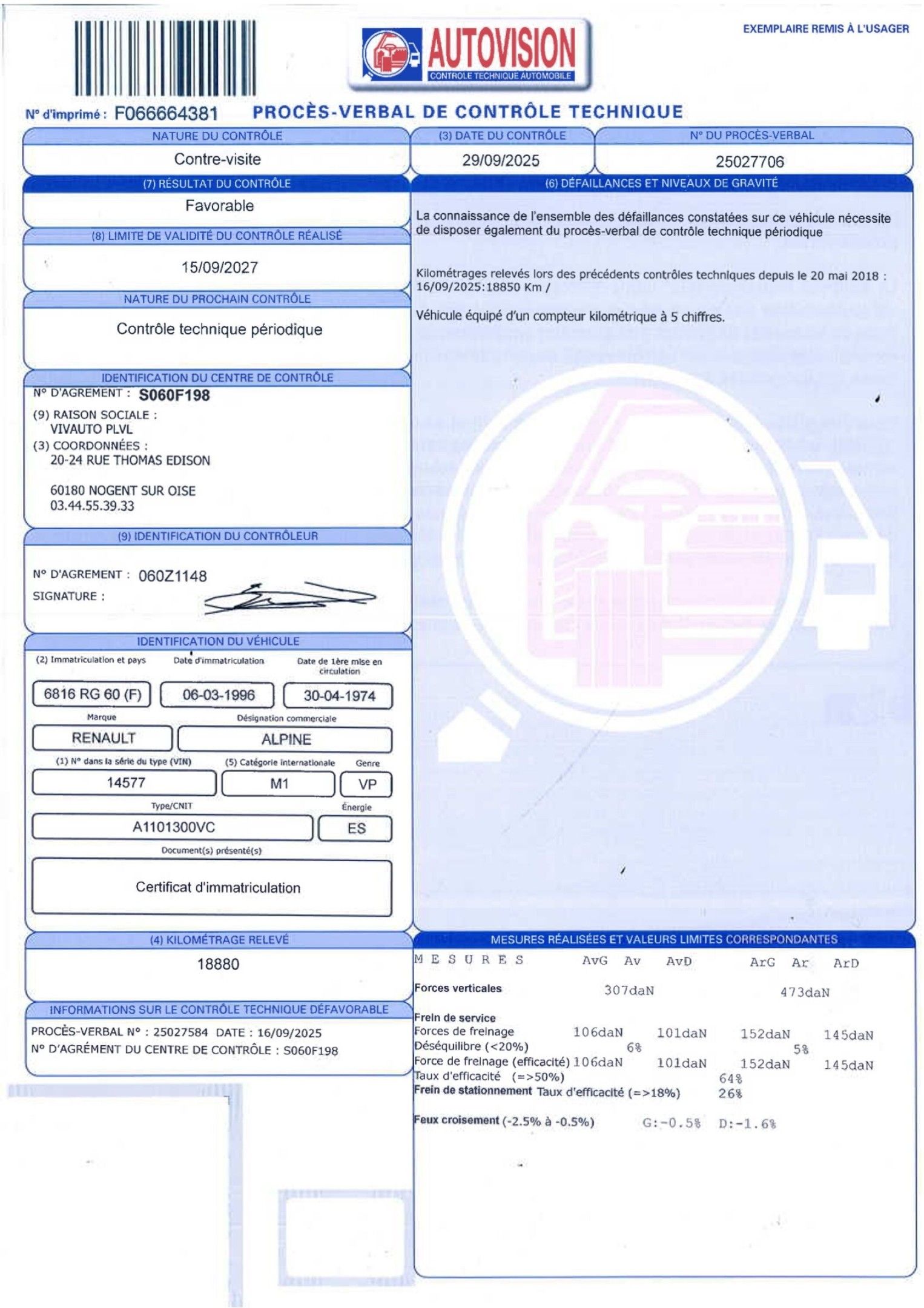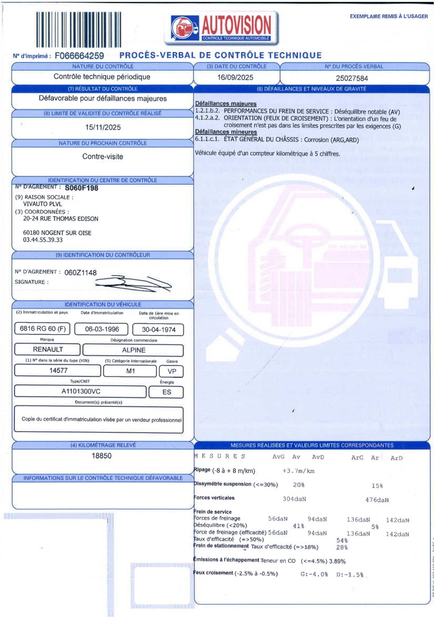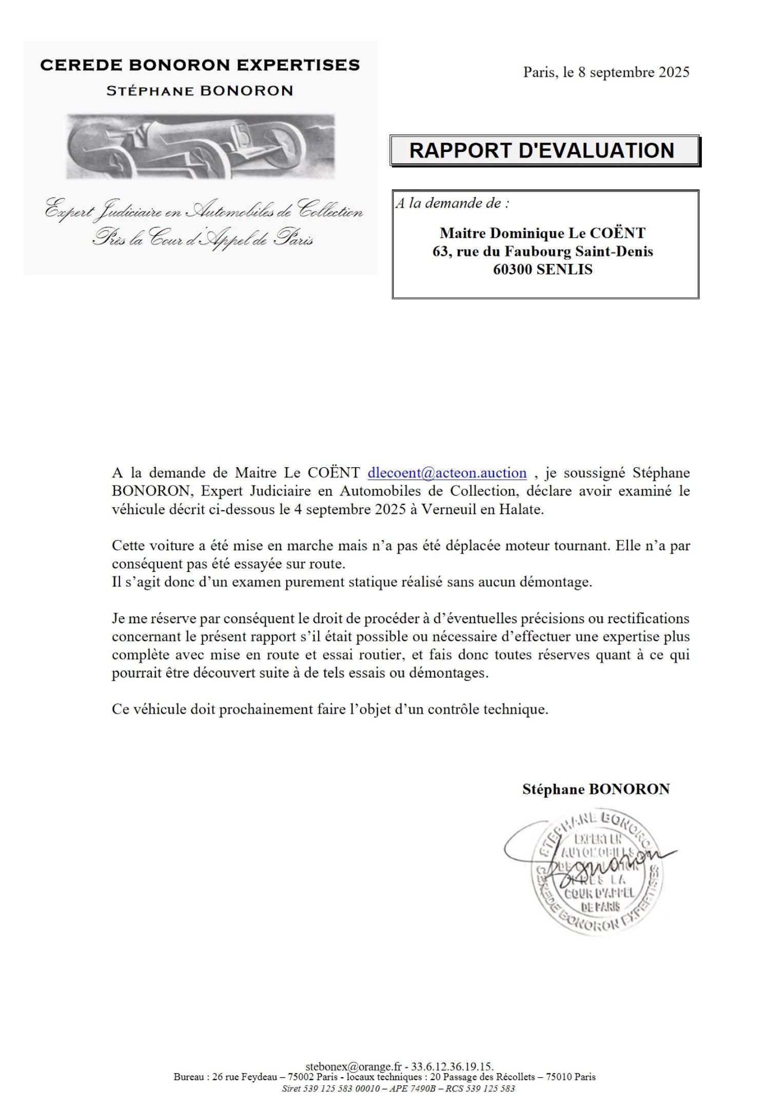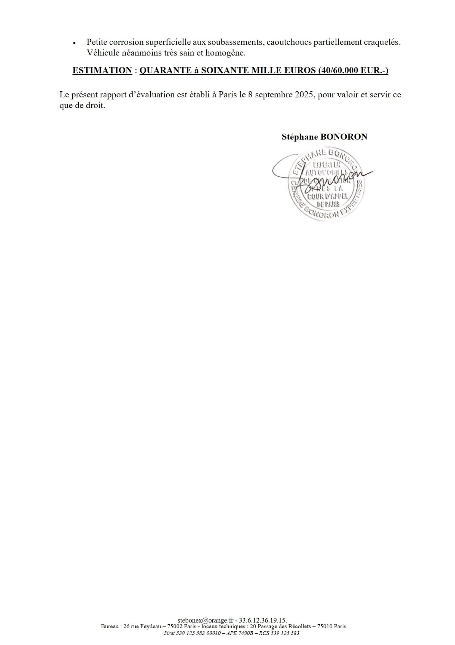 CONDITION: Very sound and homogeneous vehicle, in good general condition. See the attached file from the expert, Mr Stéphane BONORON dated 8/9/2025, the technical inspection dated 16/9/2025 and the favourable counter-inspection dated 29/09/2025. All maintenance invoices issued by the owner, dating back to December 1976, will be given to the purchaser.