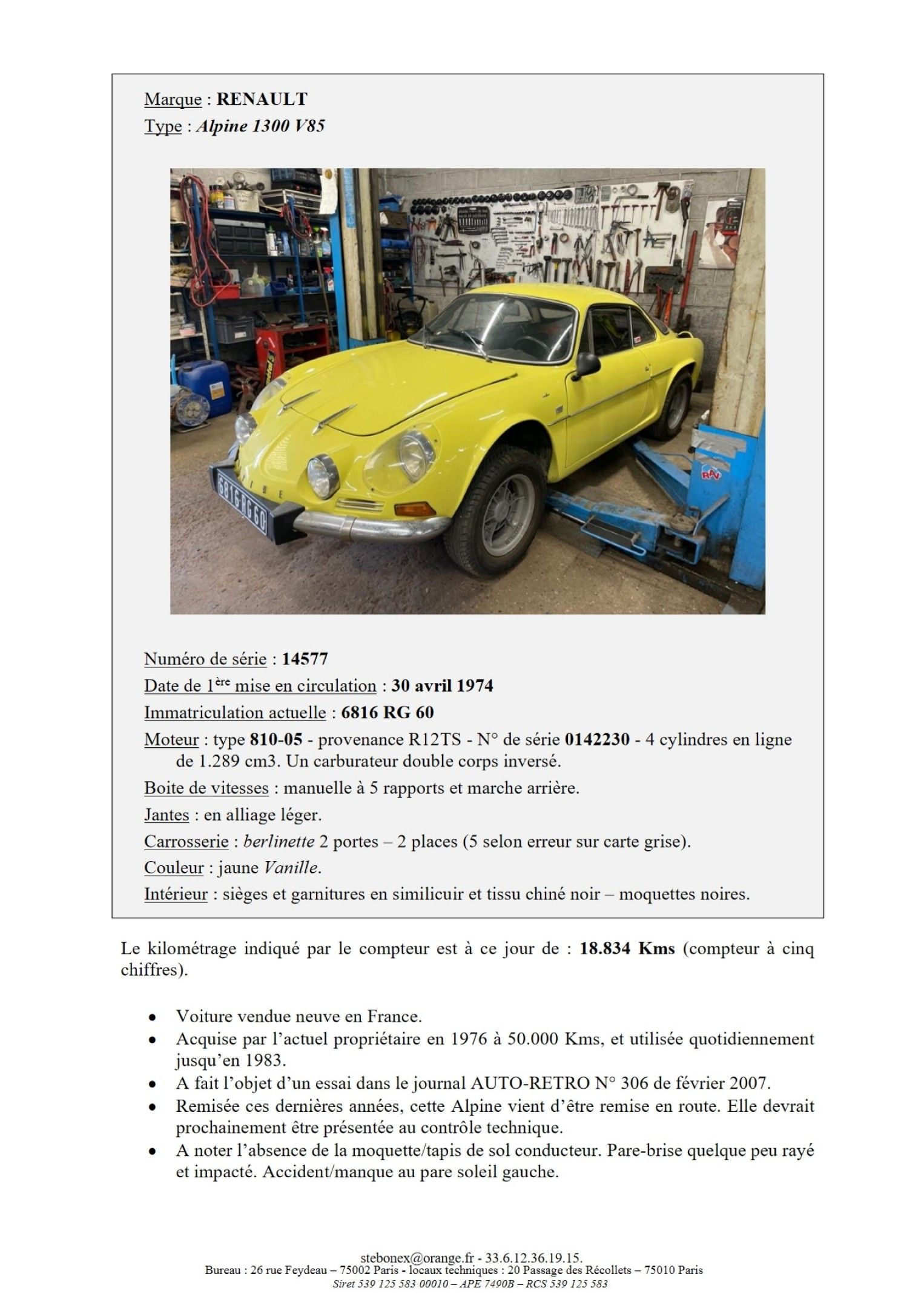 ALPINE A 110 1300 V85 RENAULT - Type: Passenger car - Body: CI - Energy: ES - Colour: YELLOW - Odometer reading: 18880 - 1st MOT: 30/04/1974 - Power: 7 - Mine type: A1101300VC - Seats: 5 - Remarks: EXPERT: Mr Stéphane BONORON, legal expert in classic cars for the Paris Court of Appeal - [email protected] - Tel. +33 (0)6 12 36 19 15