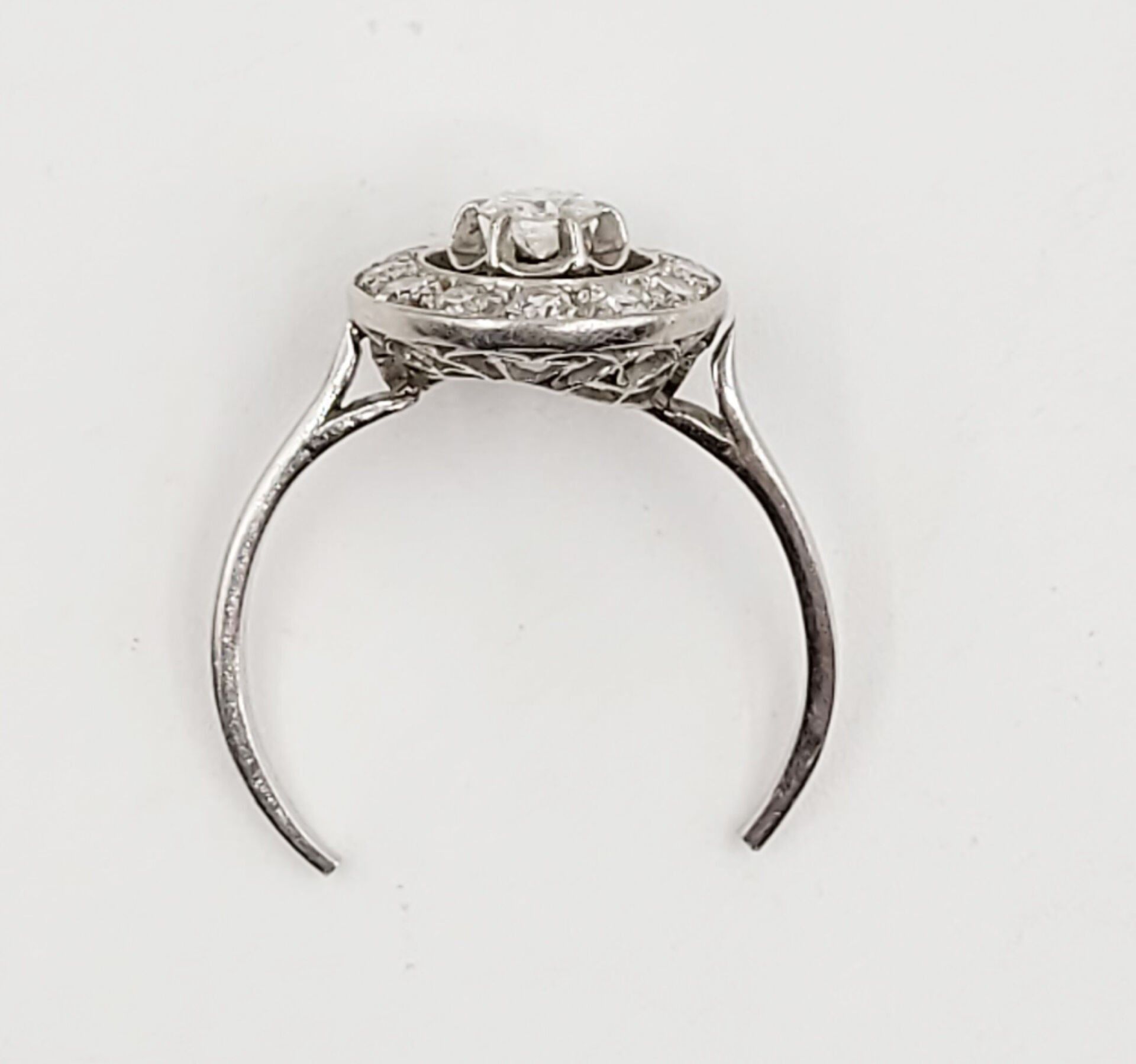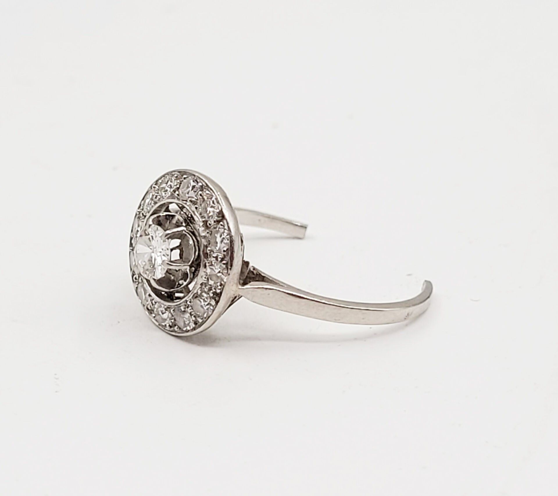Art Deco platinum 850‰ ring set with a central diamond weighing approximately 0.3 carats in a brilliant surround.