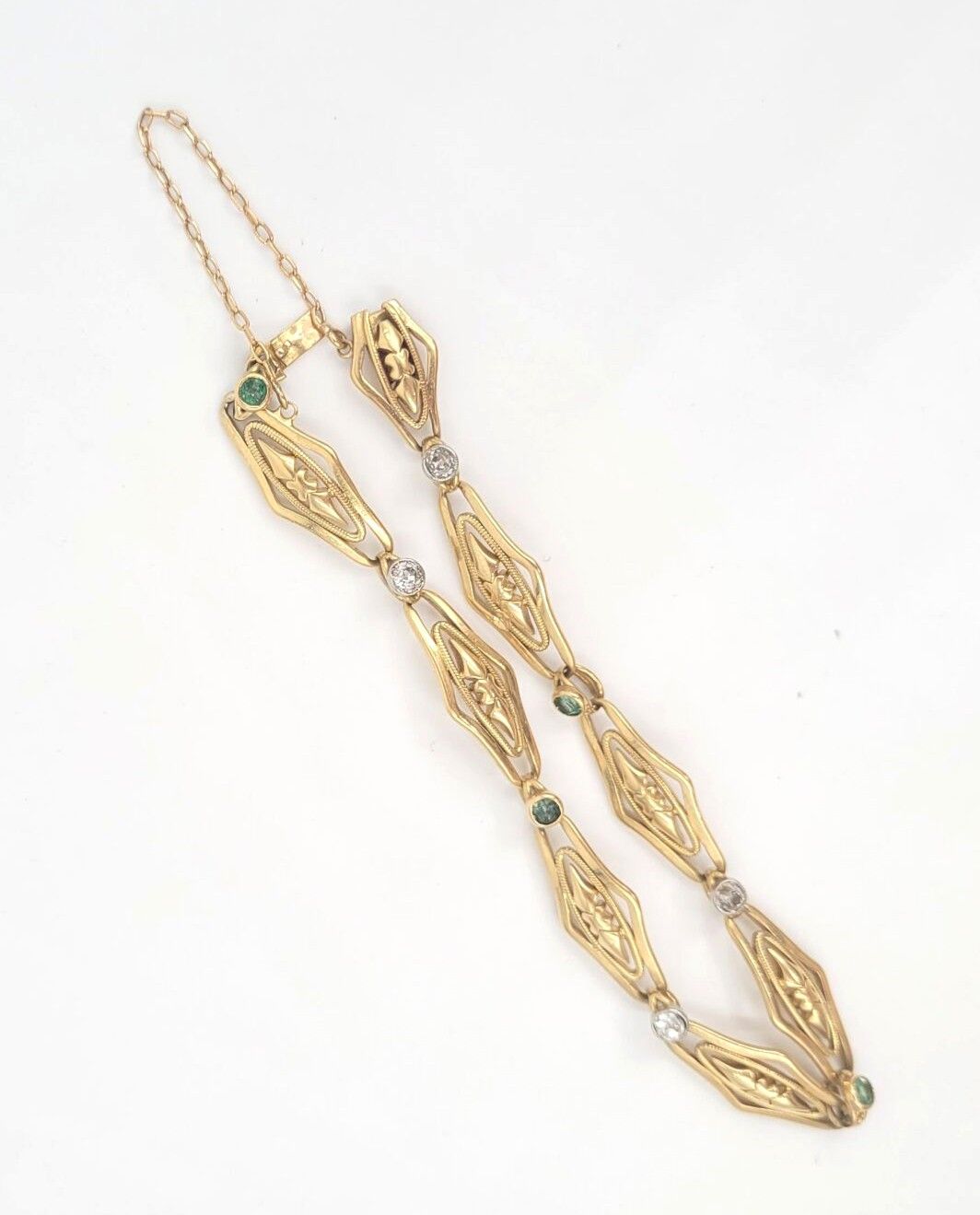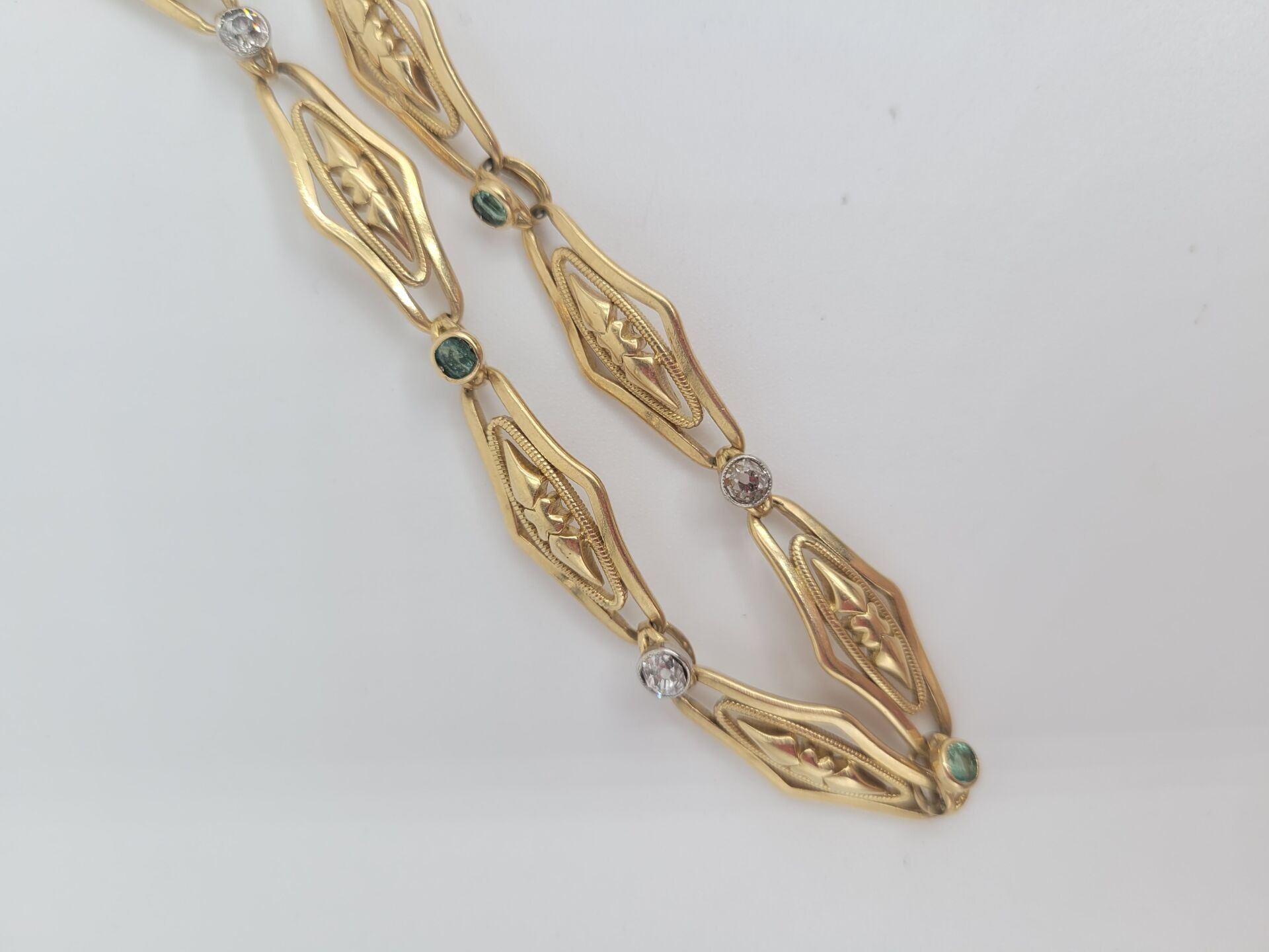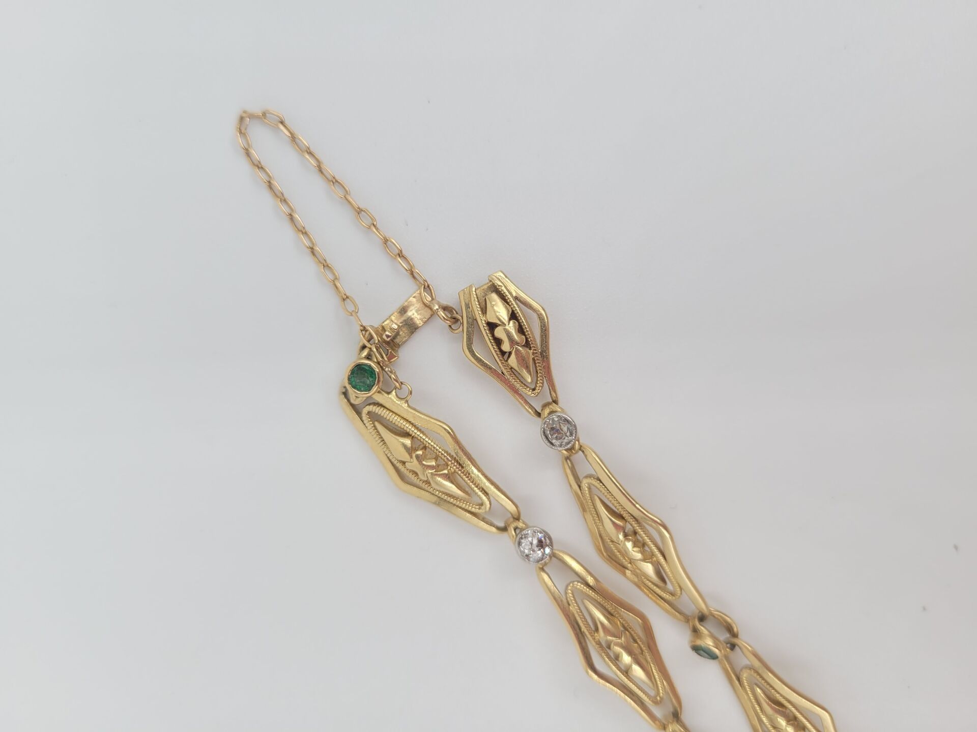 BRACELET in yellow gold 750‰ openwork navette mesh adorned with 3 diamonds and green stones. With safety chain.