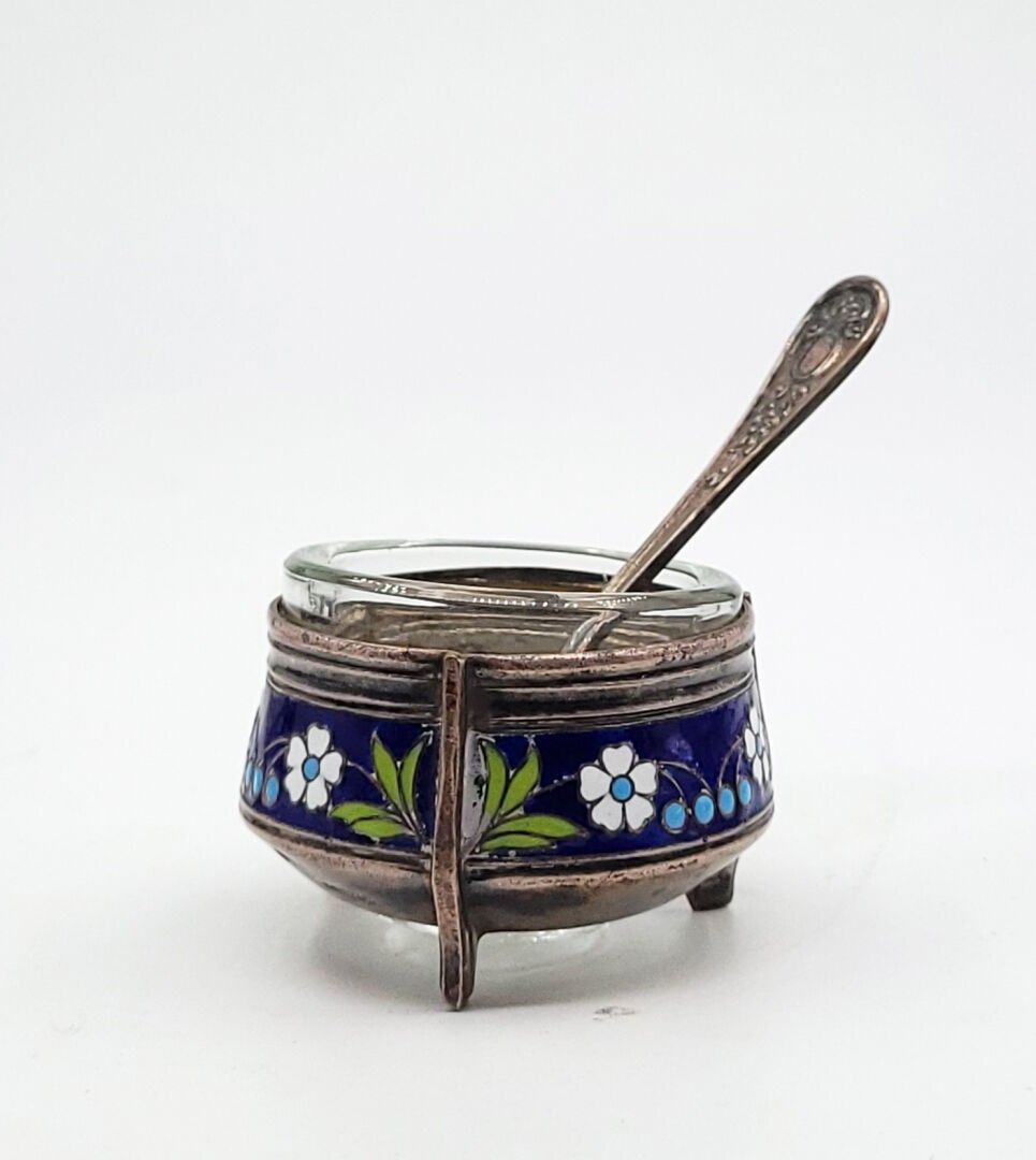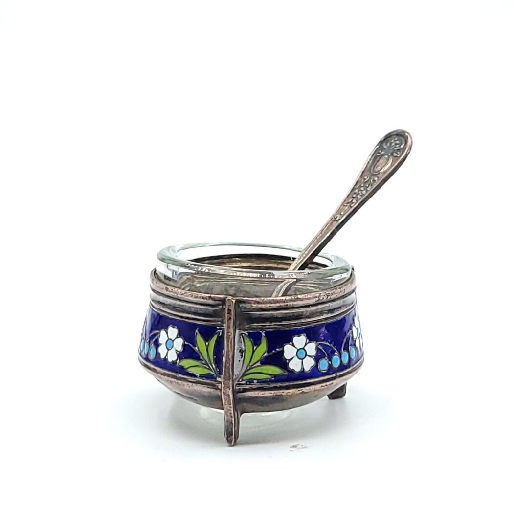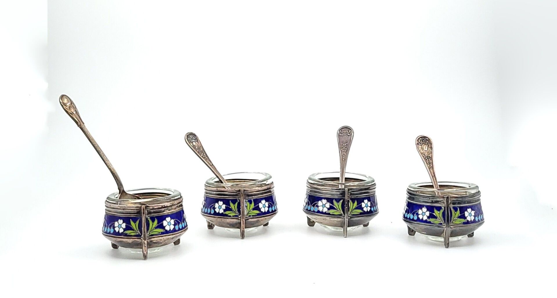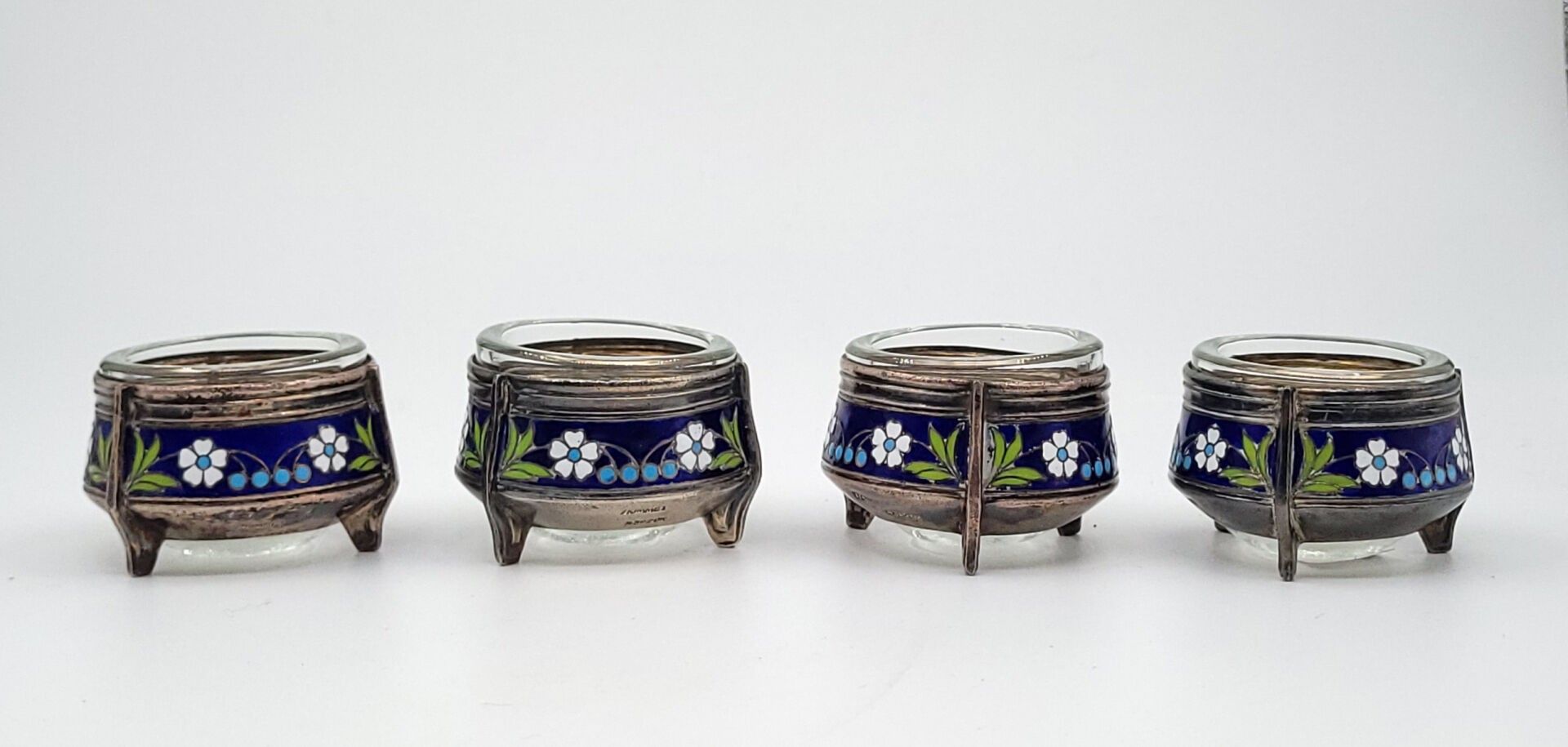 Suite of 4 Russian silver and enamel SALERONS with floral decoration.