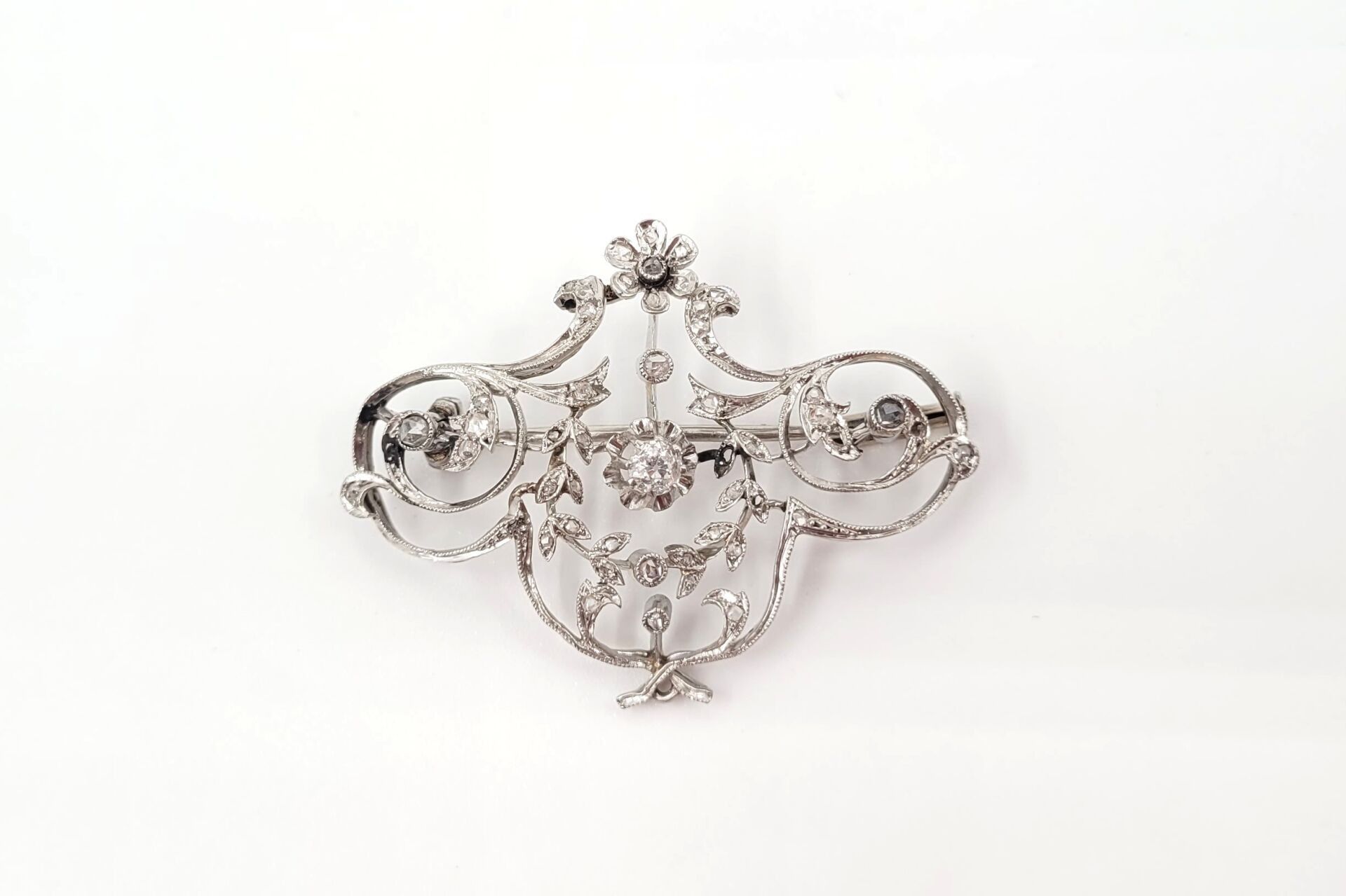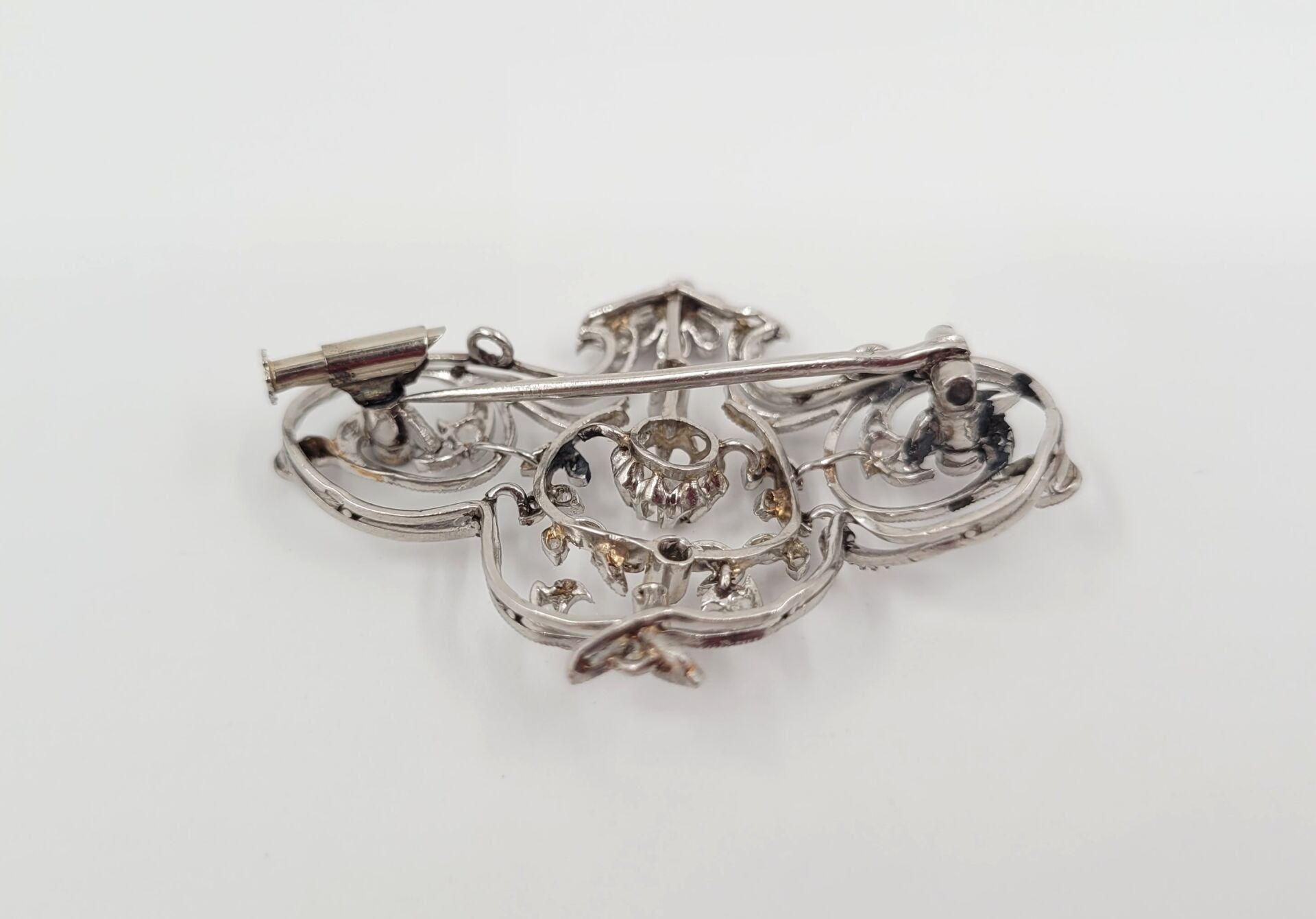A 750‰ white gold openwork foliage brooch centred with a diamond (approx. 0.15 carats)